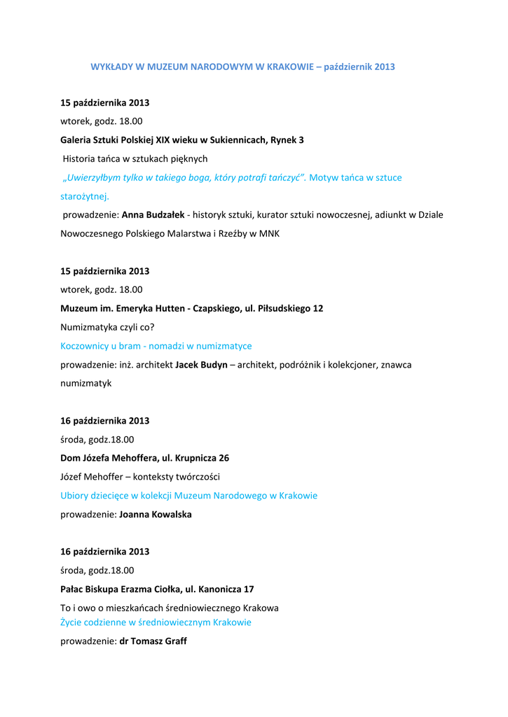 WYKŁADY W MUZEUM NARODOWYM W KRAKOWIE – październik 2013 15 października 2013 wtorek, godz. 18.00 Galeria Sztuki Polskiej XIX wieku w Sukiennicach, Rynek 3 Historia tańca w sztukach pięknych „Uwierzyłbym tylko w takiego boga, który potrafi tańczyć”. Motyw tańca w sztuce starożytnej. prowadzenie: Anna Budzałek - historyk sztuki, kurator sztuki nowoczesnej, adiunkt w Dziale Nowoczesnego Polskiego Malarstwa i Rzeźby w MNK 15 października 2013 wtorek, godz. 18.00 Muzeum im. Emeryka Hutten - Czapskiego, ul. Piłsudskiego 12 Numizmatyka czyli co? Koczownicy u bram - nomadzi w numizmatyce prowadzenie: inż. architekt Jacek Budyn – architekt, podróżnik i kolekcjoner, znawca numizmatyk 16 października 2013 środa, godz.18.00 Dom Józefa Mehoffera, ul. Krupnicza 26 Józef Mehoffer – konteksty twórczości Ubiory dziecięce w kolekcji Muzeum Narodowego w Krakowie prowadzenie: Joanna Kowalska 16 października 2013 środa, godz.18.00 Pałac Biskupa Erazma Ciołka, ul. Kanonicza 17 To i owo o mieszkańcach średniowiecznego Krakowa Życie codzienne w średniowiecznym Krakowie prowadzenie: dr Tomasz Graff 17 października 2013 czwartek, godz. 18.00 Dom Jana Matejki, ul. Floriańska 41 Czwartki u Matejków Od Galerii i Zbiorów do Muzeum – rzecz o Muzeum Akademii Sztuk Pięknych im. Jana Matejki w Krakowie prowadzenie: Małgorzata Sokołowska, Magdalena Szymańska 20 października 2013 niedziela, godz. 12.00 Muzeum Książąt Czartoryskich. Galeria Sztuki Starożytnej, ul. Pijarska 8 Muzealne ABECADO „W” jak wojna; prowadzenie: Paulina Chełmecka 21 października 2013 poniedziałek, godz. 18.00 Gmach Główny, al. 3 Maja 1 Sala audiowizualna Budując nowoczesność. Adolf Szyszko-Bohusz prowadzenie: dr Michał Wiśniewski 23 października 2013 środa, godz. 18.00 Gmach Główny, al. 3 Maja 1 Sala audiowizualna Akademia Bronioznawcy Sukashitsuba – świat japońskiego ażuru prowadzenie: Michał Dziewulski 24 października 2013 czwartek, godz. 18.00 Gmach Główny, al. 3 Maja 1 Sala audiowizualna W kręgu sztuki Imperium Osmańskiego Zrozumieć sztukę islamu. Wstęp do rozważań nad sztuką turecką prowadzenie: Ewa Marcinkowska 27 października 2013 niedziela, godz. 12.00 Galeria Sztuki Polskiej XIX w Sukiennicach, Rynek Gł. 3 Muzealne ABECADO „D” jak duch romantyczny; prowadzenie: Paulina Błaszczykiewicz 29 października 2013 wtorek, godz. 18.00 Muzeum Karola Szymanowskiego w willi „Atma” w Zakopanem, oddział Muzeum Narodowego w Krakowie, ul. Kasprusie 19, Zakopane Wokół Atmy Karol Szymanowski. W żywiole dźwięku i słowa prowadzenie: dr Małgorzata Janicka-Słysz 29 października 2013 wtorek, godz. 18.00 Galeria Polskiej Sztuki XIX wieku w Sukiennicach, Rynek 3 Sala Siemiradzkiego Matejko - mistrz rysunku Wspomnienia podróży na rysunkach Jana Matejki prowadzenie: dr Barbara Ciciora 29 października 2013 wtorek, godz. 18.00 Gmach Główny, al. 3 Maja 1 Sala audiowizualna Twarze polskiej sztuki XX Henryk Kunzek prowadzenie: Agata Małodobry