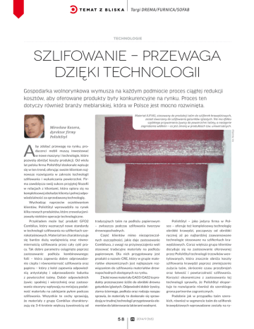 t e m at z b l i s k a Targi DREMA/FURNICA/SOFAB technologie Szlifowanie – przewaga dzięki technologii Gospodarka wolnorynkowa wymusza na każdym podmiocie proces ciągłej redukcji kosztów, aby oferowane produkty były konkurencyjne na rynku. Proces ten dotyczy również branży meblarskiej, która w Polsce jest mocno rozwinięta. Materiał AJF461, stosowany do produkcji taśm do szlifierek krawędziowych, został stworzony do szlifowania gatunków iglastych. Nie ma efektu szybkiego przywierania żywicy do powierzchni taśmy, a następnie zagniatania włókien – co jest zmorą w produktach tzw. uniwersalnych. Fot. PolishStyl Mirosław Kozera, dyrektor firmy PolishStyl A by zdobyć przewagę na rynku, producenci mebli muszą inwestować w nowe maszyny i technologie, które pozwolą obniżyć koszty produkcji. Od wielu lat polska firma PolishStyl doskonale wpisuje się w ten trend, oferując swoim klientom najnowsze rozwiązania w zakresie technologii szlifowania i wykańczania powierzchni. Firma zawdzięcza swój sukces przyjętej filozofii w relacjach z klientami, która opiera się na kompleksowej obsłudze klienta i pełnej odpowiedzialności za sprzedawaną technologię. Wychodząc naprzeciw oczekiwaniom klientów, PolishStyl wprowadziła na rynek kilka nowych produktów, które zrewolucjonizowały niektóre operacje technologiczne. Przykładem może być produkt GFO2 Combilux, który wyznaczył nowe standardy w technologii szlifowania na szlifierkach szerokotaśmowych. Materiał ten charakteryzuje się bardzo dużą wydajnością oraz równomiernością szlifowania przez cały cykl pracy. Tak dobre parametry osiągnięto poprzez zastosowanie podłoża kombinowanego: folii – która zapewnia dobre odprowadzenie ciepła i równomierność szlifowania oraz papieru – który z kolei zapewnia odpowiednią antystatykę i odprowadzenie ładunku z powierzchni taśmy. Dobór odpowiednich żywic: spodniej i wierzchniej oraz zastosowanie stearyny wpływają na mniejszą podatność materiału na zaklejanie pyłem podczas szlifowania. Wszystkie te cechy sprawiają, że materiały z grupy Combilux charakteryzują się 3-4-krotnie większą żywotnością od tradycyjnych taśm na podłożu papierowym – zwłaszcza podczas szlifowania tworzyw drewnopochodnych. Część klientów mimo niezaprzeczalnych oszczędności, jakie daje zastosowanie Combiluxa, z uwagi na przyzwyczajenia woli stosować tradycyjne materiały na podłożu papierowym. Dla nich przygotowany jest produkt o nazwie CRE, który w grupie materiałów ekonomicznych jest najlepszym rozwiązaniem do szlifowania materiałów drewnopochodnych dostępnych na rynku. Z kolei nowe materiały GA03 i GA02 to produkty przeznaczone ściśle do obróbki drewna gatunków iglastych. Odpowiedni dobór żywicy, ziarna ściernego, podłoża oraz rodzaju nasypu sprawia, że materiały te doskonale się sprawdzają w trudnej technologii przygotowania elementów do lakierowania lakierami wodnymi. 58 2014/9 (165) PolishStyl – jako jedyna firma w Polsce – oferuje też kompleksową technologię obróbki krawędzi, począwszy od obróbki ręcznej aż po najbardziej zaawansowane technologie stosowane na szlifierkach krawędziowych. Coraz większa grupa klientów decyduje się na zastosowanie oferowanej przez PolishStyl technologii trzewików wentylowanych, która znacznie obniża koszty szlifowania krawędzi poprzez zmniejszenie zużycia taśm, skrócenie czasu przezbrojeń oraz łatwość i powtarzalność szlifowania. Korzyści ekonomiczne z zastosowania tej technologii sprawiły, że PolishStyl eksportuje to rozwiązanie również do szerokiego grona partnerów zagranicznych. Podobnie jak w przypadku taśm szerokich, również w segmencie taśm do szlifierek krawędziowych wprowadzone zostały na ry- Targi DREMA/FURNICA/SOFAB Fot. PolishStyl t e m at z b l i s k a Technologia szczotek ściernych pozwala na znaczne obniżenie nakładów pracy ręcznej oraz zaoszczędzenie na zużyciu materiałów lakierniczych. nek nowe materiały, które z miejsca okazały się hitem. Takim dobrym przykładem może być materiał AJF461, który został stworzony do szlifowania gatunków iglastych. Jego konstrukcja oraz użyte do produkcji materiały sprawiają, że obróbka krawędzi elementów sosnowych jest bardziej jednorodna. Nie ma efektu szybkiego przywierania żywicy do powierzchni taśmy, a następnie zagniatania włókien – co jest zmorą w produktach tzw. uniwersalnych. Wielu producentów mebli zastanawia się czasami, w jaki sposób wyszlifować elementy krzywoliniowe. A przecież rozwiązanie jest proste: wystarczy zastosować oferowaną przez PolishStyl technologię szczotkowania, żeby szybko i efektywnie przygotować elementy płaskie lub krzywoliniowe do wykończenia lakierem, woskiem bądź olejem. Technologia szczotek ściernych pozwala na znaczne obniżenie nakładów pracy ręcznej oraz – o czym niektórzy nie wiedzą – pozwala reklama 59 2014/9 (165) również zaoszczędzić na zużyciu materiałów lakierniczych. Aby być konkurencyjnym na rynku, należy cały czas inwestować w nowe technologie, które ułatwiają pracę i obniżają koszty produkcji. PolishStyl dzięki innowacyjnemu podejściu do zagadnień szlifowania jest sprawdzonym i solidnym partnerem gwarantującym kompleksową obsługę i pełne zaangażowanie w udoskonalanie procesów produkcyjnych swoich klientów. •