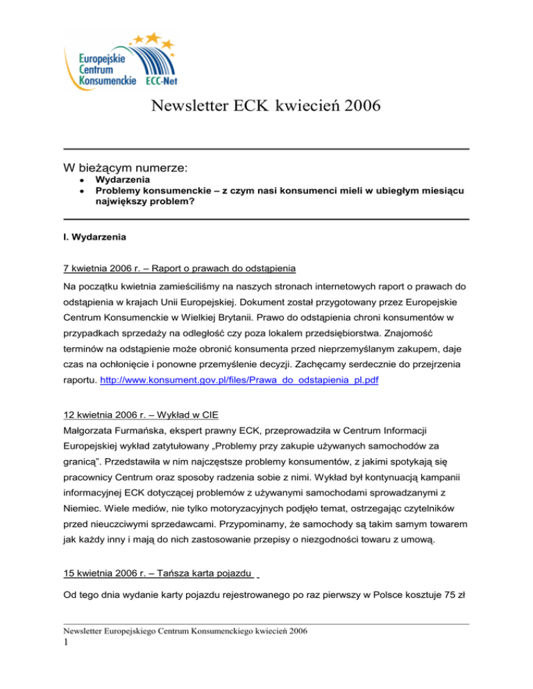 Newsletter ECK kwiecień 2006 W bieżącym numerze: · · Wydarzenia Problemy konsumenckie – z czym nasi konsumenci mieli w ubiegłym miesiącu największy problem? I. Wydarzenia 7 kwietnia 2006 r. – Raport o prawach do odstąpienia Na początku kwietnia zamieściliśmy na naszych stronach internetowych raport o prawach do odstąpienia w krajach Unii Europejskiej. Dokument został przygotowany przez Europejskie Centrum Konsumenckie w Wielkiej Brytanii. Prawo do odstąpienia chroni konsumentów w przypadkach sprzedaży na odległość czy poza lokalem przedsiębiorstwa. Znajomość terminów na odstąpienie może obronić konsumenta przed nieprzemyślanym zakupem, daje czas na ochłonięcie i ponowne przemyślenie decyzji. Zachęcamy serdecznie do przejrzenia raportu. http://www.konsument.gov.pl/files/Prawa_do_odstapienia_pl.pdf 12 kwietnia 2006 r. – Wykład w CIE Małgorzata Furmańska, ekspert prawny ECK, przeprowadziła w Centrum Informacji Europejskiej wykład zatytułowany „Problemy przy zakupie używanych samochodów za granicą”. Przedstawiła w nim najczęstsze problemy konsumentów, z jakimi spotykają się pracownicy Centrum oraz sposoby radzenia sobie z nimi. Wykład był kontynuacją kampanii informacyjnej ECK dotyczącej problemów z używanymi samochodami sprowadzanymi z Niemiec. Wiele mediów, nie tylko motoryzacyjnych podjęło temat, ostrzegając czytelników przed nieuczciwymi sprzedawcami. Przypominamy, że samochody są takim samym towarem jak każdy inny i mają do nich zastosowanie przepisy o niezgodności towaru z umową. 15 kwietnia 2006 r. – Tańsza karta pojazdu Od tego dnia wydanie karty pojazdu rejestrowanego po raz pierwszy w Polsce kosztuje 75 zł Newsletter Europejskiego Centrum Konsumenckiego kwiecień 2006 1 zamiast 500 zł. Trybunał Konstytucyjny 17 stycznia 2006 r. uznał, że opłata 500 zł za wydanie karty pojazdu jest zbyt wysoka. 28 marca Minister Transportu i Budownictwa Pan Jerzy Polaczek podpisał rozporządzenie obniżające tą opłatę do 75 zł. Ma to szczególne znaczenie dla osób sprowadzających samochody z zagranicy, ponieważ częściowo przynajmniej obniża koszty związane z taką operacją. http://www.konsument.gov.pl/pl/aktualnosci 21 – 23 kwietnia 2006 – targi LATO 2006 Europejskie Centrum Konsumenckie prezentowało swoją działalność na jednych z największych Targów Turystycznych w Polsce – LATO 2006. Pracownicy Centrum udzielali informacji o naszych kompetencjach oraz działaniach, a także rozdawali foldery i ulotki informacyjne o prawach konsumentów i zakupach w krajach Unii Europejskiej. Targi LATO 2006 odwiedziło ponad 35 tysięcy osób, które szukały ciekawych propozycji wypoczynku zagranicą. 25 kwietnia 2006 – Seminarium o Pozasądowych Systemach Rozwiązywania Sporów (ADR – Alternative Dispute Resolution) Europejskie Centrum Konsumenckie zorganizowało spotkanie dla instytucji, przedsiębiorców i organizacji gospodarczych, poświęcone polubownym metodom rozwiązywania sporów w praktyce obrotu konsumenckiego. Prelegentami byli eksperci ECK i zaproszeni goście, między innymi dr. Paweł Podrecki z Uniwersytetu Jagiellońskiego, Arbiter Bankowy Pani Katarzyna Marczyńska, Pan Heronim Ostrowski Przewodniczący Polubownego Sądu Konsumenckiego w Warszawie, Pan Tomasz Wróblewski Radca Prawny w Biurze Rzecznika Ubezpieczonych oraz Dyr. Departamentu Polityki Konsumenckiej UOKiK Pani Joanna Wrona. Podczas seminarium staraliśmy się przybliżyć uczestnikom rozwiązania prawne dotyczące ADR w Polsce i w Europie oraz funkcjonujące w praktyce obrotu konsumenckiego systemy polubownego rozwiązywania sporów w Polsce. Newsletter Europejskiego Centrum Konsumenckiego kwiecień 2006 2 II. Problemy konsumenckie – z czym nasi konsumenci mieli w ubiegłym miesiącu największy problem? Do Europejskiego Centrum Konsumenckiego trafia coraz więcej skarg na linie lotnicze. Wiele z nich dotyczy zagubionego lub zniszczonego bagażu. Europejskie Centrum Konsumenckie jest jedyną w Polsce instytucją, która pomaga w dochodzeniu roszczeń związanych z bagażem przewożonym liniami lotniczymi. Za bagaż zagubiony, opóźniony, uszkodzony lub zniszczony podczas lotu liniami lotniczymi z, lub do kraju Unii Europejskiej przysługuje odszkodowanie w wysokości do 1200 €. Jeżeli przewoźnik uchyla się od odpowiedzialności za poniesione przez pasażera szkody, pasażer może dochodzić swoich roszczeń na drodze sądowej. Trzeba jednak pamiętać, że wszelkie uszkodzenia bagażu należy zgłosić w terminie 7 dni od daty jego odbioru, w przypadku bagażu opóźnionego - w terminie 21 dni od odbioru. Jeżeli bagaż nie przyleciał razem z nami tym samym lotem opóźnienie trzeba natychmiast zgłosić w biurze reklamacji danego przewoźnika lub jego przedstawiciela na lotnisku. Konsumenci nie są bezradni, ale muszą też przestrzegać pewnych praw. Wiele osób zgłasza do ECK skargi związane z zaginięciem z walizek wartościowych rzeczy. Tymczasem do bagażu nie wolno pakować sprzętu elektronicznego ani biżuterii, ponieważ linie lotnicze zastrzegają, że nie biorą za nie odpowiedzialności. Natomiast za zniszczone lub uszkodzone torby i walizki przysługuje odszkodowanie, które zostanie wypłacone po wycenieniu szkody. Więcej o prawach pasażerów linii lotniczych znajdziesz na http://www.konsument.gov.pl/pl/podroze_samolotem/. Newsletter Europejskiego Centrum Konsumenckiego kwiecień 2006 3