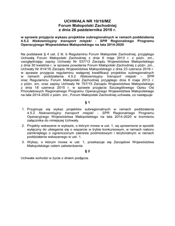 UCHWAŁA NR 10/16/MZ Forum Małopolski Zachodniej z dnia 26