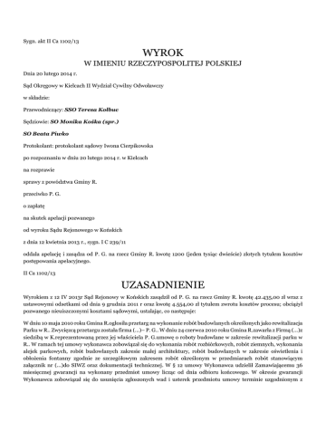 Sygn. akt II Ca 1102/13 WYROK W IMIENIU RZECZYPOSPOLITEJ POLSKIEJ Dnia 20 lutego 2014 r. Sąd Okręgowy w Kielcach II Wydział Cywilny Odwoławczy w składzie: Przewodniczący: SSO Teresa Kołbuc Sędziowie: SO Monika Kośka (spr.) SO Beata Piwko Protokolant: protokolant sądowy Iwona Cierpikowska po rozpoznaniu w dniu 20 lutego 2014 r. w Kielcach na rozprawie sprawy z powództwa Gminy R. przeciwko P. G. o zapłatę na skutek apelacji pozwanego od wyroku Sądu Rejonowego w Końskich z dnia 12 kwietnia 2013 r., sygn. I C 239/11 oddala apelację i zasądza od P. G. na rzecz Gminy R. kwotę 1200 (jeden tysiąc dwieście) złotych tytułem kosztów postępowania apelacyjnego. II Ca 1102/13 UZASADNIENIE Wyrokiem z 12 IV 2013r Sąd Rejonowy w Końskich zasądził od P. G. na rzecz Gminy R. kwotę 42.435,00 zł wraz z ustawowymi odsetkami od dnia 9 grudnia 2011 r oraz kwotę 4.554,00 zł tytułem zwrotu kosztów procesu; obciążył pozwanego nieuiszczonymi kosztami sądowymi, ustalając, co następuje: W dniu 10 maja 2010 roku Gmina R.ogłosiła przetarg na wykonanie robót budowlanych określonych jako rewitalizacja Parku w R.. Zwycięzcą przetargu została firma (...)– P. G.. W dniu 24 czerwca 2010 roku Gmina R.zawarła z Firmą (...)z siedzibą w K.reprezentowaną przez jej właściciela P. G.umowę o roboty budowlane w zakresie rewitalizacji parku w R.. W ramach tej umowy wykonawca zobowiązał się do wykonania robót rozbiórkowych, robót ziemnych, wykonania alejek parkowych, robót budowlanych zakresie małej architektury, robót budowlanych w zakresie oświetlenia i obłożenia fontanny zgodnie ze szczegółowym zakresem robót określonym w przedmiarach robót stanowiącym załącznik nr (...)do SIWZ oraz dokumentacji technicznej. W § 12 umowy Wykonawca udzielił Zamawiającemu 36 miesięcznej gwarancji na wykonany przedmiot umowy licząc od dnia odbioru końcowego. W okresie gwarancji Wykonawca zobowiązał się do usunięcia zgłoszonych wad i usterek przedmiotu umowy terminie uzgodnionym z Zamawiającym. Jeżeli w okresie gwarancji Wykonawca nie usunie zgłoszonych wad i usterek przedmiotu umowy w terminie uzgodnionym z Zamawiającym, Zamawiający może na koszt Wykonawcy dokonać naprawy przedmiotu umowy. Około 13 października 2010 roku zakończono fugowanie niecki fontanny, około 22 -23 października 2010 roku fontanna była gotowa do odbioru. Odbiór jednak nie nastąpił albowiem nie wszystkie prace z zakresu przewidzianego umową były wykonane. W dniu 26 października 2010 roku fontanna została napełniona wodą. W dniu 21 listopada 2010 roku niezidentyfikowana osoba wrzuciła do fontanny wiadro ze środkiem pianotwórczym. Po tym zdarzeniu woda została wypompowana z fontanny. W dniu 22 grudnia 2011 roku nastąpił odbiór końcowy prac objętych umową z dnia 24 czerwca 2010 roku i przekazanie do eksploatacji obiektu. Odbiór dokonany został przez komisję, z odbioru sporządzono Protokół. W protokole stwierdzono zgodność wykonanych robót z umową, z dokumentacją i obmiarem powykonawczym. Nie stwierdzono wad obiektu. Za początek okresu gwarancyjnego odebranych elementów obiektu przyjęto dzień 22.12.2010 roku. W protokole wskazano również, iż stwierdzone przez Zamawiającego w okresie gwarancyjnym wady obiektu będą usunięte przez Wykonawcę w terminie wyznaczonym przez Zamawiającego, a wady powodujące zagrożenie bezpieczeństwa w ruchu – niezwłocznie. Żadna ze stron nie zgłosiła uwag do protokołu odbioru. Od chwili odbioru robót fontanna nie była uruchamiana. Na wiosnę przed uruchomieniem fontanny pracownicy Urzędu Gminy w R. dokonali jej oględzin i okazało się, że w kilkunastu miejscach z niecki fontanny odpadły płytki. Mozaika w niecce fontanny wykonana została wadliwie, co spowodowało, że odpadła praktycznie na całej powierzchni niecki. Od podłoża odchodziły, nie tylko sama mozaika, ale wszystkie warstwy. Spowodowane to zostało niewłaściwym wykonaniem prac przez Wykonawcę polegającym na nie przestrzeganiu instrukcji reżimu technologicznego. Wadliwie, niestarannie dobrana została receptura kleju, fugi, podłoża co doprowadziło do braku hermetyki warstwy uszczelniającej. Pozwany do obłożenia fontanny mozaiką nie zastosował wyłącznie materiałów jednego producenta, co spowodowało, że materiały chemii budowlanej nie były ze sobą kompatybilne i przez to nie osiągnięto efektu uszczelnienia fontanny. Kolejną przyczyną odpadnięcia mozaiki była niedoskonałość wykonawstwa, przy nakładaniu kolejnych warstw podłoże nie było dostatecznie oczyszczone, co również powodowało nieszczelności. Wadliwie wykonana została podstawowa warstwa nośna niecki poprzez użycie niewłaściwego betonu. Nie zastosowano właściwego harmonogramu montażu, brakowało wyraźnego rozdzielenia etapów poszczególnych prac. Pismem z dnia 13 kwietnia 2011 roku wójt Gminy R. wezwał Wykonawcę do usunięcia wad w postaci pęknięć i ubytków w mozaice przy fontannie w parku w R.. Na pismo to Gmina R. nie otrzymała żadnej odpowiedzi. Kolejnym pismem z dnia 23 maja 2011 roku Gmina R. wezwała Wykonawcę do usunięcia wad w postaci pęknięć i ubytków w mozaice przy fontannie w parku w R. w terminie 14 dni wskazując, iż w przeciwnym razie zleci naprawę firmie zewnętrznej na koszt Wykonawcy. Na skutek pisma odbyła się między wójtem a P. G. rozmowa telefoniczna, następnie doszło do spotkania w większym gronie, podczas którego P. G. twierdził, że nie ponosi winy w powstałych ubytkach, wskazując, że zniszczenia spowodowane są napuszczeniem wody do fontanny w listopadzie 2010 roku. Twierdził ponadto, że nie ma konieczności wymiany całości mozaiki, że wystarczające będzie jedynie uzupełnienie ubytków. W piśmie z dnia 8 czerwca 2011 roku P. G. odnosząc się dotrzymanego w dniu 24 maja 2011 roku pisma oświadczył, iż wady nie są spowodowane złym montażem i nie wynikają z winy i zaniedbań