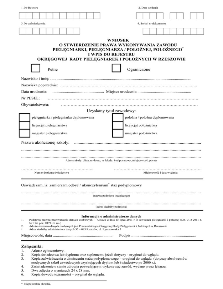 1. Nr Rejestru 2. Data wydania 3. Nr zaświadczenia 4. Seria i nr dokumentu WNIOSEK O STWIERDZENIE PRAWA WYKONYWANIA ZAWODU PIELĘGNIARKI, PIELĘGNIARZA / POŁOŻNEJ, POŁOŻNEGO* I WPIS DO REJESTRU OKRĘGOWEJ RADY PIELĘGNIAREK I POŁOŻNYCH W RZESZOWIE Pełne Ograniczone Nazwisko i imię: ......................................................................................................................................... Nazwiska poprzednie: ……………………………………………………………………………….…..….. Data urodzenia: Nr PESEL: .................................................. Miejsce urodzenia: ................................................... ………………………………………………………………………….……………………. Obywatelstwo/a: ………………………………………………………………………….…………… Uzyskany tytuł zawodowy: pielęgniarka / pielęgniarka dyplomowana położna / położna dyplomowana licencjat pielęgniarstwa licencjat położnictwa magister pielęgniarstwa magister położnictwa Nazwa ukończonej szkoły: ................................................................................................................. ................................................................................................................................................................ ................................................................................................................................................................ Adres szkoły: ulica, nr domu, nr lokalu, kod pocztowy, miejscowość, poczta …………………………………………….. ………………………………………………………. Miejscowość i data wydania Numer dyplomu/świadectwa Oświadczam, iż zamierzam odbyć / ukończyłem/am* staż podyplomowy ................................................................................................................................................................ (nazwa podmiotu leczniczego) ................................................................................................................................................................ (adres siedziby podmiotu) Informacja o administratorze danych 1. 2. 3. Podstawa prawna przetwarzania danych osobowych – Ustawa z dnia 15 lipca 2011 r. o zawodach pielęgniarki i położnej (Dz. U. z 2011 r. Nr 174, poz. 1039. ze zm.) Administratorem danych osobowych jest Przewodnicząca Okręgowej Rady Pielęgniarek i Położnych w Rzeszowie Adres siedziby administratora danych 35 – 083 Rzeszów, ul. Rymanowska 3 Miejscowość, data .......................................................... Podpis ............................................................... Załączniki: 1. 2. 3. 4. 5. 6. Arkusz zgłoszeniowy. Kopia świadectwa lub dyplomu oraz suplementu jeżeli dotyczy - oryginał do wglądu. Kopia zaświadczenia o ukończeniu stażu podyplomowego – oryginał do wglądu (dotyczy absolwentów medycznych szkół zawodowych uzyskujących dyplom lub świadectwo po 2000 r.). Zaświadczenie o stanie zdrowia pozwalającym wykonywać zawód, wydane przez lekarza. Dwa zdjęcia o wymiarach 24 x 28 mm. Kopia dowodu tożsamości – oryginał do wglądu. * Niepotrzebne skreślić. Potwierdzenie odbioru zaświadczenia oraz oświadczenie Niniejszym potwierdzam odbiór: zaświadczenia o prawie wykonywania zawodu Seria ……. Nr …………….… uchwały nr …………………………………… z dnia ………………………… Jednocześnie oświadczam, że zgodnie z art. 11 ust. 2 pkt 1 - 5 ustawy o samorządzie pielęgniarek i położnych z dnia 1 lipca 2011 roku (Dz. U. Nr 178 poz. 1038, ze zm.), zobowiązuję się do: - postępowania zgodnie z zasadami etyki zawodowej oraz zasadami wykonywania zawodu, - sumiennie wykonywać obowiązki zawodowe i przestrzegać uchwał organów izby, - regularnie opłacać składkę członkowską (nie dotyczy osób: zarejestrowanych jako bezrobotne, przebywających na urlopach wychowawczych, pobierających zasiłek rehabilitacyjny, niewykonujących zawodu od daty złożenia wniosku o zaprzestanie wykonywania zawodu lub wniosku o zrzeczenie się prawa wykonywania zawodu). - z chwilą wpisania do rejestru zobowiązuje się do zawiadomienia właściwej okręgowej rady pielęgniarek i położnych o wszelkich zmianach danych zawartych w rejestrze, nie później niż w terminie 14 dni od dnia ich powstania. Data ........................................... ......................................................... Podpis Pouczenie: Nieopłacone w terminie składki członkowskie podlegają ściągnięciu w trybie przepisów o postępowaniu egzekucyjnym w administracji - art. 92 Ustawy z dnia 1 lipca 2011 roku o samorządzie pielęgniarek i położnych (Dz. U. Nr 174 poz. 1038, ze zm.).