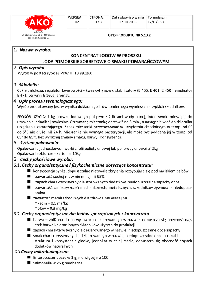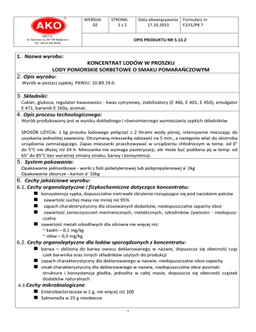WERSIJA: 02 STRONA: 1z2 AKO S.A. Ul. Startowa 2a, 85-744 Bydgoszcz Tel. +48 52 342 09 66 Data obowiązywania Formularz nr 17.10.2013 F2/I1/PB 7 OPIS PRODUKTU NR 5.13.2 1. Nazwa wyrobu: KONCENTRAT LODÓW W PROSZKU LODY POMORSKIE SORBETOWE O SMAKU POMARAOCZOWYM 2. Opis wyrobu: Wyrób w postaci sypkiej. PKWiU: 10.89.19.0. 3. Składniki: Cukier, glukoza, regulator kwasowości - kwas cytrynowy, stabilizatory (E 466, E 401, E 450), emulgator E 471, barwnik E 160a, aromat. 4. Opis procesu technologicznego: Wyrób produkowany jest w wyniku dokładnego i równomiernego wymieszania sypkich składników. SPOSÓB UŻYCIA: 1 kg proszku lodowego połączyd z 2 litrami wody pitnej, intensywnie mieszając do uzyskania jednolitej zawiesiny. Otrzymaną mieszankę odstawid na 5 min., a następnie wlad do zbiornika urządzenia zamrażającego. Zapas mieszanki przechowywad w urządzeniu chłodniczym w temp. od 0° do 5°C nie dłużej niż 24 h. Mieszanka nie wymaga pasteryzacji, ale może byd poddana jej w temp. od 65° do 85°C bez wyraźnej zmiany smaku, barwy i konsystencji. 5. System pakowania: Opakowanie jednostkowe - worki z folii polietylenowej lub polipropylenowej a’ 2kg Opakowanie zbiorcze - karton a’ 10kg 6. Cechy jakościowe wyrobu: 6.1. Cechy organoleptyczne i fizykochemiczne dotyczące koncentratu: konsystencja sypka, dopuszczalne nietrwałe zbrylenia rozsypujące się pod naciskiem palców zawartośd suchej masy nie mniej niż 95% zapach charakterystyczny dla stosowanych dodatków, niedopuszczalne zapachy obce zawartośd zanieczyszczeo mechanicznych, metalicznych, szkodników żywności - niedopuszczalna zawartośd metali szkodliwych dla zdrowia nie więcej niż: ~ kadm – 0,1 mg/kg ~ ołów – 0,3 mg/kg 6.2. Cechy organoleptyczne dla lodów sporządzonych z koncentratu: barwa – zbliżona do barwy owocu deklarowanego w nazwie, dopuszcza się obecnośd cząs czek barwnika oraz innych składników użytych do produkcji zapach charakterystyczny dla deklarowanego w nazwie, niedopuszczalne obce zapachy smak charakterystyczny dla deklarowanego w nazwie, niedopuszczalne obce posmaki struktura i konsystencja gładka, jednolita w całej masie, dopuszcza się obecnośd cząstek dodatków naturalnych 6.3.Cechy mikrobiologiczne: Enterobacteriaceae w 1 g, nie więcej niż 100 Salmonella w 25 g nieobecne 1 WERSIJA: 02 STRONA: 2z2 AKO S.A. Ul. Startowa 2a, 85-744 Bydgoszcz Tel. +48 52 342 09 66 Data obowiązywania Formularz nr 17.10.2013 F2/I1/PB 7 OPIS PRODUKTU NR 5.13.2 7. Składniki alergenne: Koncentrat może zawierad śladowe ilości zbóż zawierających gluten, nasion soi, nasion sezamu , łubinu, jaj w proszku, mleka w proszku. 8. Deklaracja GMO: Produkt nie zawiera surowców genetycznie modyfikowanych 9. Trwałośd wyrobu i warunki jego przechowywania: Opakowany produkt przechowywad w suchym i chłodnym miejscu, na czystych drewnianych podestach w odległości min. 10 cm od ściany. Okres przechowywania do 12 m-cy od daty produkcji. 10. Dystrybucja wyrobu: Produkt jest dostarczany do odbiorcy w opakowaniu jednostkowym lub zbiorczym na ofoliowanych lub nieofoliowanych paletach transportem kołowym firmy zewnętrznej przeznaczonym do przewozu środków spożywczych. 11. Przeznaczenie wyrobu: Koncentrat LODY POMORSKIE SORBETOWE O SMAKU POMARAŃCZOWYM przeznaczony jest do bezpośredniego wytwarzania mieszanek lodowych o smaku pomaraoczowym. 2