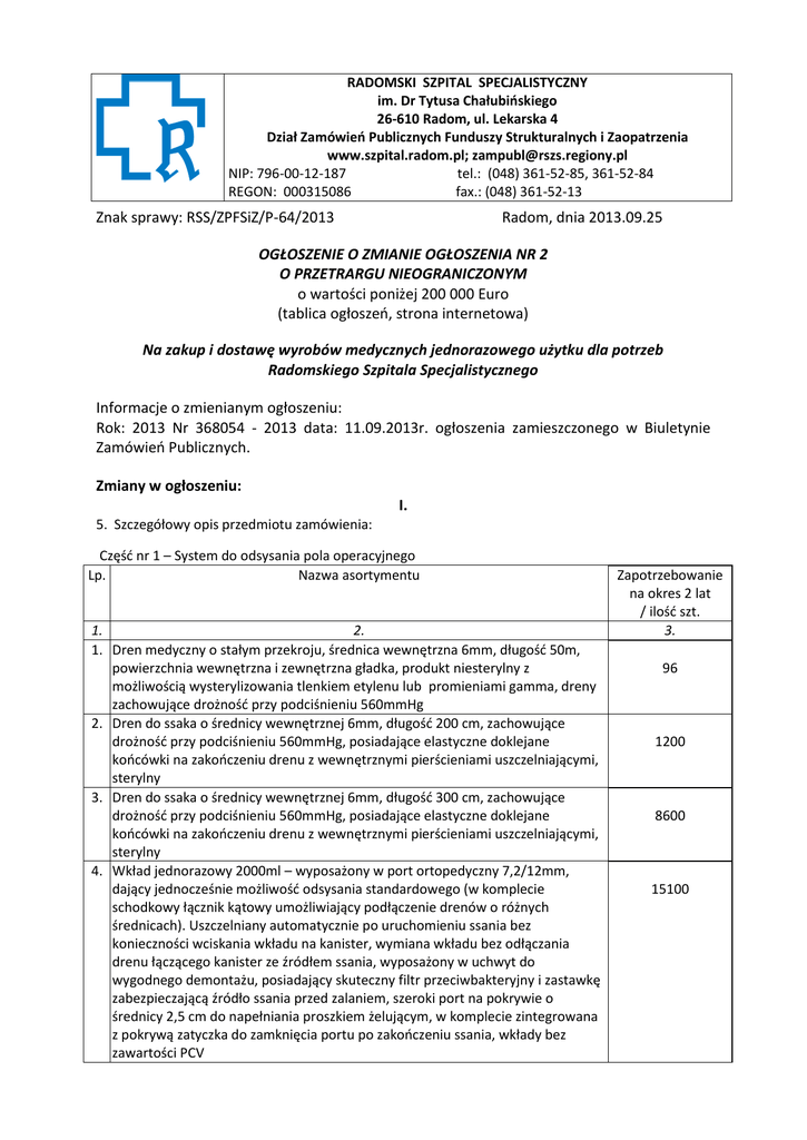 RADOMSKI SZPITAL SPECJALISTYCZNY im. Dr Tytusa Chałubińskiego 26-610 Radom, ul. Lekarska 4 Dział Zamówień Publicznych Funduszy Strukturalnych i Zaopatrzenia www.szpital.radom.pl; [email protected] NIP: 796-00-12-187 tel.: (048) 361-52-85, 361-52-84 REGON: 000315086 fax.: (048) 361-52-13 Znak sprawy: RSS/ZPFSiZ/P-64/2013 Radom, dnia 2013.09.25 OGŁOSZENIE O ZMIANIE OGŁOSZENIA NR 2 O PRZETRARGU NIEOGRANICZONYM o wartości poniżej 200 000 Euro (tablica ogłoszeń, strona internetowa) Na zakup i dostawę wyrobów medycznych jednorazowego użytku dla potrzeb Radomskiego Szpitala Specjalistycznego Informacje o zmienianym ogłoszeniu: Rok: 2013 Nr 368054 - 2013 data: 11.09.2013r. ogłoszenia zamieszczonego w Biuletynie Zamówień Publicznych. Zmiany w ogłoszeniu: I. 5. Szczegółowy opis przedmiotu zamówienia: Część nr 1 – System do odsysania pola operacyjnego Lp. Nazwa asortymentu 1. 2. 1. Dren medyczny o stałym przekroju, średnica wewnętrzna 6mm, długość 50m, powierzchnia wewnętrzna i zewnętrzna gładka, produkt niesterylny z możliwością wysterylizowania tlenkiem etylenu lub promieniami gamma, dreny zachowujące drożność przy podciśnieniu 560mmHg 2. Dren do ssaka o średnicy wewnętrznej 6mm, długość 200 cm, zachowujące drożność przy podciśnieniu 560mmHg, posiadające elastyczne doklejane końcówki na zakończeniu drenu z wewnętrznymi pierścieniami uszczelniającymi, sterylny 3. Dren do ssaka o średnicy wewnętrznej 6mm, długość 300 cm, zachowujące drożność przy podciśnieniu 560mmHg, posiadające elastyczne doklejane końcówki na zakończeniu drenu z wewnętrznymi pierścieniami uszczelniającymi, sterylny 4. Wkład jednorazowy 2000ml – wyposażony w port ortopedyczny 7,2/12mm, dający jednocześnie możliwość odsysania standardowego (w komplecie schodkowy łącznik kątowy umożliwiający podłączenie drenów o różnych średnicach). Uszczelniany automatycznie po uruchomieniu ssania bez konieczności wciskania wkładu na kanister, wymiana wkładu bez odłączania drenu łączącego kanister ze źródłem ssania, wyposażony w uchwyt do wygodnego demontażu, posiadający skuteczny filtr przeciwbakteryjny i zastawkę zabezpieczającą źródło ssania przed zalaniem, szeroki port na pokrywie o średnicy 2,5 cm do napełniania proszkiem żelującym, w komplecie zintegrowana z pokrywą zatyczka do zamknięcia portu po zakończeniu ssania, wkłady bez zawartości PCV Zapotrzebowanie na okres 2 lat / ilość szt. 3. 96 1200 8600 15100 5. Wkład jednorazowy 3000ml z napyloną wewnątrz substancją żelującą – wyposażony w port 7,2/12mm, dający jednocześnie możliwość odsysania standardowego oraz ortopedycznego (w komplecie pięciostopniowy obrotowy łącznik kątowy umożliwiający podłączenie drenów o różnych średnicach). Uszczelniany automatycznie po uruchomieniu ssania bez konieczności wciskania wkładu na kanister, wymiana wkładu bez odłączania drenu łączącego kanister ze źródłem ssania, wyposażony w uchwyt do wygodnego demontażu, posiadający skuteczny filtr przeciwbakteryjny i zastawkę zabezpieczającą źródło ssania przed zalaniem, szeroki port na pokrywie o średnicy 2,5 cm do napełniania proszkiem żelującym, w komplecie zintegrowana z pokrywą zatyczka do zamknięcia portu po zakończeniu ssania, wkłady bez zawartości PCV 6. Pojemnik wielorazowy z uchwytem do mocowania o pojemności 2000ml – przeźroczysty, wyskalowany w ml, wyposażony w zintegrowany zaczep 30mm do mocowania na standardowych wieszakach do szyn Modura, wyposażony w zintegrowany wymienny króciec do połączenia ze źródłem ssania nie wymagający odłączania drenu ssącego od kanistra lub pokrywy wkładu przy jego wymianie, odporny na mycie w temp. 85° C i sterylizację w autoklawie 121° 7. Uniwersalny wieszak na szynę plastikowy automatyczny z mechanizmem sprężynowym pozwalającym na szybki montaż na szynach o różnej wysokości i grubości, kompatybilny ze zintegrowanym 30mm zaczepem kanistrów 8. Zawór zamykający próżnię – umożliwiający szybkie odcięcie próżni, posiadający króciec 14,2 mm kompatybilny z gniazdem kanistra, wymienny, obrotowy umożliwiający skierowanie króćca w dowolną stronę, odporny na mycie w temp. 85°C, wielokrotnego użytku 9. Filtr antybakteryjny do ssaków operacyjnych, autoklawowalny z wkładami jednorazowymi Część nr 2 – Końcówki do odsysania pola operacyjnego Lp. Nazwa asortymentu 1. 1. 2. Kanki - końcówki do odsysania pola operacyjnego, jałowe nietoksyczne dł. 25 cm, bez regulatora, z czterema otworami bocznymi na końcu kanki a) standardowa b) z kulką Część nr 3 - Dreny operacyjne Lp. 1. 1. 2. Nazwa asortymentu 2. Dren KEHRA wykonany z mieszaniny silikonu i lateksu, bezkanałowy, jednorazowego użytku, pakowany podwójnie w wewnętrzny worek foliowy i zewnętrzne opakowanie folia/papier. Rozmiary: 3mm, 3,5mm, 4mm, 5mm, 5,5mm, 6mm, 7mm, 8mm Dreny Redona - wykonane z PCV, jednorazowego użytku, jałowe, cyfrowa podziałka głębokości, perforacja na dł. 12 cm od dystalnego końca. - Perforowane z kontrastem RTG, dł. 75 cm (+/- 5 cm) Rozmiar: a) CH 12 b) CH 14 400 68 80 40 200 Zapotrzebowanie na okres 2 lat / ilość szt. 3. 10400 600 Zapotrzebowanie na okres 2 lat / ilość szt. 3. 240 3000 3. c) CH 16 d) CH 18 Dreny Redona - Perforowane z trokarem trójstronnie ściętym, dł. 75 cm (+/- 5 cm). Rozmiar: CH 16 Część nr 4 – Kaniule dotętnicze Lp. Nazwa asortymentu 1. 1. 2. Kaniule dotętnicze – 20G/1.10 mm x 45mm do pobierania gazometrii i monitorowania inwazyjnego ciśnienia, posiadające zamek typu Flow Switch zapobiegający wstecznemu wypływowi krwi, sterylne, jednorazowe, przepływ 49ml/min Część nr 5 – Dren do pompy chłodzącej Lp. Nazwa asortymentu 1. 1. 2. Elektrody endokawitarne do czasowej stymulacji serca - rozmiar elektrody od 4F do 6F - kształt końcówki elektrody: prosta i zagięta (posiadanie obu typów w ofercie) - końcówki