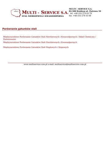 MULTI - SERVICE S.A. STAL NIERDZEWNA I KWASOODPORNA MULTI - SERVICE S.A. 82-500 Kwidzyn ul. Żwirowa 10 tel. +48 (55) 279 63 79 fax. +48 (55) 279 33 09 Porównanie gatunków stali Międzynarodowe Porównanie Gatunków Stali Nierdzewnych i Kwasoodpornych / Skład Chemiczny / Zastosowanie Międzynarodowe Porównanie Gatunków Stali Nierdzewnych i Kwasoodpornych Międzynarodowe Porównanie Gatunków Stali Węglowych i Stopowych www.multiservice.com.pl e-mail: [email protected]