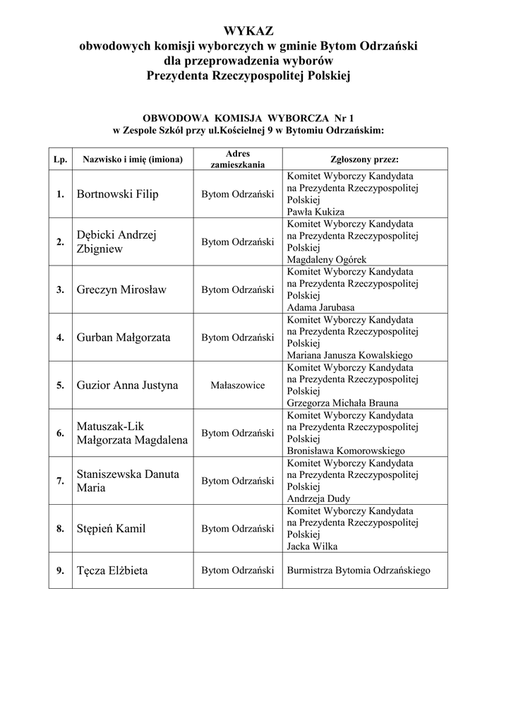 WYKAZ obwodowych komisji wyborczych w gminie Bytom Odrzański dla przeprowadzenia wyborów Prezydenta Rzeczypospolitej Polskiej OBWODOWA KOMISJA WYBORCZA Nr 1 w Zespole Szkół przy ul.Kościelnej 9 w Bytomiu Odrzańskim: Lp. Nazwisko i imię (imiona) Adres zamieszkania 1. Bortnowski Filip Bytom Odrzański 2. Dębicki Andrzej Zbigniew Bytom Odrzański 3. Greczyn Mirosław Bytom Odrzański 4. Gurban Małgorzata Bytom Odrzański 5. Guzior Anna Justyna 6. Matuszak-Lik Małgorzata Magdalena Bytom Odrzański 7. Staniszewska Danuta Maria Bytom Odrzański 8. Stępień Kamil Bytom Odrzański 9. Tęcza Elżbieta Bytom Odrzański Małaszowice Zgłoszony przez: Komitet Wyborczy Kandydata na Prezydenta Rzeczypospolitej Polskiej Pawła Kukiza Komitet Wyborczy Kandydata na Prezydenta Rzeczypospolitej Polskiej Magdaleny Ogórek Komitet Wyborczy Kandydata na Prezydenta Rzeczypospolitej Polskiej Adama Jarubasa Komitet Wyborczy Kandydata na Prezydenta Rzeczypospolitej Polskiej Mariana Janusza Kowalskiego Komitet Wyborczy Kandydata na Prezydenta Rzeczypospolitej Polskiej Grzegorza Michała Brauna Komitet Wyborczy Kandydata na Prezydenta Rzeczypospolitej Polskiej Bronisława Komorowskiego Komitet Wyborczy Kandydata na Prezydenta Rzeczypospolitej Polskiej Andrzeja Dudy Komitet Wyborczy Kandydata na Prezydenta Rzeczypospolitej Polskiej Jacka Wilka Burmistrza Bytomia Odrzańskiego OBWODOWA KOMISJA WYBORCZA Nr 2 w Zespole Szkół przy ul.Kożuchowskiej 15 w Bytomiu Odrzańskim: „Dla wyborców niepełnosprawnych” Lp. 1. 2. Nazwisko i imię (imiona) Dębicka Joanna Marzena Frankowska Anna Dorota Adres zamieszkania Zgłoszony przez: Bytom Odrzański Komitet Wyborczy Kandydata na Prezydenta Rzeczypospolitej Polskiej Magdaleny Ogórek Bytom Odrzański Burmistrza Bytomia Odrzańskiego 3. Guzik Władysława 4. Jaworska Józefa Zofia Bytom Odrzański 5. Kozłowski Piotr Bytom Odrzański 6. Skwara Irena Małgorzata Wierzbnica 7. Trzeciak Wanda Wierzbnica 8. Żarowska Adrianna Bycz Bytom Odrzański Komitet Wyborczy Kandydata na Prezydenta Rzeczypospolitej Polskiej Adama Jarubasa Komitet Wyborczy Kandydata na Prezydenta Rzeczypospolitej Polskiej Bronisława Komorowskiego Komitet Wyborczy Kandydata na Prezydenta Rzeczypospolitej Polskiej Andrzeja Dudy Komitet Wyborczy Kandydata na Prezydenta Rzeczypospolitej Polskiej Grzegorza Michała Brauna Komitet Wyborczy Kandydata na Prezydenta Rzeczypospolitej Polskiej Pawła Kukiza Komitet Wyborczy Kandydata na Prezydenta Rzeczypospolitej Polskiej Jacka Wilka