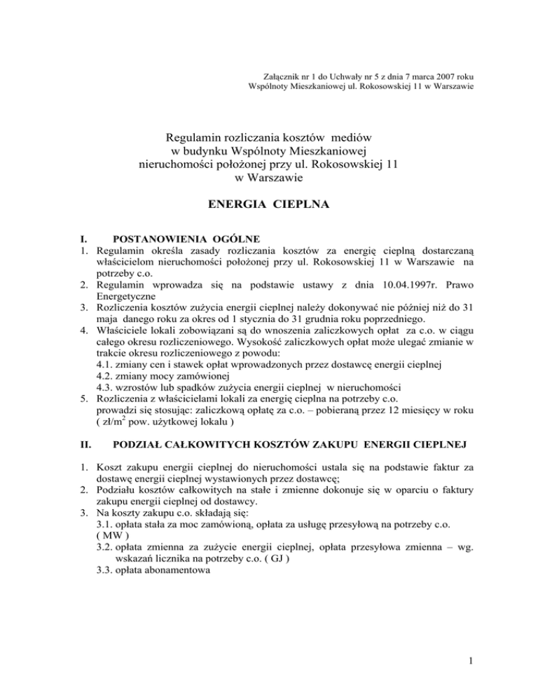 Załącznik nr 1 do Uchwały nr 5 z dnia 7 marca 2007 roku Wspólnoty Mieszkaniowej ul. Rokosowskiej 11 w Warszawie Regulamin rozliczania kosztów mediów w budynku Wspólnoty Mieszkaniowej nieruchomości położonej przy ul. Rokosowskiej 11 w Warszawie ENERGIA CIEPLNA I. POSTANOWIENIA OGÓLNE 1. Regulamin określa zasady rozliczania kosztów za energię cieplną dostarczaną właścicielom nieruchomości położonej przy ul. Rokosowskiej 11 w Warszawie na potrzeby c.o. 2. Regulamin wprowadza się na podstawie ustawy z dnia 10.04.1997r. Prawo Energetyczne 3. Rozliczenia kosztów zużycia energii cieplnej należy dokonywać nie później niż do 31 maja danego roku za okres od 1 stycznia do 31 grudnia roku poprzedniego. 4. Właściciele lokali zobowiązani są do wnoszenia zaliczkowych opłat za c.o. w ciągu całego okresu rozliczeniowego. Wysokość zaliczkowych opłat może ulegać zmianie w trakcie okresu rozliczeniowego z powodu: 4.1. zmiany cen i stawek opłat wprowadzonych przez dostawcę energii cieplnej 4.2. zmiany mocy zamówionej 4.3. wzrostów lub spadków zużycia energii cieplnej w nieruchomości 5. Rozliczenia z właścicielami lokali za energię cieplna na potrzeby c.o. prowadzi się stosując: zaliczkową opłatę za c.o. – pobieraną przez 12 miesięcy w roku ( zł/m2 pow. użytkowej lokalu ) II. PODZIAŁ CAŁKOWITYCH KOSZTÓW ZAKUPU ENERGII CIEPLNEJ 1. Koszt zakupu energii cieplnej do nieruchomości ustala się na podstawie faktur za dostawę energii cieplnej wystawionych przez dostawcę; 2. Podziału kosztów całkowitych na stałe i zmienne dokonuje się w oparciu o faktury zakupu energii cieplnej od dostawcy. 3. Na koszty zakupu c.o. składają się: 3.1. opłata stała za moc zamówioną, opłata za usługę przesyłową na potrzeby c.o. ( MW ) 3.2. opłata zmienna za zużycie energii cieplnej, opłata przesyłowa zmienna – wg. wskazań licznika na potrzeby c.o. ( GJ ) 3.3. opłata abonamentowa 1 III. ROZLICZANIE KOSZTÓW CENTRALNEGO OGRZEWANIA 1. Koszty zakupu c.o. określone w pkt. II.ppk.3 rozlicza się na poszczególne lokale, proporcjonalnie do ich udziałów w nieruchomości. 2. Powyższy podział kosztów uwzględnia zarówno powierzchnię lokalu, jak i udział w części wspólnej. ZIMNA WODA I ODPROWADZENIE ŚCIEKÓW I. POSTANOWIENIA OGÓLNE 1. Właściciele lokali będą obciążani za zużytą wodę i ścieki wg. średniego zużycia i rozliczni raz na kwartał wg. wskazań indywidualnych wodomierzy. 2. Odczytu wskazań wodomierzy indywidualnych dokonuje osoba/ firma upoważniona przez Zarząd Wspólnoty Mieszkaniowej 1 raz na kwartał oraz każdorazowo przed zmianą ceny za dostawę wody i odprowadzenie ścieków. Użytkownik lokalu przekazuje informację o ilości zużytej wody osobiście podczas odczytu, telefonicznie lub za pomocą e-mail'a. 3. Spisywanie wodomierzy dokonywane jest nie później niż do dnia 28 ostatniego miesiąca każdego kwartału. 4. W przypadku niemożności dokonania odczytu zgodnie z określonymi powyżej warunkami do rozliczeń przyjmuje się dwukrotną średnią wielkość zużycia przyjętą z ostatniego okresu rozliczeniowego. 5. Właściciel lokalu/Najemca otrzymuje zaliczkowe wyliczenie należności za wodę i ścieki na kolejny kwartał nie później niż do dnia 3 miesiąca rozpoczynającego kwartał. 6. Zarząd Wspólnoty Mieszkaniowej/ Administrator ma prawo dokonywania kontroli sprawności działania wodomierzy i instalacji zimnej wody. 7. W przypadku świadomego uszkodzenia wodomierza przez użytkownika lokalu koszty kontroli ponosi Właściciel lokalu. 8. Koszt i ilość dostarczonej wody i odprowadzonych ścieków do budynku określone są w fakturach wystawianych przez MPWiK na podstawie wskazań wodomierza głównego zainstalowanego w budynku. II. ZASADY ROZLICZANIA DOSTAWY ZIMNEJ WODY I ODPROWADZENIA ŚCIEKÓW W LOKALACH 1. Ilość wody przypadającej na dany lokal będzie wynikać z sumy zużycia wykazanego przez wodomierze w nim zamontowane. 2 2. Suma wskazań wodomierzy indywidualnych lokalu pomnożona przez cenę 1m3 wody i ścieków ustalonej przez organ do tego uprawniony, określa wielkość opłaty jaką winien wnieść właściciel lokalu z tytułu dostawy wody i ścieków. 3. Suma wskazań zużycia wody wodomierzy indywidualnych oraz zamontowanych w części wspólnej powinna odpowiadać wskazaniom zużycia wody zarejestrowanego przez wodomierz główny budynku. Zużycie w części wspólnej oraz różnice między licznikiem głównym i sumą wskazań wszystkich wodomierzy wpływa na wysokość pobieranych zaliczek na utrzymanie nieruchomości. 4. Ilość odprowadzonych ścieków przyjmuje się jako sumę zużytej wody w lokalach i części wspólnej, z wyłączeniem zgłoszonych wodomierzy ustalonej zgodnie z w/w zasadami. 5. Podziału kosztów związanych z odprowadzeniem ścieków dokonuje się analogicznie jak dla kosztów dostawy wody. III. ZASADY INDYWIDUALNYCH MONTAŻU I EKSPLOATACJI WODOMIERZY 1. Wszystkie roboty związane z montażem wodomierzy powinny być wykonane zgodnie z warunkami technicznymi montażu przez osoby posiadające odpowiednie kwalifikacje i uprawnienia określone przez Prawo Budowlane. 2. Montowane wodomierze muszą być dopuszczone do stosowania na terenie Polski i posiadać aktualny atest głównego Urzędu Miar w Warszawie. 3. Wodomierz musi być zamontowany zgodnie z załączoną instrukcją montażu wodomierza opracowaną przez producenta. 4. Zamontowane wodomierze muszą obejmować wszystkie punkty poboru wody. 5. Wodomierze muszą być legalizowane w okresach: co 5 lat. Pierwsza legalizacja musi zostać wykonana po upływie okresu jw., licząc od dnia odbioru wodomierza. Wszelkie koszty związane z naprawami lub wymianą wodomierzy a także koszty legalizacji ponosi właściciel lokalu. 6. Dopuszcza się wymianę wodomierzy w całym budynku wspólnoty ze środków finansowych zgromadzonych na funduszu remontowym, lecz wymaga to podjęcia przez Wspólnotę uchwały 