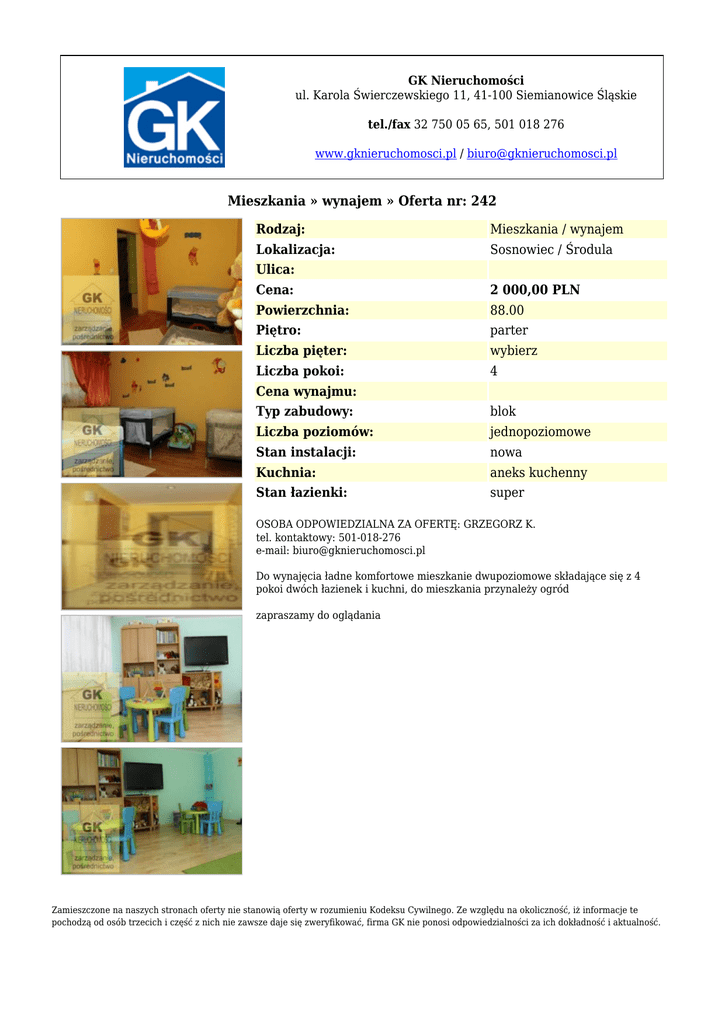 GK Nieruchomości ul. Karola Świerczewskiego 11, 41-100 Siemianowice Śląskie tel./fax 32 750 05 65, 501 018 276 www.gknieruchomosci.pl / [email protected] Mieszkania » wynajem » Oferta nr: 242 Rodzaj: Mieszkania / wynajem Lokalizacja: Sosnowiec / Środula Ulica: Cena: 2 000,00 PLN Powierzchnia: 88.00 Piętro: parter Liczba pięter: wybierz Liczba pokoi: 4 Cena wynajmu: Typ zabudowy: blok Liczba poziomów: jednopoziomowe Stan instalacji: nowa Kuchnia: aneks kuchenny Stan łazienki: super OSOBA ODPOWIEDZIALNA ZA OFERTĘ: GRZEGORZ K. tel. kontaktowy: 501-018-276 e-mail: [email protected] Do wynajęcia ładne komfortowe mieszkanie dwupoziomowe składające się z 4 pokoi dwóch łazienek i kuchni, do mieszkania przynależy ogród zapraszamy do oglądania Zamieszczone na naszych stronach oferty nie stanowią oferty w rozumieniu Kodeksu Cywilnego. Ze względu na okoliczność, iż informacje te pochodzą od osób trzecich i część z nich nie zawsze daje się zweryfikować, firma GK nie ponosi odpowiedzialności za ich dokładność i aktualność.