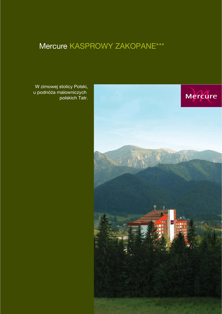 Mercure KASPROWY ZAKOPANE*** W zimowej stolicy Polski, u podnóża malowniczych polskich Tatr. Mercure KASPROWY ZAKOPANE Przyjemność podróżowania czerpiemy z odwiedzania nowych miejsc. Inne zapachy, odmienny klimat oraz specyfika każdego regionu sprawiają, że lubimy odkrywać nowe zakątki. Pamiętamy o tym. Dlatego też każdy z Hoteli Mercure w niepowtarzalny sposób wyraża specyfikę i ducha konkretnego regionu oraz jego kultury. ZAKOPANE > Smak oryginalnego, rozpływajacego sie w ustach oscypka, zapierające dech w piersiach tatrzańskie panoramy, charakterystyczna góralska Najważniejsze miasto Podhala położone w bezpośred- gwara i mnóstwo kulturalnych atrakcji... Oto Zakopane – zimowa stolica niej bliskości Tatr to jednocześnie jeden z najważniej- Polski. szych ośrodków turystycznych naszego kraju. W drugiej połowie XIX w. ta niewielka uzdrowiskowa osada zaczęła Zapraszamy do zwiedzania Zakopanego, gdzie liczne szlaki turysty- się dynamicznie rozwijać. czne oraz malownicze uliczki tętniące życiem każdemu dadzą okazję do relaksu, a niepowtarzalna gościnność i serdeczność Dziewicza przyroda sprzyja cudownym pieszym wycieczkom, a dumni ze swego dziedzictwa górale pieczołowicie kultywują bogatą tradycję. To tutaj, prawdziwie alpejski krajobraz nadaje się idealnie do uprawiania sportów narciarskich. Zakopane, położone jest u podnóża najwyższych polskich gór. Na turystów czeka tu cała moc atrakcji. Kolejką linową dostaniemy się na Kasprowy Wierch, zimą na Wielkiej Krokwi obejrzymy skoki narciarskie. W samym mieście możemy podziwiać liczne muzea oraz piękne zabytkowe kościoły. W letnim i zimowym sezonie nie zabraknie nam ciekawych wydarzeń kulturalnych podczas trwania licznych festiwali i imprez folklorystycznych. górali, czyni stolicę gór miastem unikatowym na skalę światową. Mercure KASPROWY ZAKOPANE Hotel Mercure Kasprowy Zakopane położony jest na Polanie Szymaszkowej, zaledwie 2 km od dworców PKP i PKS oraz 1 km od najsłynniejszego deptaku Polski – Krupówek. Hotel Mercure > Hotel MERCURE KASPROWY posiada mnóstwo zalet czyniących go jednym z najatrakcyjniejszych miejsc do wypoczynku w Zakopanem. > 288 pokoi (w tym 12 pokoi typu suite) Każdy pokój wyposażony jest w dostęp do telewizji satelitarnej, Pay TV, jak również mini bar oraz dostęp do szybkiego internetu. > Restauracja Na regionalne specjały oraz dania kuchni polskiej i międzynarodowej zapraszamy do restauracji Alpejska. Warto także odwiedzić karczmę „Kasprowy Przycup” słynącą z wyśmienitych dań regionalnych. > Bar Przyjemną, odprężającą atmosferę zapewni Państwu „Panorama Lobby Bar”. > Konferencje i bankiety Do Państwa dyspozycji oddajemy 10 nowocześnie urządzonych sal konferencyjnych o łącznej powierzchni 950 m2, wyposażonych w najnowocześniejszy sprzęt audiowizualny. > Fitness Zapraszamy wszystkich miłośników zdrowego wysiłku do ćwiczeń w naszym Centrum Fitness. Mercure KASPROWY ZAKOPANE Pewność i doświadczenie Posiadamy duże doświadczenie w organizacji konferencji, seminariów, eleganckich bankietów oraz rodzinnych spotkań. Pracownicy hotelu dołożą wszelkich starań, by perfekcyjnie zorganizować Państwa uroczystość i uczynić ją niezapomnianą. Sale NAZWA SALI > ustawienie teatralne Zestawienia sal konferencyjnych ustawienie ustawienie „U” szkolne bankiet zasiadany koktajl wysokość powierzchnia m2 Tatry + Foyer 550 150 270 250 350 3,0 m 430 Tatry A+B+C 400 150 270 200 300 3,0 m 330 Tatry A+B 250 100 180 100 200 3,0 m 208 Tatry B+C 250 100 150 100 200 3,0 m 214 Tatry sala A 120 50 90 50 100 3,0 m 105 Tatry sala B 120 50 90 50 100 3,0 m 102 Tatry sala C 120 50 90 50 100 3,0 m 112 Rysy 190 90 90 90 100 3,0 m 195 Giewont 40 30 30 — — 3,0 m 52 Zawrat 40 30 30 — — 3,0 m 56 Czarny Staw 10 — 12 — — 3,0 m 20 Mała Krokiew 10 — 12 — — 3,0 m 23 Wielka Krokiew 40 20 30 — — 3,0 m 46 Ornak 120 40 60 100 100 2,8 m 198 — — — 400 600 2,8 m 702 Sala Bankietowa Zakopane Na każdą okazję. Szeroki wybór sal konferencyjnych oraz możliwość aranżacji przestrzeni do potrzeb konkretnej sytuacji, pozwala nam zorganizować i przeprowadzić dowolne spotkanie większej liczby osób. > DZIAŁ KONFERENCJI I BANKIETÓW tel.: +48 512 366 604 Szymaszkowa, 34-500 Zakopane, tel.: +48 18 202 40 19, fax: +48 18 202 40 24, e-mail: [email protected] Mercure KASPROWY ZAKOPANE > Rozkład sal konferencyjnych Recepcja SALA SALA ZAWRAT GIEWONT SALA CZARNY STAW Lobby Lobby bar PANORAMA SALA SALA WIELKA MAŁA KROKIEW KROKIEW Restauracja Alpejska SALA RYSY SALA TATRY (poziom -1) Taras Poziom recepcyjny (0) SALA TATRY SALA ORNAK SALA BANKIETOWA ZAKOPANE Taras A C FOYER SALI TATRY Taras Poziom -1 B Mercure KASPROWY ZAKOPANE Do zobaczenia w Mercure KASPROWY ZAKOPANE Szymaszkowa, 34-500 Zakopane, Polska tel.: +48 18 202 40 00 fax: +48 18 202 40 24, +48 18 202 40 01 e-mail: [email protected] SZYMA SZKOW A POWSTA ŃCÓW Ś NOWOTARSKA LĄSKIC I WK PÓ KRU KOŚCIELISKA H 3M AJA GRUNWALDZKA O EG I JSK O ZAM DOJAZD Lotnisko Kraków Balice: • drogą E77 do Zakopanego • w Zakopanem przez pierwsze rondo na prawo ul. Nowotarską • przez drugie rondo „Solidarności” na prawo • przez trzecie rondo „Dmowskiego” na prawo w kierunku Kościelisko • ulicą Powstańców Śląskich przez wiadukt • po przejechaniu 1,5 km za mostem pierwszą drogą w prawo • po lewej Hotel Mercure Kasprowy Zakopane Infolinia: 801 606 606, 502 805 805 www.mercure.com, www.accorhotels.com