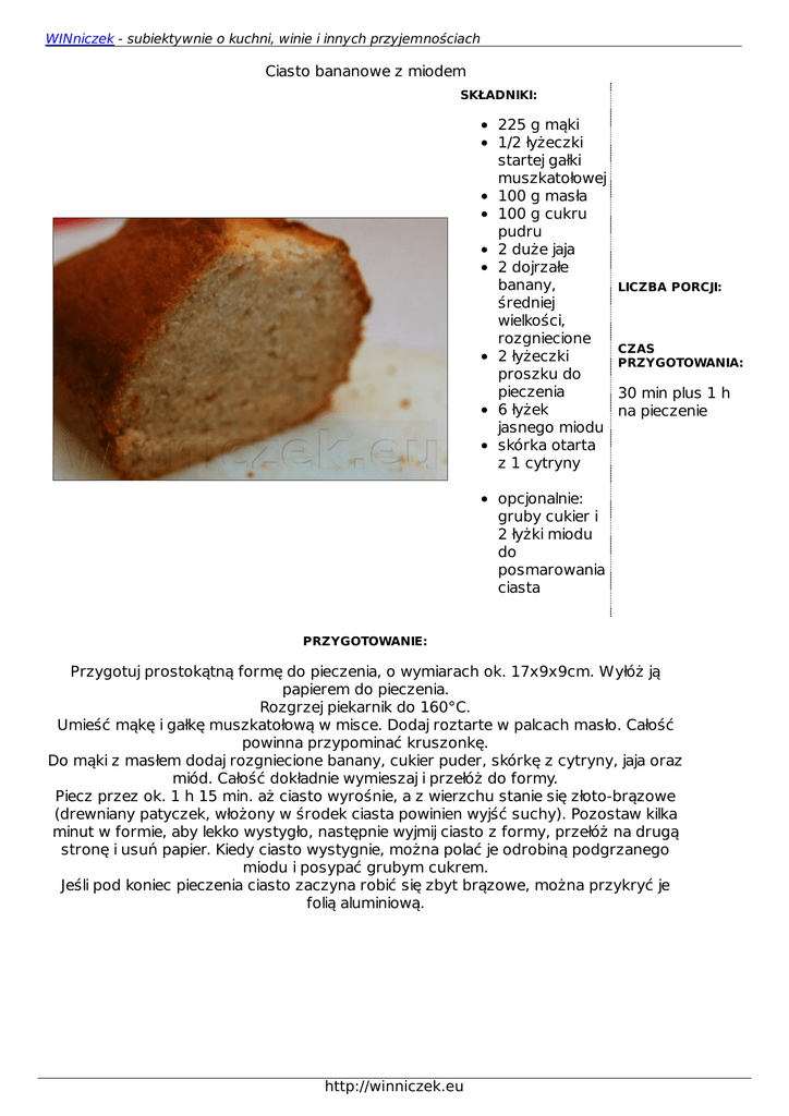 WINniczek - subiektywnie o kuchni, winie i innych przyjemnościach Ciasto bananowe z miodem SKŁADNIKI: 225 g mąki 1/2 łyżeczki startej gałki muszkatołowej 100 g masła 100 g cukru pudru 2 duże jaja 2 dojrzałe banany, średniej wielkości, rozgniecione 2 łyżeczki proszku do pieczenia 6 łyżek jasnego miodu skórka otarta z 1 cytryny LICZBA PORCJI: CZAS PRZYGOTOWANIA: 30 min plus 1 h na pieczenie opcjonalnie: gruby cukier i 2 łyżki miodu do posmarowania ciasta PRZYGOTOWANIE: Przygotuj prostokątną formę do pieczenia, o wymiarach ok. 17x9x9cm. Wyłóż ją papierem do pieczenia. Rozgrzej piekarnik do 160°C. Umieść mąkę i gałkę muszkatołową w misce. Dodaj roztarte w palcach masło. Całość powinna przypominać kruszonkę. Do mąki z masłem dodaj rozgniecione banany, cukier puder, skórkę z cytryny, jaja oraz miód. Całość dokładnie wymieszaj i przełóż do formy. Piecz przez ok. 1 h 15 min. aż ciasto wyrośnie, a z wierzchu stanie się złoto-brązowe (drewniany patyczek, włożony w środek ciasta powinien wyjść suchy). Pozostaw kilka minut w formie, aby lekko wystygło, następnie wyjmij ciasto z formy, przełóż na drugą stronę i usuń papier. Kiedy ciasto wystygnie, można polać je odrobiną podgrzanego miodu i posypać grubym cukrem. Jeśli pod koniec pieczenia ciasto zaczyna robić się zbyt brązowe, można przykryć je folią aluminiową. http://winniczek.eu WINniczek - subiektywnie o kuchni, winie i innych przyjemnościach Mary Berry, 100 Cakes and Bakes http://winniczek.eu