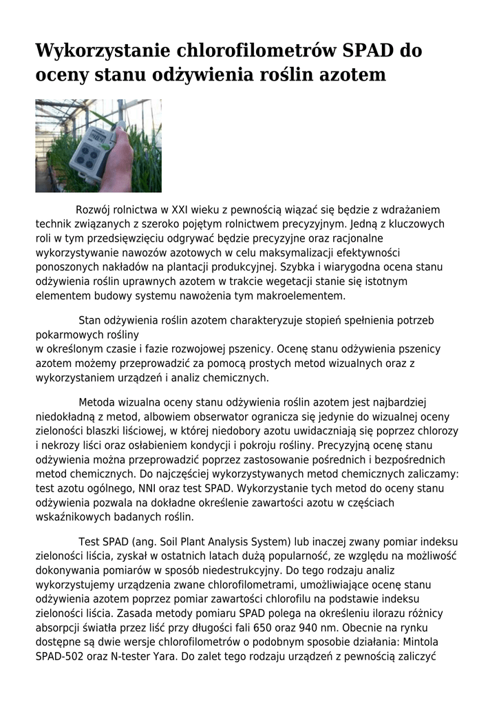 Wykorzystanie chlorofilometrów SPAD do oceny stanu odżywienia roślin azotem Rozwój rolnictwa w XXI wieku z pewnością wiązać się będzie z wdrażaniem technik związanych z szeroko pojętym rolnictwem precyzyjnym. Jedną z kluczowych roli w tym przedsięwzięciu odgrywać będzie precyzyjne oraz racjonalne wykorzystywanie nawozów azotowych w celu maksymalizacji efektywności ponoszonych nakładów na plantacji produkcyjnej. Szybka i wiarygodna ocena stanu odżywienia roślin uprawnych azotem w trakcie wegetacji stanie się istotnym elementem budowy systemu nawożenia tym makroelementem. Stan odżywienia roślin azotem charakteryzuje stopień spełnienia potrzeb pokarmowych rośliny w określonym czasie i fazie rozwojowej pszenicy. Ocenę stanu odżywienia pszenicy azotem możemy przeprowadzić za pomocą prostych metod wizualnych oraz z wykorzystaniem urządzeń i analiz chemicznych. Metoda wizualna oceny stanu odżywienia roślin azotem jest najbardziej niedokładną z metod, albowiem obserwator ogranicza się jedynie do wizualnej oceny zieloności blaszki liściowej, w której niedobory azotu uwidaczniają się poprzez chlorozy i nekrozy liści oraz osłabieniem kondycji i pokroju rośliny. Precyzyjną ocenę stanu odżywienia można przeprowadzić poprzez zastosowanie pośrednich i bezpośrednich metod chemicznych. Do najczęściej wykorzystywanych metod chemicznych zaliczamy: test azotu ogólnego, NNI oraz test SPAD. Wykorzystanie tych metod do oceny stanu odżywienia pozwala na dokładne określenie zawartości azotu w częściach wskaźnikowych badanych roślin. Test SPAD (ang. Soil Plant Analysis System) lub inaczej zwany pomiar indeksu zieloności liścia, zyskał w ostatnich latach dużą popularność, ze względu na możliwość dokonywania pomiarów w sposób niedestrukcyjny. Do tego rodzaju analiz wykorzystujemy urządzenia zwane chlorofilometrami, umożliwiające ocenę stanu odżywienia azotem poprzez pomiar zawartości chlorofilu na podstawie indeksu zieloności liścia. Zasada metody pomiaru SPAD polega na określeniu ilorazu różnicy absorpcji światła przez liść przy długości fali 650 oraz 940 nm. Obecnie na rynku dostępne są dwie wersje chlorofilometrów o podobnym sposobie działania: Mintola SPAD-502 oraz N-tester Yara. Do zalet tego rodzaju urządzeń z pewnością zaliczyć można: niewielkie rozmiary, możliwość dokonywania pomiarów w terenie dzięki bateryjnemu systemowi zasilania, krótki czas trwania pomiaru, prostotę dokonywania pomiarów oraz nieinwazyjność metody. Wartości odczytów SPAD określające intensywność zieloności liści są ściśle skorelowane ze stopniem odżywienia roślin azotem (NNI). Tak więc dzięki wykorzystaniu chlorofilometru SPAD można określić z dość dużą dokładnością stopień realizacji potrzeb pokarmowych roślin, jednakże istotne jest, aby taki pomiar przeprowadzić we właściwych wskaźnikowych fazach rozwojowych. W przypadku zbóż najwłaściwszym momentem przeprowadzania tego rodzaju pomiarów jest faza strzelanie w źdźbło (GS 31-39). Uważa się, iż właśnie w tej fazie rozwojowej obserwuje się największą stałość odczytów, a termin przeprowadzenia takich pomiarów w warunkach polowych pozwala na zastosowanie uzupełniającej dawki nawozów azotowych. Test SPAD można wykorzystać również do celów prognozowania wielkości oraz jakości plonu. Pomiary SPAD dokonywane w okresie kwitnienia pszenicy (GS 60) pozwalają określić z dużym prawdopodobieństwem zawartość białka w ziarnie zbóż. Jednakże analizy takie są dość skomplikowane i na chwilę obecną są elementem zainteresowań ośrodków naukowo-badawczych. Trudność związana z wykorzystaniem chlorofilometrow SPAD polega na tym, iż uzyskiwane na urządzeniu wyniki są wartościami niewymiarowymi i zależą od wielu zmiennych czynników, którymi są m.in.: gatunek, odmiana, faza rozwojowa rośliny, organ na którym dokonujemy pomiaru, natężenie promieniowania słonecznego, stresy biotyczne oraz abiotyczne oraz produktywność stanowiska. Tak więc wykorzystanie tych urządzeń w produkcji rolnej musi się wiązać z posiadaniem odpowiedniej wiedzy. W chwili obecnej urządzenia o których mowa są dość trudno dostępne i ich koszt należy liczyć w setkach złotych. Dlatego też na ich wykorzystanie mogą pozwolić sobie tylko wyspecjalizowane wysokotowarowe gospodarstwa rolne. Nie wątpię jednak, że z czasem upowszechnienie tej technologii pozwoli na ogólnodostępność tych urządzeń. Chlorofilometr Mintola SPAD-502, pomiar Indeksu Zieloności Liścia w pełni fazie kwitnienia pszenicy ozimej.