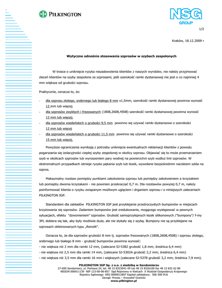 1/2 Kraków, 18.12.2009 r Wytyczne odnośnie stosowania szprosów w szybach zespolonych W trosce o uniknięcie ryzyka niezadowolenia klientów z naszych wyrobów, nie należy przyjmować zleceń klientów na szyby zespolone ze szprosami, jeśli szerokość ramki dystansowej nie jest o co najmniej 4 mm większa od grubości szprosu. Praktycznie, oznacza to, że: - dla szprosu złotego, srebrnego lub białego 8 mm x1,5mm, szerokość ramki dystansowej powinna wynosić 12 mm lub więcej; - dla szprosów zwykłych i frezowanych (1808,2608,4508) szerokość ramki dystansowej powinna wynosić 12 mm lub więcej; - dla szprosów wiedeńskich o grubości 9,5 mm powinno się używać ramki dystansowe o szerokości 12 mm lub więcej - dla szprosów wiedeńskich o grubości 11,5 mm powinno się używać ramki dystansowe o szerokości 15 mm lub więcej. Powyższe ograniczenia wynikają z potrzeby uniknięcia ewentualnych reklamacji klientów z powodu pogarszania się izolacyjności cieplej szyby zespolonej w okolicy szprosu. Objawiać się to może przemarzaniem szyb w okolicach szprosów lub wyroszeniem pary wodnej na powierzchni szyb wzdłuż linii szprosów. W ekstremalnych przypadkach istnieje ryzyko pękania szyb lub łezek, wywołane bezpośrednim naciskiem szkła na szpros. Maksymalny rozstaw pomiędzy punktami zakotwienia szprosu lub pomiędzy zakotwieniem a krzyżakiem lub pomiędzy dwoma krzyżakami - nie powinien przekraczać 0,7 m. Dla rozstawów powyżej 0,7 m, należy poinformować klienta o ryzyku związanym możliwym ugięciem i drganiem szprosu i o niniejszych zaleceniach PILKINGTON IGP. Standardem dla zakładów PILKINGTON IGP jest przyklejanie przeźroczystych bumponów w miejscach krzyżowania się szprosów. Zadaniem bumponów jest zredukowanie, mogącego występować w pewnych sytuacjach, efektu “dzwonieniem” szprosów. Grubość samoprzylepnych łezek silikonowych /”bumpony”/ f-my 3M, dobiera się tak, aby były możliwie duże, ale nie stykały się z szybą. Bumpony nie są przyklejane na szprosach okleinowanych typu „Renolit”. Oznacza to, że dla szprosów grubości 8 mm tj. szprosów frezowanych (1808,2608,4508) i szprosu złotego, srebrnego lub białego 8 mm - grubość bumponów powinna wynosić: - nie większa niż 2 mm dla ramki 12 mm, (zalecane SJ-5382 grubość 1,8 mm; średnica 6,4 mm) - nie większa niż 2,5 mm dla ramki 14 mm, (zalecane SJ-5302A grubość 2,2 mm; średnica 6,4 mm) - nie większa niż 3,5 mm dla ramki 16 mm i większych (zalecane SJ-5378 grubość 3,2 mm; średnica 7,9 mm). PILKINGTON IGP Sp. z o.o. z siedzibą w Sandomierzu 27-600 Sandomierz, ul. Portowa 24, tel. 48 15 8323041-49 lub 48 15 8326100 fax 48 15 832 62 89 REGON 006911139 NIP 123-00-06-857 Sąd Rejonowy w Kielcach X Wydział Gospodarczy Krajowego Rejestru Sądowego KRS 0000012897 Kapitał zakładowy: 506 500 PLN Zarząd: Prezes – Krzysztof Granicki www.pilkington.pl 2/2 Zamówienia na szyby, w których różnica grubości ramki dystansowej i szprosu będzie mniejsza niż 4 mm mogą być przyjmowane jedynie na odpowiedzialność klienta, po poinformowaniu go możliwych negatywnych skutkach takiego rozwiązania i przy zachowaniu w/w reguł doboru grubości łezek. . Opracował: Krzysztof Skarbiński Quality Manager Pilkington IGP Sp z o.o. mob. 48 601 506051 e-mail: [email protected] PILKINGTON IGP Sp. z o.o. z siedzibą w Sandomierzu 27-600 Sandomierz, ul. Portowa 24, tel. 48 15 8323041-49 lub 48 15 8326100 fax 48 15 832 62 89 REGON 006911139 NIP 123-00-06-857 Sąd Rejonowy w Kielcach X Wydział Gospodarczy Krajowego Rejestru Sądowego KRS 0000012897 Kapitał zakładowy: 506 500 PLN Zarząd: Prezes – Krzysztof Granicki www.pilkington.pl