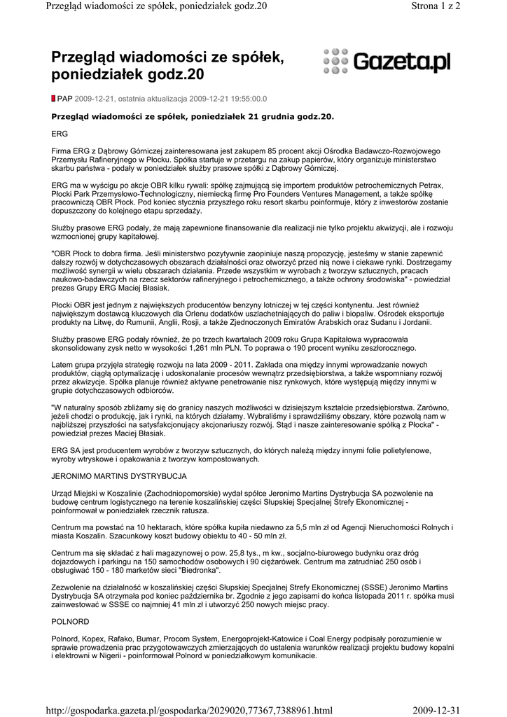 Przegląd wiadomości ze spółek, poniedziałek godz.20 Strona 1 z 2 Przegląd wiadomości ze spółek, poniedziałek godz.20 PAP 2009-12-21, ostatnia aktualizacja 2009-12-21 19:55:00.0 Przegląd wiadomości ze spółek, poniedziałek 21 grudnia godz.20. ERG Firma ERG z Dąbrowy Górniczej zainteresowana jest zakupem 85 procent akcji Ośrodka Badawczo-Rozwojowego Przemysłu Rafineryjnego w Płocku. Spółka startuje w przetargu na zakup papierów, który organizuje ministerstwo skarbu państwa - podały w poniedziałek służby prasowe spółki z Dąbrowy Górniczej. ERG ma w wyścigu po akcje OBR kilku rywali: spółkę zajmującą się importem produktów petrochemicznych Petrax, Płocki Park Przemysłowo-Technologiczny, niemiecką firmę Pro Founders Ventures Management, a także spółkę pracowniczą OBR Płock. Pod koniec stycznia przyszłego roku resort skarbu poinformuje, który z inwestorów zostanie dopuszczony do kolejnego etapu sprzedaży. Służby prasowe ERG podały, że mają zapewnione finansowanie dla realizacji nie tylko projektu akwizycji, ale i rozwoju wzmocnionej grupy kapitałowej. "OBR Płock to dobra firma. Jeśli ministerstwo pozytywnie zaopiniuje naszą propozycję, jesteśmy w stanie zapewnić dalszy rozwój w dotychczasowych obszarach działalności oraz otworzyć przed nią nowe i ciekawe rynki. Dostrzegamy możliwość synergii w wielu obszarach działania. Przede wszystkim w wyrobach z tworzyw sztucznych, pracach naukowo-badawczych na rzecz sektorów rafineryjnego i petrochemicznego, a także ochrony środowiska" - powiedział prezes Grupy ERG Maciej Błasiak. Płocki OBR jest jednym z największych producentów benzyny lotniczej w tej części kontynentu. Jest również największym dostawcą kluczowych dla Orlenu dodatków uszlachetniających do paliw i biopaliw. Ośrodek eksportuje produkty na Litwę, do Rumunii, Anglii, Rosji, a także Zjednoczonych Emiratów Arabskich oraz Sudanu i Jordanii. Służby prasowe ERG podały również, że po trzech kwartałach 2009 roku Grupa Kapitałowa wypracowała skonsolidowany zysk netto w wysokości 1,261 mln PLN. To poprawa o 190 procent wyniku zeszłorocznego. Latem grupa przyjęła strategię rozwoju na lata 2009 - 2011. Zakłada ona między innymi wprowadzanie nowych produktów, ciągłą optymalizację i udoskonalanie procesów wewnątrz przedsiębiorstwa, a także wspomniany rozwój przez akwizycje. Spółka planuje również aktywne penetrowanie nisz rynkowych, które występują między innymi w grupie dotychczasowych odbiorców. "W naturalny sposób zbliżamy się do granicy naszych możliwości w dzisiejszym kształcie przedsiębiorstwa. Zarówno, jeżeli chodzi o produkcję, jak i rynki, na których działamy. Wybraliśmy i sprawdziliśmy obszary, które pozwolą nam w najbliższej przyszłości na satysfakcjonujący akcjonariuszy rozwój. Stąd i nasze zainteresowanie spółką z Płocka" powiedział prezes Maciej Błasiak. ERG SA jest producentem wyrobów z tworzyw sztucznych, do których należą między innymi folie polietylenowe, wyroby wtryskowe i opakowania z tworzyw kompostowanych. JERONIMO MARTINS DYSTRYBUCJA Urząd Miejski w Koszalinie (Zachodniopomorskie) wydał spółce Jeronimo Martins Dystrybucja SA pozwolenie na budowę centrum logistycznego na terenie koszalińskiej części Słupskiej Specjalnej Strefy Ekonomicznej poinformował w poniedziałek rzecznik ratusza. Centrum ma powstać na 10 hektarach, które spółka kupiła niedawno za 5,5 mln zł od Agencji Nieruchomości Rolnych i miasta Koszalin. Szacunkowy koszt budowy obiektu to 40 - 50 mln zł. Centrum ma się składać z hali magazynowej o pow. 25,8 tys., m kw., socjalno-biurowego budynku oraz dróg dojazdowych i parkingu na 150 samochodów osobowych i 90 ciężarówek. Centrum ma zatrudniać 250 osób i obsługiwać 150 - 180 marketów sieci "Biedronka". Zezwolenie na działalność w koszalińskiej części Słupskiej Specjalnej Strefy Ekonomicznej (SSSE) Jeronimo Martins Dystrybucja SA otrzymała pod koniec października br. Zgodnie z jego zapisami do końca listopada 2011 r. spółka musi zainwestować w SSSE co najmniej 41 mln zł i utworzyć 250 nowych miejsc pracy. POLNORD Polnord, Kopex, Rafako, Bumar, Procom System, Energoprojekt-Katowice i Coal Energy podpisały porozumienie w sprawie prowadzenia prac przygotowawczych zmierzających do ustalenia warunków realizacji projektu budowy kopalni i elektrowni w Nigerii - poinformował Polnord w poniedziałkowym komunikacie. http://gospodarka.gazeta.pl/gospodarka/2029020,77367,7388961.html 2009-12-31 Przegląd wiadomości ze spółek, poniedziałek godz.20 Strona 2 z 2 "Projekt dotyczy wybudowania przez polskie firmy na terenie Nigerii kopalni na istniejącym złożu węgla oraz elektrowni węglowej o mocy min. 2.000 MW wraz z niezbędną infrastrukturą energetyczną oraz innych elektrowni" - napisano w komunikacie. "Strony wyrażają wolę podjęcia niezbędnych działań przygotowawczych zmierzających do zagwarantowania im uczestnictwa w realizacji przedmiotowego projektu. W przypadku osiągnięcia tego celu, strony deklarują gotowość zawiązania konsorcjum" - dodano. PAP Tekst pochodzi z portalu Gazeta.pl - www.gazeta.pl © Agora SA http://gospodarka.gazeta.pl/gospodarka/2029020,77367,7388961.html 2009-12-31