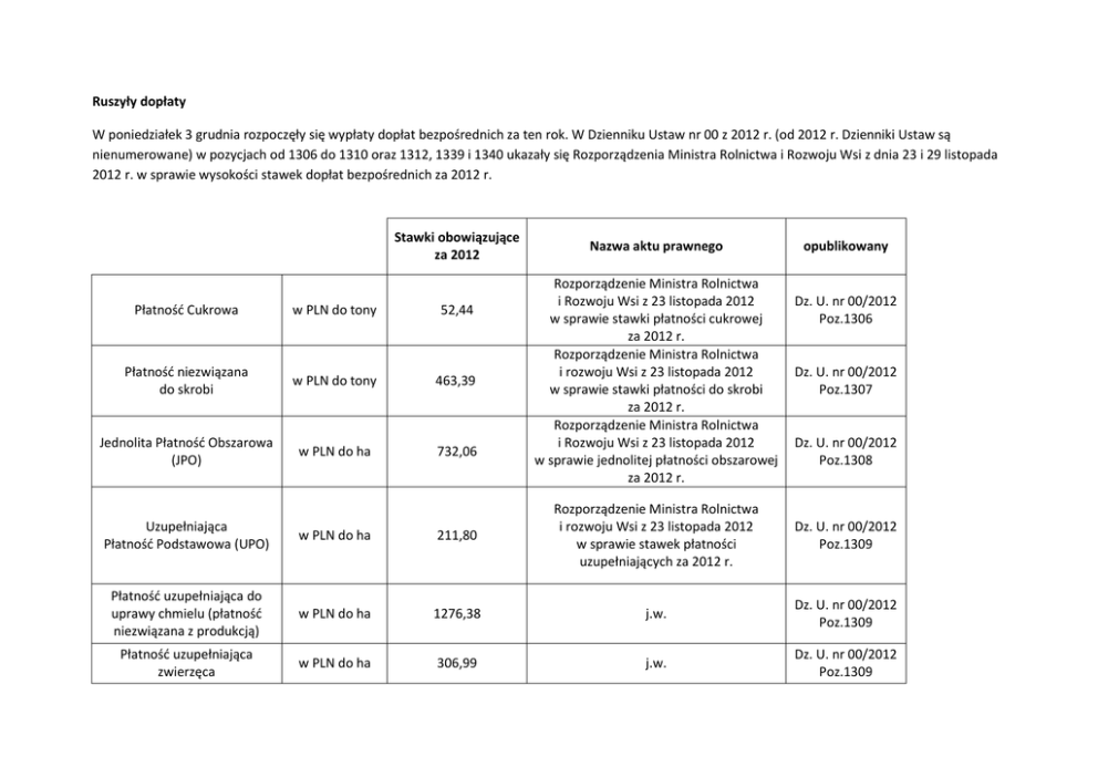 Ruszyły dopłaty W poniedziałek 3 grudnia rozpoczęły się wypłaty dopłat bezpośrednich za ten rok. W Dzienniku Ustaw nr 00 z 2012 r. (od 2012 r. Dzienniki Ustaw są nienumerowane) w pozycjach od 1306 do 1310 oraz 1312, 1339 i 1340 ukazały się Rozporządzenia Ministra Rolnictwa i Rozwoju Wsi z dnia 23 i 29 listopada 2012 r. w sprawie wysokości stawek dopłat bezpośrednich za 2012 r. Stawki obowiązujące za 2012 Płatność Cukrowa w PLN do tony 52,44 Płatność niezwiązana do skrobi w PLN do tony 463,39 Jednolita Płatność Obszarowa (JPO) w PLN do ha 732,06 Nazwa aktu prawnego Rozporządzenie Ministra Rolnictwa i Rozwoju Wsi z 23 listopada 2012 w sprawie stawki płatności cukrowej za 2012 r. Rozporządzenie Ministra Rolnictwa i rozwoju Wsi z 23 listopada 2012 w sprawie stawki płatności do skrobi za 2012 r. Rozporządzenie Ministra Rolnictwa i Rozwoju Wsi z 23 listopada 2012 w sprawie jednolitej płatności obszarowej za 2012 r. opublikowany Dz. U. nr 00/2012 Poz.1306 Dz. U. nr 00/2012 Poz.1307 Dz. U. nr 00/2012 Poz.1308 211,80 Rozporządzenie Ministra Rolnictwa i rozwoju Wsi z 23 listopada 2012 w sprawie stawek płatności uzupełniających za 2012 r. Dz. U. nr 00/2012 Poz.1309 w PLN do ha 1276,38 j.w. Dz. U. nr 00/2012 Poz.1309 w PLN do ha 306,99 j.w. Dz. U. nr 00/2012 Poz.1309 Uzupełniająca Płatność Podstawowa (UPO) w PLN do ha Płatność uzupełniająca do uprawy chmielu (płatność niezwiązana z produkcją) Płatność uzupełniająca zwierzęca w PLN do kg Płatność niezwiązana do tytoniu w PLN do kg Oddzielna płatność do owoców i warzyw (do pomidorów) w PLN do tony 5,62 tytoń jasny z grupy odm. Virginia Rozporządzenie Ministra Rolnictwa i rozwoju Wsi z 23 listopada 2012 w sprawie stawki płatności niezwiązanej do tytoniu za 2012r 3,93 tytoń jasny odm. Burley,tytoń ciemny suszony powietrzem i ciemny suszony powietrzem z możliwością dosuszania i wędzenia j.w Dz. U. nr 00/2012 Poz.1310 162,09 Rozporządzenie Ministra Rolnictwa i rozwoju Wsi z 23 listopada 2012 w sprawie stawki płatności do pomidorów za 2012 r. Dz. U. nr 00/2012 Poz.1312 Dz. U. nr 00/2012 Poz.1339 Dz. U. nr 00/2012 Poz.1339 Specjalna płatność do powierzchni upraw strączkowych i motylkowych drobnonasiennych uprawianych w plonie głównym W PLN do ha 672,56 Rozporządzenie Ministra Rolnictwa i rozwoju Wsi z 29 listopada 2012 w sprawie stawek wsparcia specjalnego za 2012 r. Specjalna płatność do krów W PLN za sztukę samicy gat. bydło domowe 584,79 j.w Dz. U. nr 00/2012 Poz.1310 Specjalna płatność do owiec W PLN za sztukę samicy gat. owca domowa Oddzielna płatność do owoców miękkich Regina Hołda DODR we Wrocławiu W PLN do ha 123,11 j.w Dz. U. nr 00/2012 Poz.1339 2670,66 Rozporządzenie Ministra Rolnictwa i rozwoju Wsi z 29 listopada 2012 w sprawie stawki oddzielnej płatności do owoców miękkich za 2012 r. Dz. U. nr 00/2012 Poz.1340