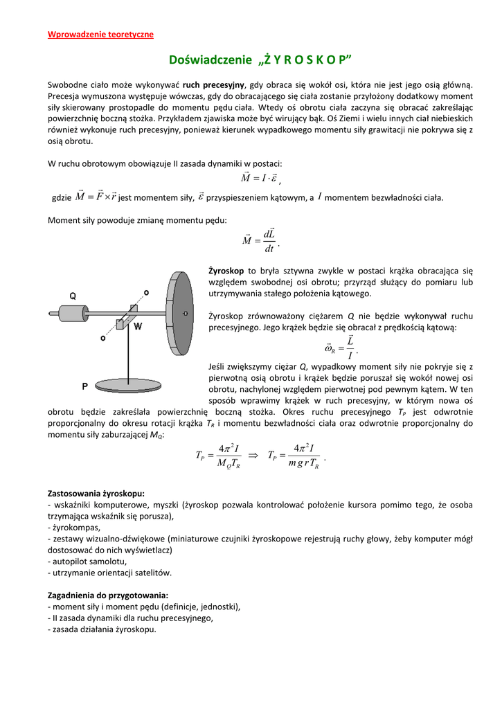 Wprowadzenie teoretyczne Doświadczenie „Ż Y R O S K O P” Swobodne ciało może wykonywać ruch precesyjny, gdy obraca się wokół osi, która nie jest jego osią główną. Precesja wymuszona występuje wówczas, gdy do obracającego się ciała zostanie przyłożony dodatkowy moment siły skierowany prostopadle do momentu pędu ciała. Wtedy oś obrotu ciała zaczyna się obracać zakreślając powierzchnię boczną stożka. Przykładem zjawiska może być wirujący bąk. Oś Ziemi i wielu innych ciał niebieskich również wykonuje ruch precesyjny, ponieważ kierunek wypadkowego momentu siły grawitacji nie pokrywa się z osią obrotu. W ruchu obrotowym obowiązuje II zasada dynamiki w postaci: M I , gdzie M F r jest momentem siły, przyspieszeniem kątowym, a I momentem bezwładności ciała. Moment siły powoduje zmianę momentu pędu: dL M . dt Żyroskop to bryła sztywna zwykle w postaci krążka obracająca się względem swobodnej osi obrotu; przyrząd służący do pomiaru lub utrzymywania stałego położenia kątowego. Żyroskop zrównoważony ciężarem Q nie będzie wykonywał ruchu precesyjnego. Jego krążek będzie się obracał z prędkością kątową: L R . I Jeśli zwiększymy ciężar Q, wypadkowy moment siły nie pokryje się z pierwotną osią obrotu i krążek będzie poruszał się wokół nowej osi obrotu, nachylonej względem pierwotnej pod pewnym kątem. W ten sposób wprawimy krążek w ruch precesyjny, w którym nowa oś obrotu będzie zakreślała powierzchnię boczną stożka. Okres ruchu precesyjnego TP jest odwrotnie proporcjonalny do okresu rotacji krążka TR i momentu bezwładności ciała oraz odwrotnie proporcjonalny do momentu siły zaburzającej MQ: 4 2 I 4 2 I TP TP . M QTR m g r TR Zastosowania żyroskopu: - wskaźniki komputerowe, myszki (żyroskop pozwala kontrolować położenie kursora pomimo tego, że osoba trzymająca wskaźnik się porusza), - żyrokompas, - zestawy wizualno-dźwiękowe (miniaturowe czujniki żyroskopowe rejestrują ruchy głowy, żeby komputer mógł dostosować do nich wyświetlacz) - autopilot samolotu, - utrzymanie orientacji satelitów. Zagadnienia do przygotowania: - moment siły i moment pędu (definicje, jednostki), - II zasada dynamiki dla ruchu precesyjnego, - zasada działania żyroskopu. Szablon metodyczny „Ż Y R O S K O P” Student 1: Wyznaczanie momentu bezwładności dysku metodą żyroskopową Student 2: Sprawdzanie II zasady dynamiki dla ruchu precesyjnego Baza teoretyczna Okres ruchu precesyjnego żyroskopu jest odwrotnie proporcjonalny do okresu rotacji i momentu bezwładności krążka oraz odwrotnie proporcjonalny do momentu przyłożonej siły zaburzającej: 4 2 I TP m g r TR TP – okres ruchu precesyjnego TR – okres rotacji krążka I – moment bezwładności krążka m – masa zaburzająca r – ramię siły zaburzającej Zatem, w celu wyznaczenia momentu bezwładności krążka należy: - zrównoważyć żyroskop stosując przeciwwagę, - wprawić żyroskop w ruch obrotowy, - przytrzymując oś poziomą zmierzyć okres rotacji krążka TR, - w czasie trwania ruchu rotacyjnego zawiesić masę zaburzającą m, zwolnić oś i zmierzyć okres precesji TP, - przeprowadzić pomiary zależności okresu rotacji krążka żyroskopu TR od okresu precesji TP dla różnych mas, 2 - sporządzić wykres zależności TP od 4 I - - Zatem, aby sprawdzić II zasadę dynamiki dla ruchu precesyjnego należy: zrównoważyć żyroskop stosując przeciwwagę, wprawić żyroskop w ruch obrotowy, przytrzymując oś poziomą zmierzyć okres rotacji krążka TR, w czasie trwania ruchu rotacyjnego zawiesić masę zaburzającą m, zwolnić oś i zmierzyć okres precesji T P, przeprowadzić pomiary zależności okresu rotacji krążka żyroskopu TR od okresu precesji TP dla różnych mas, - sporządzić wykresy zależności TP od 1 , m r TR m g r TR - obliczyć na nim wartość momentu bezwładności krążka i porównać z wartością teoretyczną. - zanalizować jego liniowość. Wskazówki do sprawozdania – wyznaczanie „Ż Y R O S K O P” Student 1: Wyznaczanie momentu bezwładności dysku metodą żyroskopową I. Metodyka (ideowy plan ćwiczenia) II. Przebieg ćwiczenia II.1. Przebieg czynności II.2. Szkic układu pomiarowego III. Wyniki III.1.Wyniki pomiarów 1 TP [s] TR [s] m [kg] [kg] m TP = ... TR = ... 2 3 4 r = ... r = … 5 6 7 mk = mk = 8 9 10 Rk = Rk = III.2. Obliczenia (przykładowe – odnoszą się np. do pomiaru nr 3) 4 2 ... m g r TR 4 2 4 2 4 2 4 2 2 m r TR ... 2 m g r TR m g r TR m g r 2 TR m g r TR (Studenci II roku wyprowadzają ten wzór z różniczki zupełnej krok po kroku) I teoretyczne ... Iteoretyczne 12 Rk mk mk Rk Rk ... 2 (Studenci II roku wyprowadzają ten wzór z różniczki zupełnej krok po kroku) III.3. Wyniki obliczeń 1 TP 4 2 m g r TR 4 2 m g r TR 2 3 4 5 6 [s] [...] [...] TP = ... III.4. Wykres + obliczenie wyniku na wykresie (wszystko ołówkiem!) IV. Podsumowanie Wyznaczona wartość momentu bezwładności krążka wynosi ... Wartość teoretyczna momentu bezwładności krążka wynosi ... Dokładność metody dynamicznej: ... Dokładność metody statycznej: ... Dodatkowe wnioski, spostrzeżenia, przyczyny niepewności pomiarowych. 7 8 9 10 Wskazówki do sprawozdania – sprawdzanie „Ż Y R O S K O P” Student 2: Sprawdzanie II zasady dynamiki dla ruchu precesyjnego I. Metodyka (ideowy plan ćwiczenia) II. Przebieg ćwiczenia II.1. Przebieg czynności II.2. Szkic układu pomiarowego III. Wyniki III.1.Wyniki pomiarów 1 TP [s] TR [s] m [kg] [kg] m TP = ... TR = ... 2 3 4 5 6 7 8 9 10 r = ... r = … III.2. Obliczenia (przykładowe – odnoszą się np. do pomiaru nr 3) 1 ... m r TR TR 1 m r ... m r TR m 2 rTR mr 2TR mrTR 2 (Studenci II roku wyprowadzają ten wzór z różniczki zupełnej krok po kroku) III.3. Wyniki obliczeń 1 TP 1 m r TR 1 m r TR 2 3 4 5 6 7 8 9 10 [s] [...] [...] TP = ... III.4. Wykres IV. Podsumowanie Ponieważ na wykresie ... można poprow