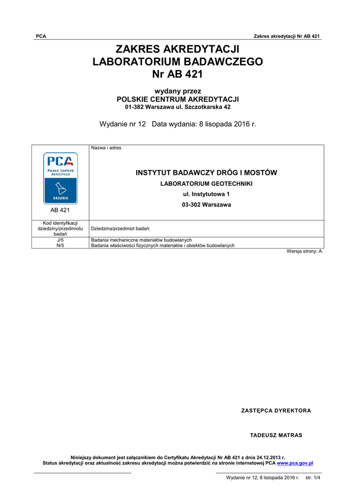 PCA Zakres akredytacji Nr AB 421 ZAKRES AKREDYTACJI LABORATORIUM BADAWCZEGO Nr AB 421 wydany przez POLSKIE CENTRUM AKREDYTACJI 01-382 Warszawa ul. Szczotkarska 42 Wydanie nr 12 Data wydania: 8 lisopada 2016 r. Nazwa i adres INSTYTUT BADAWCZY DRÓG I MOSTÓW LABORATORIUM GEOTECHNIKI ul. Instytutowa 1 03-302 Warszawa AB 421 Kod identyfikacji dziedziny/przedmiotu badań J/5 N/5 Dziedzina/przedmiot badań: Badania mechaniczne materiałów budowlanych Badania właściwości fizycznych materiałów i obiektów budowlanych Wersja strony: A ZASTĘPCA DYREKTORA TADEUSZ MATRAS Niniejszy dokument jest załącznikiem do Certyfikatu Akredytacji Nr AB 421 z dnia 24.12.2013 r. Status akredytacji oraz aktualność zakresu akredytacji można potwierdzić na stronie internetowej PCA www.pca.gov.pl Wydanie nr 12, 8 listopada 2016 r. str. 1/4 PCA Laboratorium Geotechniki ul. Instytutowa 1; 03-302 Warszawa Rodzaj działalności/badane Przedmiot badań/wyrób cechy/metoda Grunty Uziarnienie Zakres: (0- 0,063) mm Metoda: analiza areometryczna Zakres: (0,063-40) mm Metoda: analiza sitowa Wilgotność optymalna Maksymalna gęstość objętościowa szkieletu gruntowego Zakres: (0,70 – 3,50) g/cm3 Metoda: Proctora Wskaźnik zagęszczenia IS Stopień zagęszczenia ID Zakres: IS: (0,85 - 1,10) ID: (0.1 - 1,0) Metoda: sonda dynamiczna DPL Wskaźnik nośności Zakres: (0 – 100) Wskaźnik piaskowy Zakres: (0 – 4) mm Kruszywa Mrozoodporność Zakres: (8 – 63) mm Metoda: bezpośrednia Wskaźnik płaskości Zakres: (1 – 30) % Metoda: sit prętowych Wskaźnik kształtu Zakres: (4 – 80) mm Metoda: suwmiarką Schulza Odporność na rozdrabnianie Zakres: (4 – 50) mm Metoda: Los Angeles Odporność na ścieranie Zakres: (1 – 40) % Metoda: mikro Deval Skład ziarnowy Zakres: (0-63) mm Skład ziarnowy Zakres: (0-80) mm Warstwy konstrukcyjne nawierzchni Moduł odkształcenia Zakres obciążenia: (0,01 – 0,45) MPa Metoda: obciążenie płytą VSS Zakres akredytacji Nr AB 421 Dokumenty odniesienia PN-B-04481:1988 PN-B-04481:1988 PB/TG-1/2:2005 wyd. 1 z dnia 11.01.2005 r. PN-S-02205:1998 zał. A PN-EN 933-8:2001 PN-B-06714-19:1978 PN-EN 933-3:1999+A1:2004 PN-EN 933-4:2008 PN-EN 1097-2:2000+A1:2004 PN-EN 1097-1:2000+A1:2004 PN-EN 933-1: 2000 PN-EN 933-1: 2000/A1:2006 PN-EN 13450:2004 PB/TG-1/1:2002 wyd. 5 z dnia 10.10.2002 r. Wersja strony: A Wydanie nr 12, 8 listopada 2016 r. str. 2/4 PCA Zakres akredytacji Nr AB 421 Przedmiot badań/wyrób Izolacje przeciwwodne Rodzaj działalności/badane cechy/metoda Maksymalna siła rozciągająca Zakres siły: (0,1 – 10) kN Metoda: rozciągania bezpośredniego Wydłużenie przy maksymalnej sile rozciągającej Zakres siły: (0,1 – 10) kN Metoda: rozciągania bezpośredniego Siła zrywająca przy rozdzieraniu Zakres siły: (0,1 – 10) kN Metoda: rozciągania bezpośredniego Wytrzymałość na ścinanie styków arkuszy papy Zakres siły: (0,1 – 10) kN Metoda: rozciągania bezpośredniego Dokumenty odniesienia PN-EN 12311-1:2001 PN-EN 12311-1:2001 PB/TM-1/4:2013 wyd. 4 z dnia 12.12.2013 r. PB/TM-1/9:2013 wyd. 5 z dnia 12.12.2013 r. Wersja strony: A Wydanie nr 12, 8 listopada 2016 r. str. 3/4 PCA Zakres akredytacji Nr AB 421 Wykaz zmian Zakresu Akredytacji Nr AB 421 Status zmian: wersja pierwotna – A Zatwierdzam status zmian ZASTĘPCA DYREKTORA HOLOGRAM HOLOGRAM HOLOGRAM HOLOGRAM TADEUSZ MATRAS dnia: 08.11.2016 r. Wydanie nr 12, 8 listopada 2016 r. str. 4/4