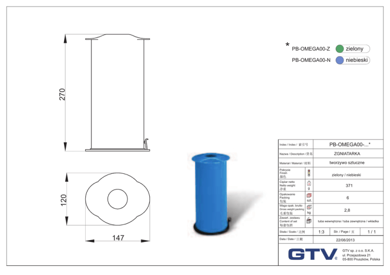 * PB-OMEGA00-Z niebieski 270 PB-OMEGA00-N zielony PB-OMEGA00-...* Index / Index / ZGNIATARKA Nazwa / Description / tworzywo sztuczne Materia³ / Material / Pokrycie Finish Ciê¿ar netto Netto weight zielony / niebieski g 371 g 120 Opakowanie Packing Waga opak. brutto 6 szt. kg Gross weight packing 2,8 kg 147 Zawart. zestawu Content of set tuba wewnêtrzna / tuba zewnêtrzna / wk³adka Skala / Scale / 1:3 Data / Date / Str. / Page / 1/1 22/08/2013 GTV sp. z o.o. S.K.A. ul. Przejazdowa 21 05-800 Pruszków, Polska