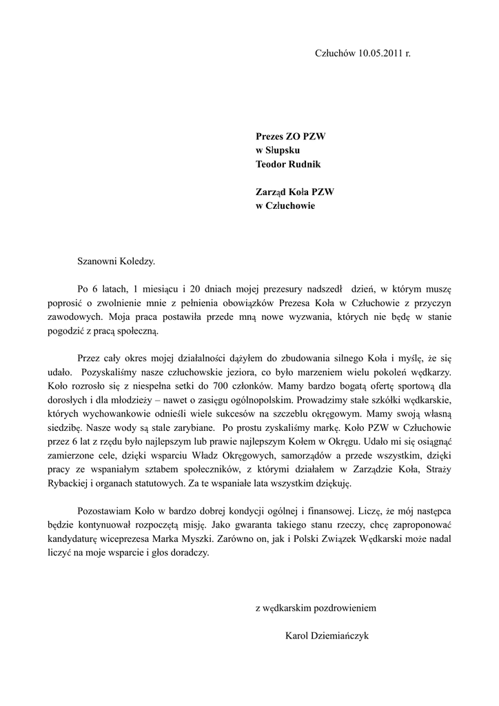 Człuchów 10.05.2011 r. Prezes ZO PZW w Słupsku Teodor Rudnik Zarząd Koła PZW w Człuchowie Szanowni Koledzy. Po 6 latach, 1 miesiącu i 20 dniach mojej prezesury nadszedł dzień, w którym muszę poprosić o zwolnienie mnie z pełnienia obowiązków Prezesa Koła w Człuchowie z przyczyn zawodowych. Moja praca postawiła przede mną nowe wyzwania, których nie będę w stanie pogodzić z pracą społeczną. Przez cały okres mojej działalności dążyłem do zbudowania silnego Koła i myślę, że się udało. Pozyskaliśmy nasze człuchowskie jeziora, co było marzeniem wielu pokoleń wędkarzy. Koło rozrosło się z niespełna setki do 700 członków. Mamy bardzo bogatą ofertę sportową dla dorosłych i dla młodzieży – nawet o zasięgu ogólnopolskim. Prowadzimy stałe szkółki wędkarskie, których wychowankowie odnieśli wiele sukcesów na szczeblu okręgowym. Mamy swoją własną siedzibę. Nasze wody są stale zarybiane. Po prostu zyskaliśmy markę. Koło PZW w Człuchowie przez 6 lat z rzędu było najlepszym lub prawie najlepszym Kołem w Okręgu. Udało mi się osiągnąć zamierzone cele, dzięki wsparciu Władz Okręgowych, samorządów a przede wszystkim, dzięki pracy ze wspaniałym sztabem społeczników, z którymi działałem w Zarządzie Koła, Straży Rybackiej i organach statutowych. Za te wspaniałe lata wszystkim dziękuję. Pozostawiam Koło w bardzo dobrej kondycji ogólnej i finansowej. Liczę, że mój następca będzie kontynuował rozpoczętą misję. Jako gwaranta takiego stanu rzeczy, chcę zaproponować kandydaturę wiceprezesa Marka Myszki. Zarówno on, jak i Polski Związek Wędkarski może nadal liczyć na moje wsparcie i głos doradczy. z wędkarskim pozdrowieniem Karol Dziemiańczyk