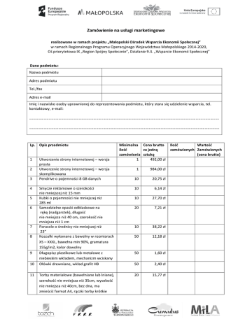 Zamówienie na usługi marketingowe realizowane w ramach projektu „Małopolski Ośrodek Wsparcia Ekonomii Społecznej” w ramach Regionalnego Programu Operacyjnego Województwa Małopolskiego 2014-2020, Oś priorytetowa IX „Region Spójny Społecznie”, Działanie 9.3. „Wsparcie Ekonomii Społecznej” Dane podmiotu: Nazwa podmiotu Adres podmiotu Tel./fax Adres e-mail Imię i nazwisko osoby uprawnionej do reprezentowania podmiotu, który stara się udzielenie wsparcia, tel. kontaktowy, e-mail: …………………………………………………………………………………………………………………………………………………………………………… ……………………………………………………………………………………………………………………………………………….……..…………………… Lp. Opis przedmiotu 1 2 3 4 5 6 7 8 9 10 11 Utworzenie strony internetowej – wersja prosta Utworzenie strony internetowej – wersja skomplikowana Pendrive o pojemności 8 GB danych Minimalna Cena brutto ilość za jedną zamówienia sztukę 1 492,00 zł 1 984,00 zł 10 20,75 zł Smycze reklamowe o szerokości nie mniejszej niż 15 mm Kubki o pojemności nie mniejszej niż 285 ml Samodzielne opaski odblaskowe na rękę (nadgarstek), długośd nie mniejsza niż 40 cm, szerokośd nie mniejsza niż 1 cm Parasole o średnicy nie mniejszej niż 23” Koszulki wykonane z bawełny w rozmiarach XS – XXXL, bawełna min 90%, gramatura 155g/m2, kolor dowolny Długopisy plastikowe lub metalowe z niebieskim wkładem, mechanizm wciskany Ołówki drewniane, wkład grafit HB 10 6,14 zł 10 27,70 zł 20 7,21 zł 10 38,22 zł 50 12,18 zł 50 1,60 zł 50 2,40 zł Torby materiałowe (bawełniane lub lniane), szerokośd nie mniejsza niż 35cm, wysokośd nie mniejsza niż 40cm, bez dna, ma zmieścid format A4, rączki torby krótkie 20 15,77 zł Ilość Wartość zamówionych Zamówionych (cena brutto) 12 13 14 15 16 17 18 19 20 2,5x33cm lub długie 2,5x63cm, uchwyty wzmocnione krzyżykowym szwem Plakat reklamowy format A3, kolor 4+0, papier kreda mat/błysk lub papier offset + folia UV na całości, granulacja papieru 135 g; Ulotka reklamowa format A5 złamana do DL, kolor 4+4, papier kreda mat/błysk lub papier offset + folia UV na całości, gramatura papieru 135 g; Teczka kartonowa na dokumenty, format A4, zamykana na gumkę, papier 350 g, Wizytówka dwustronna o wymiarach 90x50 mm, kolor 4+0, papier kreda mat/błysk; Kalendarz format A4, jedno-stronnicowy, projekt graficzny wskazany przez Podmiot Ekonomii Społecznej, wydruk kolor 4+4, papier kreda mat/błysk lub papier offset + folia UV na całości, gramatura papieru 135 g; Kalendarz biurkowy format A5, 12 pełnokolorowych stron z dowolną grafiką lub zdjęciem, kalendarium 1 miesiąc na stronie dopasowane do zdjęd, druk 4+0 lub 4+4, spirala biała lakierowana, podstawka z zadrukiem lub bez, karton 270 g Notes format A5 – o ilości 80 kartek w kratkę lub czyste, papier 80 g; Baner reklamowy o wymiarach 200x100cm, laminowany, PCV, gramatura nie mniejsza niż 510g; Rollup jednostronny z nadrukiem 4+0 zgodniez wytycznymi zamawiającego o wymiarach 100x200 cm 50 1,23 zł 300 0,64 zł 100 3,06 zł 200 0,15 zł 100 1,00 zł 100 1,80 zł 20 11,00 zł 1 60,00 zł 1 150, 00 zł Razem ………………………….. miejscowośd, data …………………………………………….... pieczęd podmiotu ………………….…….………..………………… pieczątka i podpis osoby/ób uprawnionej/ych do reprezentacji podmiotu, zgodnie z KRS
