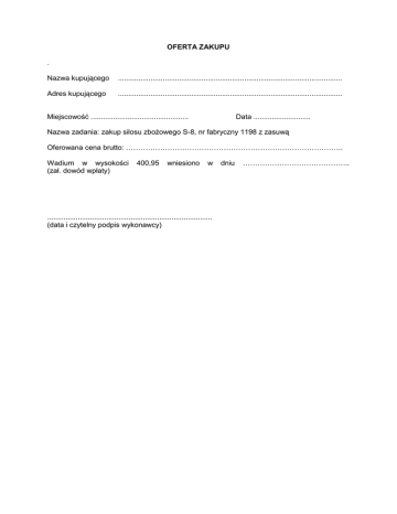 OFERTA ZAKUPU . Nazwa kupującego .............................................................................................................. Adres kupującego .............................................................................................................. Miejscowość ................................................ Data ............................ Nazwa zadania: zakup silosu zbożowego S-8, nr fabryczny 1198 z zasuwą Oferowana cena brutto: …………………………………………………………………………….. Wadium w wysokości (zał. dowód wpłaty) 400,95 wniesiono w ................................................................................. (data i czytelny podpis wykonawcy) dniu ……………………………………..