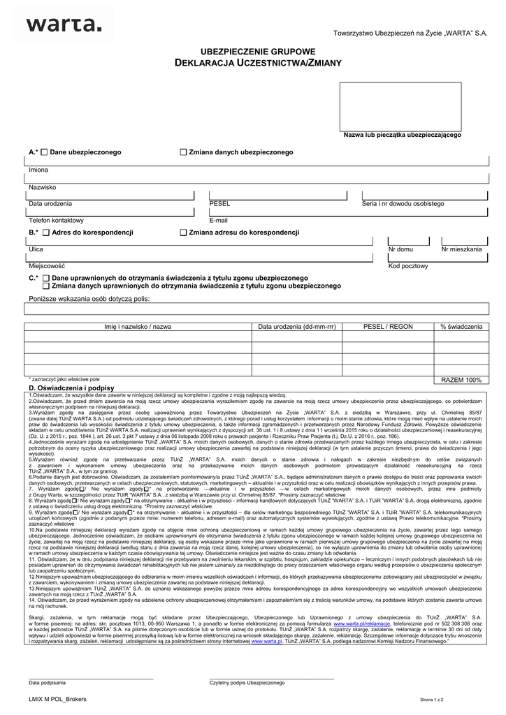 Towarzystwo Ubezpieczeń na Życie „WARTA” S.A. UBEZPIECZENIE GRUPOWE DEKLARACJA UCZESTNICTWA/ZMIANY Nazwa lub pieczątka ubezpieczającego A.* Dane ubezpieczonego Zmiana danych ubezpieczonego Imiona Nazwisko Data urodzenia PESEL Telefon kontaktowy E-mail B.* Adres do korespondencji Seria i nr dowodu osobistego Zmiana adresu do korespondencji Ulica Nr domu Miejscowość Kod pocztowy C.* Nr mieszkania Dane uprawnionych do otrzymania świadczenia z tytułu zgonu ubezpieczonego Zmiana danych uprawnionych do otrzymania świadczenia z tytułu zgonu ubezpieczonego Poniższe wskazania osób dotyczą polis: Imię i nazwisko / nazwa Data urodzenia (dd-mm-rrr) * zaznaczyć jako właściwe pole PESEL / REGON % świadczenia RAZEM 100% D. Oświadczenia i podpisy 1.Oświadczam, że wszystkie dane zawarte w niniejszej deklaracji są kompletne i zgodne z moją najlepszą wiedzą. 2.Oświadczam, że przed dniem zawarcia na moją rzecz umowy ubezpieczenia wyraziłem/am zgodę na zawarcie na moją rzecz umowy ubezpieczenia przez ubezpieczającego, co potwierdzam własnoręcznym podpisem na niniejszej deklaracji. 3.Wyrażam zgodę na zasięganie przez osobę upoważnioną przez Towarzystwo Ubezpieczeń na Życie „WARTA” S.A. z siedzibą w Warszawi e, przy ul. Chmielnej 85/87 (zwane dalej TUnŻ WARTA S.A.) od podmiotu udzielającego świadczeń zdrowotnych, z którego porad i usług korzystałem informacji o moim stanie zdrowia, które mogą mieć wpływ na ustalenie moich praw do świadczenia lub wysokości świadczenia z tytułu umowy ubezpieczenia, a także informacji zgromadzonych i przetwarzanych przez Narodowy Fundusz Zdrowia. Powyższe oświadczenie składam w celu umożliwienia TUnŻ WARTA S.A. realizacji uprawnień wynikających z dyspozycji art. 38 ust. 1 i 8 ustawy z dnia 11 września 2015 roku o działalności ubezpieczeniowej i reasekuracyjnej (Dz. U. z 2015 r., poz. 1844.), art. 26 ust. 3 pkt 7 ustawy z dnia 06 listopada 2008 roku o prawach pacjenta i Rzeczniku Praw Pacjenta (t.j. Dz.U. z 2016 r., poz. 186). 4.Jednocześnie wyrażam zgodę na udostępnienie TUnŻ „WARTA” S.A. moich danych osobowych, danych o stanie zdrowia przetwarzanych przez każdego innego ubezpieczyciela, w celu i zakresie potrzebnym do oceny ryzyka ubezpieczeniowego oraz realizacji umowy ubezpieczenia zawartej na podstawie niniejszej deklaracji (w tym ustalenie przyczyn śmierci, prawa do świadczenia i jego wysokości). 5.Wyrażam również zgodę na przetwarzanie przez TUnŻ „WARTA” S.A. moich danych o stanie zdrowia i nałogach w zakresie niezbędn ym do celów związanych z zawarciem i wykonaniem umowy ubezpieczenia oraz na przekazywanie moich danych osobowych podmiotom prowadzącym działalność reasekuracyjną na rzecz TUnŻ „WARTA” S.A., w tym za granicę. 6.Podanie danych jest dobrowolne. Oświadczam, że zostałem/am poinformowany/a przez TUnŻ „WARTA” S.A., będące administratorem danych o prawie dostępu do treści oraz poprawiania swoich danych osobowych, przetwarzanych w celach ubezpieczeniowych, statutowych, marketingowych – aktualnie i w przyszłości oraz w celu realizacji obowiązków wynikających z innych przepisów prawa. 7. Wyrażam zgodę / Nie wyrażam zgody * na przetwarzanie —aktualnie i w przyszłości —w celach marketingowych moich danych osobowych, przez inne podmioty z Grupy Warta, w szczególności przez TUiR ”WARTA” S.A., z siedzibą w Warszawie przy ul. Chmielnej 85/87. *Prosimy zaznaczyć właściwe 8. Wyrażam zgodę / Nie wyrażam zgody * na otrzymywanie - aktualnie i w przyszłości - informacji handlowych dotyczących TUnŻ ”WARTA” S.A. i TUiR ”WARTA” S.A. drogą elektroniczną, zgodnie z ustawą o świadczeniu usług drogą elektroniczną. *Prosimy zaznaczyć właściwe 9. Wyrażam zgodę / Nie wyrażam zgody * na otrzymywanie - aktualnie i w przyszłości – dla celów marketingu bezpośredniego TUnŻ ”WARTA” S.A. i TUiR ”WARTA” S.A. telekomunikacyjnych urządzeń końcowych (zgodnie z podanymi przeze mnie: numerem telefonu, adresem e-mail) oraz automatycznych systemów wywołujących, zgodnie z ustawą Prawo telekomunikacyjne. *Prosimy zaznaczyć właściwe 10.Na podstawie niniejszej deklaracji wyrażam zgodę na objęcie mnie ochroną ubezpieczeniową w ramach każdej umowy grupowego ubezpieczenia na życie, zawartej przez tego samego ubezpieczającego. Jednocześnie oświadczam, że osobami uprawnionymi do otrzymania świadczenia z tytułu zgonu ubezpieczonego w ramach każdej kolejnej umowy grupowego ub ezpieczenia na życie, zawartej na moją rzecz na podstawie niniejszej deklaracji, są osoby wskazane przeze mnie jako uprawnione w ramach pierwszej umowy grupowego ubezpieczenia na życie zawartej na moją rzecz na podstawie niniejszej deklaracji (według stanu z dnia zawarcia na moją rzecz danej, kolejnej umowy ubezpieczenia), co nie wyłącza uprawnienia do zmiany lub odwołania osoby uprawnionej w ramach umowy ubezpieczenia w każdym czasie obowiązywania tej umowy. Oświadczenie niniejsze jest ważne do czasu zmiany lub odwołania. 11. Oświadczam, że w dniu podpisania niniejszej deklaracji nie przebywam na zwolnieniu lekarskim, w szpitalu, hospicjum, zakładzie opiekuńczo – leczniczym i innych podobnych placówkach lub nie posiadam uprawnień do otrzymywania świadczeń rehabilitacyjnych lub nie jestem uznana/y za niezdolną/ego do pracy orzeczeniem właściwego organu według przepisów o ubezpieczeniu społecznym lub zaopatrzeniu społecznym. 12.Niniejszym upoważniam ubezpieczającego do odbierania w moim imieniu wszelkich oświadczeń i informacji, do których przekazywania ubezpieczonemu zobowiązany jest ubezpieczyciel w związku z zawarciem, wykonywaniem i zmianą umowy ubezpieczenia zawartej na podstawie niniejszej deklaracji. 13.Niniejszym upoważniam TUnŻ „WARTA” S.A. do uznania wskazanego powyżej przeze mnie adresu korespondencyjnego za adres korespondencyjny we wszystkich umowach ubezpieczenia zawarty