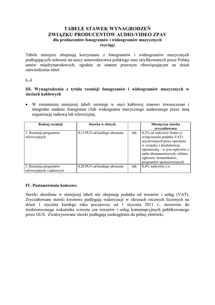 TABELE STAWEK WYNAGRODZEŃ ZWIĄZKU PRODUCENTÓW AUDIO-VIDEO ZPAV dla producentów fonogramów i wideogramów muzycznych (wyciąg) Tabele niniejsze obejmują korzystanie z fonogramów i wideogramów muzycznych podlegających ochronie na mocy ustawodawstwa polskiego oraz ratyfikowanych przez Polskę umów międzynarodowych, zgodnie ze stanem prawnym obowiązującym na dzień zatwierdzenia tabel. (...) III. Wynagrodzenia z tytułu reemisji fonogramów i wideogramów muzycznych w sieciach kablowych W rozumieniu niniejszej tabeli reemisję w sieci kablowej stanowi równoczesne i integralne nadanie fonogramu i/lub wideogramu muzycznego nadawanego przez inną organizację radiową lub telewizyjną. Rodzaj reemisji Stawka w złotych 1. Reemisja programów telewizyjnych 0,15 PLN od każdego abonenta lub 2. Reemisja programów telewizyjnych i radiowych 0,20 PLN od każdego abonenta lub Miesięczna stawka zryczałtowana 0,3% od wpływów brutto (z wyłączeniem podatku VAT) uzyskiwanych przez operatora w związku z działalnością operatorską – w tym wpływów z opłat abonamentowych, reklam, ogłoszeń, komunikatów, programów sponsorowanych. 0,4% wpływów j.w. IV. Postanowienia końcowe. Stawki określone w niniejszej tabeli nie obejmują podatku od towarów i usług (VAT). Zryczałtowane stawki kwotowe podlegają waloryzacji w okresach rocznych liczonych na dzień 1 stycznia każdego roku począwszy od 1 stycznia 2011 r., stosownie do średniorocznego wskaźnika wzrostu cen towarów i usług konsumpcyjnych publikowanego przez GUS. Zwaloryzowane stawki podlegają zaokrągleniu do pełnej złotówki.