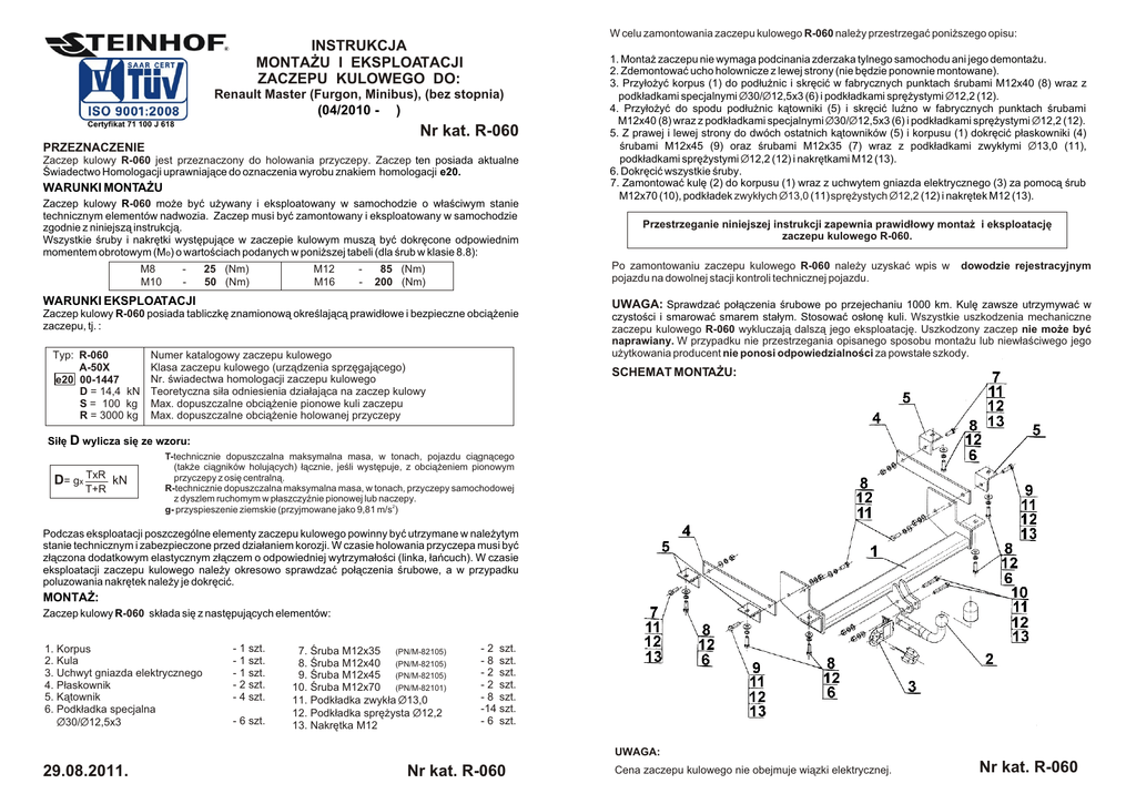 W celu zamontowania zaczepu kulowego R-060 nale¿y przestrzegaæ poni¿szego opisu: INSTRUKCJA MONTA¯U I EKSPLOATACJI ZACZEPU KULOWEGO DO: Renault Master (Furgon, Minibus), (bez stopnia) (04/2010 - ®) Certyfikat 71 100 J 618 Nr kat. R-060 PRZEZNACZENIE Zaczep kulowy R-060 jest przeznaczony do holowania przyczepy. Zaczep ten posiada aktualne Œwiadectwo Homologacji uprawniaj¹ce do oznaczenia wyrobu znakiem homologacji e20. WARUNKI MONTA¯U Zaczep kulowy R-060 mo¿e byæ u¿ywany i eksploatowany w samochodzie o w³aœciwym stanie technicznym elementów nadwozia. Zaczep musi byæ zamontowany i eksploatowany w samochodzie zgodnie z niniejsz¹ instrukcj¹. Wszystkie œruby i nakrêtki wystêpuj¹ce w zaczepie kulowym musz¹ byæ dokrêcone odpowiednim momentem obrotowym (Mo) o wartoœciach podanych w poni¿szej tabeli (dla œrub w klasie 8.8): M8 M10 - 25 (Nm) 50 (Nm) M12 M16 - Przestrzeganie niniejszej instrukcji zapewnia prawid³owy monta¿ i eksploatacjê zaczepu kulowego R-060. Po zamontowaniu zaczepu kulowego R-060 nale¿y uzyskaæ wpis w pojazdu na dowolnej stacji kontroli technicznej pojazdu. 85 (Nm) 200 (Nm) WARUNKI EKSPLOATACJI Zaczep kulowy R-060 posiada tabliczkê znamionow¹ okreœlaj¹c¹ prawid³owe i bezpieczne obci¹¿enie zaczepu, tj. : Typ: R-060 A-50X e20 00-1447 D = 14,4 kN S = 100 kg R = 3000 kg 1. Monta¿ zaczepu nie wymaga podcinania zderzaka tylnego samochodu ani jego demonta¿u. 2. Zdemontowaæ ucho holownicze z lewej strony (nie bêdzie ponownie montowane). 3. Przy³o¿yæ korpus (1) do pod³u¿nic i skrêciæ w fabrycznych punktach œrubami M12x40 (8) wraz z podk³adkami specjalnymi Ø30/Ø12,5x3 (6) i podk³adkami sprê¿ystymi Ø12,2 (12). 4. Przy³o¿yæ do spodu pod³u¿nic k¹towniki (5) i skrêciæ luŸno w fabrycznych punktach œrubami M12x40 (8) wraz z podk³adkami specjalnymi Ø30/Ø12,5x3 (6) i podk³adkami sprê¿ystymi Ø12,2 (12). 5. Z prawej i lewej strony do dwóch ostatnich k¹towników (5) i korpusu (1) dokrêciæ p³askowniki (4) œrubami M12x45 (9) oraz œrubami M12x35 (7) wraz z podk³adkami zwyk³ymi Ø13,0 (11), podk³adkami sprê¿ystymi Ø12,2 (12) i nakrêtkami M12 (13). 6. Dokrêciæ wszystkie œruby. 7. Zamontowaæ kulê (2) do korpusu (1) wraz z uchwytem gniazda elektrycznego (3) za pomoc¹ œrub M12x70 (10), podk³adek zwyk³ych Ø13,0 (11) sprê¿ystych Ø12,2 (12) i nakrêtek M12 (13). Numer katalogowy zaczepu kulowego Klasa zaczepu kulowego (urz¹dzenia sprzêgaj¹cego) Nr. œwiadectwa homologacji zaczepu kulowego Teoretyczna si³a odniesienia dzia³aj¹ca na zaczep kulowy Max. dopuszczalne obci¹¿enie pionowe kuli zaczepu Max. dopuszczalne obci¹¿enie holowanej przyczepy dowodzie rejestracyjnym UWAGA: Sprawdzaæ po³¹czenia œrubowe po przejechaniu 1000 km. Kulê zawsze utrzymywaæ w czystoœci i smarowaæ smarem sta³ym. Stosowaæ os³onê kuli. Wszystkie uszkodzenia mechaniczne zaczepu kulowego R-060 wykluczaj¹ dalsz¹ jego eksploatacjê. Uszkodzony zaczep nie mo¿e byæ naprawiany. W przypadku nie przestrzegania opisanego sposobu monta¿u lub niew³aœciwego jego u¿ytkowania producent nie ponosi odpowiedzialnoœci za powsta³e szkody. SCHEMAT MONTA¯U: Si³ê D wylicza siê ze wzoru: D= gx TxR kN T+R T-technicznie dopuszczalna maksymalna masa, w tonach, pojazdu ci¹gn¹cego (tak¿e ci¹gników holuj¹cych) ³¹cznie, jeœli wystêpuje, z obci¹¿eniem pionowym przyczepy z osiê centraln¹. R-technicznie dopuszczalna maksymalna masa, w tonach, przyczepy samochodowej z dyszlem ruchomym w p³aszczyŸnie pionowej lub naczepy. g- przyspieszenie ziemskie (przyjmowane jako 9,81 m/s2) Podczas eksploatacji poszczególne elementy zaczepu kulowego powinny byæ utrzymane w nale¿ytym stanie technicznym i zabezpieczone przed dzia³aniem korozji. W czasie holowania przyczepa musi byæ z³¹czona dodatkowym elastycznym z³¹czem o odpowiedniej wytrzyma³oœci (linka, ³añcuch). W czasie eksploatacji zaczepu kulowego nale¿y okresowo sprawdzaæ po³¹czenia œrubowe, a w przypadku poluzowania nakrêtek nale¿y je dokrêciæ. MONTA¯: Zaczep kulowy R-060 sk³ada siê z nastêpuj¹cych elementów: 1. Korpus 2. Kula 3. Uchwyt gniazda elektrycznego 4. P³askownik 5. K¹townik 6. Podk³adka specjalna Ø30/Ø12,5x3 - 1 szt. - 1 szt. - 1 szt. - 2 szt. - 4 szt. - 6 szt. 7. Œruba M12x35 (PN/M-82105) 8. Œruba M12x40 (PN/M-82105) 9. Œruba M12x45 (PN/M-82105) 10. Œruba M12x70 (PN/M-82101) 11. Podk³adka zwyk³a Ø13,0 12. Podk³adka sprê¿ysta Ø12,2 13. Nakrêtka M12 - 2 szt. - 8 szt. - 2 szt. - 2 szt. - 8 szt. -14 szt. - 6 szt. UWAGA: 29.08.2011. Nr kat. R-060 Cena zaczepu kulowego nie obejmuje wi¹zki elektrycznej. Nr kat. R-060