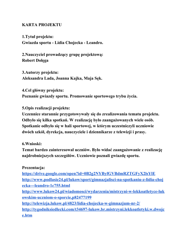 KARTA PROJEKTU 1.Tytuł projektu: Gwiazda sportu Lidia Chojecka Leandro. 2.Nauczyciel prowadzący grupę projektową: Robert Dołęga 3.Autorzy projektu: Aleksandra Lada, Joanna Kajka, Maja Sęk. 4.Cel główny projektu: Poznanie gwiazdy sportu. Promowanie sportowego trybu życia. 5.Opis realizacji projektu: Uczennice starannie przygotowywały się do zrealizowania tematu projektu. Odbyło się kilka spotkań. W realizację było zaangażowanych wiele osób. Spotkanie odbyło się w hali sportowej, w którym uczestniczyli uczniowie dwóch szkół, dyrekcja, nauczyciele i dziennikarze z telewizji i prasy. 6.Wnioski: Temat bardzo zainteresował uczniów. Było widać zaangażowanie z realizację najdrobniejszych szczegółów. Uczniowie poznali gwiazdę sportu. Prezentacja: https://drive.google.com/open?id=0B2g2NYByfGVBdmRZTGFyX2lsYlE http://www.podlasie24.pl/lukow/sport/gimnazjaliscinaspotkaniuzlidiachoj eckaleandro1c755.html http://www.lukow24.pl/wiadomosci/wydarzenia/mistrzyniwlekkoatletyceluk owskimuczniomosporcie,p82477199 http://telewizja.lukow.pl/4823/lidiachojeckawgimnazjumnr2/ http://tygodniksiedlecki.com/t34697lukow.br.mistrzyni.lekkoatletyki.w.dwojc e.htm