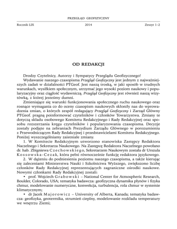 PRZEGLĄD GEOFIZYCZNY Rocznik LIX 2014 Zeszyt 1–2 OD REDAKCJI Drodzy Czytelnicy, Autorzy i Sympatycy Przeglądu Geofizycznego! Wydawanie naszego czasopisma Przegląd Geofizyczny jest jednym z najważniejszych zadań w działalności PTGeof. Jest naszą troską, w jaki sposób w trudnych warunkach, wysiłkiem społecznym, utrzymać jego wysoki poziom naukowy i popularyzacyjny oraz ciągłość wydawniczą. Przegląd Geofizyczny jest również naszą wizytówką, z której jesteśmy dumni. Zmieniające się warunki funkcjonowania społecznego ruchu naukowego oraz rosnące wymagania co do oceny czasopism naukowych skłoniły nas do wprowadzenia zmian, o których zespół redagujący Przegląd Geofizyczny i Zarząd Główny PTGeof. pragną poinformować czytelników i członków Towarzystwa. Zmiany te dotyczą składu osobowego Komitetu Redakcyjnego i Rady Redakcyjnej oraz sposobu rozszerzania kręgu czytelników i popularyzowania czasopisma. Decyzje zostały podjęte na zebraniach Prezydium Zarządu Głównego w porozumieniu z Przewodniczącym Rady Redakcyjnej i przedstawicielami Komitetu Redakcyjnego. Poniżej wyszczególniamy zaistniałe zmiany. 1. W Komitecie Redakcyjnym utworzono stanowiska Zastępcy Redaktora Naczelnego i Sekretarza Naukowego. Na Zastępcę Redaktora Naczelnego powołano dr. hab. Zbigniewa C z e c h o w s k i e g o, Sekretarzem Naukowym została dr Urszula K o s s o w s k a - C e z a k, która pełni równocześnie funkcję redaktora językowego. 2. W dążeniu do podniesienia poziomu naszego czasopisma, a także kierując się zaleceniami Ministerstwa Nauki i Szkolnictwa Wyższego, zwiększono liczbę członków Rady Redakcyjnej reprezentujących zagraniczne ośrodki naukowe. Nowymi członkami Rady Redakcyjnej zostali: • prof. Wojciech G r a b o w s k i – National Center for Atmospheric Research, Boulder, Colorado, USA; tematyka badawcza: geofizyczna dynamika płynów i fizyka chmur, modelowanie numeryczne, konwekcja, turbulencja, rola chmur w systemie klimatycznym; • dr Jacek M a j o r o w i c z – University of Alberta, Kanada; tematyka badawcza: geofizyka, geotermika, strumień cieplny, modelowanie rozkładu temperatury we wnętrzu Ziemi; 4 Od Redakcji • prof. Andrzej K i j k o – University of Pretoria, Republika Południowej Afryki; problematyka badawcza: geofizyka, sejsmologia górnicza, techniki numeryczne i obliczeniowe, zastosowanie metod statystycznych; • prof. Witold F. K r a j e w s k i – University of Iowa, Civil and Environmental Engineering, USA; problematyka badawcza: hydrologia, prognozowanie powodzi, matematyczne modelowanie procesów hydrologicznych, radarowe i satelitarne oceny opadów, zastosowanie informatyki w hydrologii; • prof. Kazimierz A d a m o w s k i – University of Ottawa, Faculty of Engineering, Kanada; problematyka badawcza: hydrologia, analiza powodzi regionalnych, modelowanie opadów, efekty globalnego ocieplenia w hydrologii. Nowym członkom Rady Redakcyjnej składamy serdeczne podziękowania za chęć współpracy. Jednocześnie wyrażamy głęboką wdzięczność dotychczasowym wieloletnim członkom Rady Redakcyjnej. Niektórzy z nich pozostaną nadal w podstawowym składzie Rady, pozostałym zaś, zasłużonym seniorom, w uznaniu zasług pragniemy nadać status Członków Honorowych Rady Redakcyjnej. Są to: prof. Czesław D r u e t, prof. Krzysztof H a m a n, prof. Zdzisław M i k u l s k i, prof. Janusz P a s z y ń s k i, prof. Roman Te i s s e y r e. Mamy nadzieję na ich dalszy udział w pracach Redakcji. Spośród dotychczasowych członków Rady Redakcyjnej w jej składzie pozostają: prof. Marek G r a d – przewodniczący, prof. Jerzy J a w o r s k i, dr hab. inż. Mieczysław O s t o j s k i, prof. Maciej S a d o w s k i. 3. W celu zwiększenia kręgu czytelników i popularyzowania czasopisma oraz ułatwienia kontaktów autorom z Komitetem Redakcyjnym ustanowiono specjalny link dotyczący Przeglądu Geofizycznego, w nowo powstałej stronie internetowej Polskiego Towarzystwa Geofizycznego. Adres strony Towarzystwa: ptgeof.imgw. pl, dla pracowników IMGW: ptgeof.imgw.ad . Na stronie internetowej publikujemy spisy treści każdego zeszytu, streszczenia w języku polskim i angielskim. Stworzono również możliwość publikowania artykułów w języku angielskim. Koszty weryfikacji językowej, według średnich stawek tłumaczenia, musi ponieść autor artykułu. Szczegóły postępowania autor uzgadnia z Komitetem Redakcyjnym i z Główną Księgową PTGeof. Zachęcamy czytelników Przeglądu Geofizycznego i sympatyków Polskiego Towarzystwa Geofizycznego do korzystania z naszej strony internetowej. Zachęcamy również do publikowania wyników swoich prac naukowych, artykułów przeglądowych, referatów wygłaszanych podczas spotkań naukowych Oddziałów PTGeof. Wyrażamy nadzieję, że podjęte zmiany przyczynią się do podniesienia atrakcyjności i poziomu naszego czasopisma. Zarząd Główny Polskiego Towarzystwa Geofizycznego Redakcja Przeglądu Geofizycznego