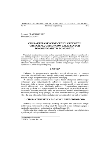 P O Z N A N UN I VE RS I T Y O F T E C HN O L O G Y ACA D E MI C J O UR N A L S No 70 Electrical Engineering 2012 Ryszard FRĄCKOWIAK* Tomasz GAŁAN** CHARAKTERYSTYCZNE CECHY KRZYWYCH OBCIĄŻENIA ODBIORCÓW ZALICZANYCH DO GOSPODARSTW DOMOWYCH W artykule przedstawiono wyniki analizy krzywych obciążenia odbiorców zasilanych z sieci niskiego napięcia i zaliczanych do grupy gospodarstw domowych. W badaniach oceniono wpływ czasu zachodu słońca oraz temperatury powietrza na krzywe obciążenia elektrycznego i na tej podstawie określono specyficzne cechy grafików wydzielonych grup odbiorców. Opracowano także odpowiednie modele uwzględniające wpływ badanych czynników na pobór energii elektrycznej. 1. WSTĘP Podstawę do prognozowania sprzedaży energii elektrycznej, a zarazem tworzenia odpowiednich taryf energii elektrycznej, stanowią dane z pomiarów zużycia energii zarejestrowane w poprzednich latach [1]. W artykule zostaną przedstawione wyniki badań obciążenia elektrycznego wybranych grup indywidualnych odbiorców zaliczanych do gospodarstw domowych. Jako kryterium wydzielenia grup przyjęto sposób wykorzystywania energii elektrycznej oraz lokalizację odbiorcy. Przedstawiono podstawowe parametry grafików oraz wpływ czynników zewnętrznych na przebieg i wartości obciążenia. Badania pozwoliły także na opracowanie modeli odwzorowujących zależność pobieranej mocy (energii) od czasu zachodu słońca (Tz) i temperatury () – dla grup odbiorców, których obciążenie wyraźnie zależy od tych czynników. 2. CHARAKTERYSTYKA BADANYCH GRUP ODBIORCÓW Podstawę do analizy stanowiły przebiegi obciążeń 250 odbiorców energii elektrycznej, rozliczanych według taryfy G, zasilanych z sieci niskiego napięcia i zamieszkujących tereny województwa wielkopolskiego [2]. Ogólną charakterystykę grup odbiorców objętych badaniami z uwzględnieniem wydzielonych cech przedstawiono w tabeli 1. __________________________________________ * Politechnika Poznańska. ** ENEA Operator Sp. z o.o. 52 Ryszard Frąckowiak, Tomasz Gałan Tabela 1. Charakterystyczne cechy wydzielonych grup odbiorców Grupa taryfowa oraz rodzaj odbiorcy M – Miejski W – Wiejski G11 M G11 W G12 M Cechy odbiorców Średni/a w grupie Posiada podgrzewacz elektryczny wody Posiada ogrzewanie elektryczne NIE TAK NIE TAK NIE TAK TAK NIE NIE NIE NIE NIE NIE TAK Liczba faz zasilania Stopień uzbrojenia w urządzenia elektryczne Powierzchnia lokalu [m2] 1 1 1 3 1 1 3 Niski Średni Średni Wysoki Średni Średni Wysoki 50-75 50-75 75-100 75-100 25-50 50-75 75-100 Liczba osób w lokalu Symbol grupy do 5 do 5 5 do 10 5 do 10 do 5 do 5 5 do 10 G11 M1 G11 M2 G11 W1 G11 W2 G12 M1 G12 M2 G12 M3 W tabeli 2 zestawiono charakterystyczne parametry przebiegu rocznego dla badanych grup odbiorców: Ar – roczne zużycie energii, Pdmax – zarejestrowana wartość maksymalna mocy czynnej, Ts – czas użytkowania mocy szczytowej. Tabela 2. Charakterystyczne parametry przebiegu rocznego Grupa odbiorców Pmax Ar Ts kW/odbiorcę kWh/odbiorcę h G11 M1 G11 W1 G11 M2 G11 W2 G12 M1 G12 M2 G12 M3 0,74 0,84 2,24 2,84 1,37 1,97 4,09 2536 2715 5376 6390 5259 6841 10503 3450 3251 2400 2250 3836 3471 2568 Mniejsze wartości parametru Ts wykazują odbiorcy wykorzystujący energię elektryczną do celów grzewczych. Ponadto odbiorcy miejscy wykazują także mniejsze wartości Ts niż odbiorcy wiejscy o podobnych cechach. 3. WPŁYW CZYNNIKÓW ZEWNĘTRZNYCH 3.1. Zakres badań Przebieg i parametry obciążenia odbiorców energii elektrycznej zależą od wielu czynników charakteryzujących samego odbiorcę oraz warunki zewnętrzne [3]. W przeprowadzonych badaniach skupiono się głównie na określeniu wpływu wschodu i zachodu słońca oraz temperatury powietrza. Ponieważ zjawiska wschodu i zachodu słońca wykazują bardzo duża zależnością liniową, w badaniach Charakterystyczne cechy krzywych obciążenia odbiorców... 53 ograniczono się tylko do analizy wpływu zachodu słońca na kształt oraz wartości obciążenia elektrycznego odbiorców. Ponadto przeprowadzone badania wykazały także liniową zależność średniomiesięcznych wartości oraz czasu Tz [4]. 3.2. Odbiorcy z grupy taryfowej G11 22 0,27 21 0,25 20 0,23 19 0,21 18 0,19 17 G11 M1 G11 W1 Tz rze sie ń źd zie rn ik lis to pa d gr ud zie ń pa rp ie ń w ec 15 sie ci eń c ie kw ty lu ar ze m st yc ze ń 0,15 16 lip i 0,17 Zachód słońca h 0,29 m aj cz er w ie c Moc kW/odbiorcę U odbiorców, którzy nie wykorzystują energii na cele grzewcze (G11 M1 oraz G11 W1), zauważa się silniejszą zależność dobowych zmian obciążenia elektrycznego w ciągu roku od zmian Tz, niż w przypadku pozostałych grup odbiorców rozliczających się według taryfy G11 [3] – rys. 1. Rys. 1. Roczna zmienność dobowego obciążenia oraz czasu zachodu słońca w 2004 roku u odbiorców z grupy z grupy G11 M1 oraz G11 W1 Powyższy wniosek potwierdzają wyniki badań współczynnika korelacji – rys. 2. Pewien nieduży wpływ na krzywe obciążenia odbiorców należących do grup G11M2 i G11W2 ma temperatura powietrza. W miesiącach zimowych, w których średnia temperatura jest mniejsza niż 10 OC, zależność obciążenia od temperatury powietrza jest silniejsza. 54 Ryszard Frąckowiak, Tomasz Gałan Godzina w dobie h 0 1 2 3 4 5 6 7 8 9 10 11 12 13 14 15 16 17 18 19 20 21 22 23 24 Współczynnik korelacji rxy 0,2 0,0 -0,2 -0,4 -0,6 G11 M1 G11 W1 G11 M2 -0,8 G11 W2 -1,0 Rys. 2. Zmienność współczynnika korelacji między obciążeniem w poszczególnych godzinach doby a czasem zachodu słońca, dla odbiorców z grupy G11 (w 2006 roku) 3.3. Odbiorcy z grupy taryfowej G12 Istotny wpływ na przebieg obciążenia odbiorców zaliczanych do grupy G12 ma temperatura. Pewien zauważalny wpływ, u odbiorców z grupy G12 M1, w godzinach obowiązywania strefy z droższą ceną energii, ma także czas zachodu słońca. Powyższy wniosek potwierdza analiza współczynnika korelacji pomi