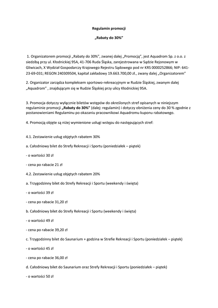 Regulamin promocji „Rabaty do 30%” 1. Organizatorem promocji „Rabaty do 30%”, zwanej dalej „Promocją”, jest Aquadrom Sp. z o.o. z siedzibą przy ul. Kłodnickiej 95A, 41-706 Ruda Śląska, zarejestrowana w Sądzie Rejonowym w Gliwicach, X Wydział Gospodarczy Krajowego Rejestru Sądowego pod nr KRS 0000252866; NIP: 64123-69-031; REGON 240309504, kapitał zakładowy 19.663.700,00 zł., zwany dalej „Organizatorem” 2. Organizator zarządza kompleksem sportowo-rekreacyjnym w Rudzie Śląskiej, zwanym dalej „Aquadrom” , znajdującym się w Rudzie Śląskiej przy ulicy Kłodnickiej 95A. 3. Promocja dotyczy wyłącznie biletów wstępów do określonych stref opisanych w niniejszym regulaminie promocji „Rabaty do 30%” (dalej: regulamin) i dotyczy obniżenia ceny do 30 % zgodnie z postanowieniami Regulaminu po okazaniu pracownikowi Aquadromu kuponu rabatowego. 4. Promocją objęte są niżej wymienione usługi wstępu do następujących stref: 4.1. Zestawienie usług objętych rabatem 30% a. Całodniowy bilet do Strefy Rekreacji i Sportu (poniedziałek – piątek) - o wartości 30 zł - cena po rabacie 21 zł 4.2. Zestawienie usług objętych rabatem 20% a. Trzygodzinny bilet do Strefy Rekreacji i Sportu (weekendy i święta) - o wartości 39 zł - cena po rabacie 31,20 zł b. Całodniowy bilet do Strefy Rekreacji i Sportu (weekendy i święta) - o wartości 49 zł - cena po rabacie 39,20 zł c. Trzygodzinny bilet do Saunarium + godzina w Strefie Rekreacji i Sportu (poniedziałek – piątek) - o wartości 45 zł - cena po rabacie 36,00 zł d. Całodniowy bilet do Saunarium oraz Strefy Rekreacji i Sportu (poniedziałek – piątek) - o wartości 50 zł - cena po rabacie 40,00 zł e. Trzygodzinny bilet do Saunarium + godzina w Strefie Rekreacji i Sportu (weekendy i święta) - o wartości 50 zł - cena po rabacie 40,00 zł f. Całodniowy bilet do Saunarium oraz w Strefy Rekreacji i Sportu (weekendy i święta) - o wartości 60 zł - cena po rabacie 48,00 zł 4.3. Zestawienie usług objętych rabatem 15% a. Dwugodzinny bilet do Strefy Rekreacji i Sportu (poniedziałek – piątek) - o wartości 24 zł - cena po rabacie 20,40 zł 4.4. Zestawienie usług objętych rabatem 10% a. Całodniowy bilet dla rodziny trzyosobowej do Strefy Rekreacji i Sportu (poniedziałek – piątek) - o wartości 75 zł - cena po rabacie 67,50 zł b. Całodniowy bilet dla rodziny czteroosobowej do Strefy Rekreacji i Sportu (poniedziałek – piątek) - o wartości 100 zł - cena po rabacie 90,00 zł c. Trzygodzinny bilet dla rodziny trzyosobowej do Strefy Rekreacji i Sportu (weekendy i święta) - o wartości 81 zł - cena po rabacie 72,90 zł d. Trzygodzinny bilet dla rodziny czteroosobowej do Strefy Rekreacji i Sportu (weekendy i święta) - o wartości 108 zł - cena po rabacie 97,20 zł e. Całodniowy bilet dla rodziny trzyosobowej do Strefy Rekreacji i Sportu (weekendy i święta) - o wartości 111 zł - cena po rabacie 99,90 zł f. Całodniowy bilet dla rodziny czteroosobowej do Strefy Rekreacji i Sportu (weekendy i święta) - o wartości 148 zł - cena po rabacie 133,20 zł 5. Z promocji może skorzystać wyłącznie osoba posiadająca kupon rabatowy zgodny ze wzorem z załącznika nr 1. 6. Bilet rabatowy nie dotyczy innych, dodatkowo płatnych atrakcji w tym gastronomii oraz sklepu sportowego. 7. Lista Partnerów Aquadromu stanowi załącznik nr 2 do Regulaminu. 8. Promocja "Rabaty do 30%" obowiązuje od 01.05.2014. do 30.06.2014 9. Z biletów promocyjnych, o których mowa w punkcie 4 można korzystać wyłącznie w okresie trwania promocji. Zakończenie promocji oznacza brak możliwości korzystania z biletów promocyjnych. 10. Aquadrom zastrzega sobie prawo do przedłużenia terminu obowiązywania promocji. Przed zakupem biletu promocyjnego Klient zobowiązany jest przekazać kupn rabatowy pracownikowi Aquadromu w recepcji. 11. Aquadrom zastrzega sobie prawo zmiany promocji poprzez dodanie do oferty nowych usług objętych rabatem. 12. Aquadrom zastrzega sobie prawo zmiany zawartości załącznika nr 2 poprzez dodanie nowego Partnera Aquadromu. 13. Cenę biletu i cenę za każdą minutę po przekroczeniu czasu reguluje cennik. 14. Aktualne usługi objęte promocją „Rabaty do 30%” publikowane będą na stronie rabaty.aquadrom.pl 15. Promocji nie można łączyć z innymi promocjami lub ulgami przewidzianymi przez Organizatora. 16. Zarządzający może czasowo ograniczyć wejście Klientów do Aquadrom-u z powodu osiągnięcia maksymalnej ilości osób korzystających. 17. Aquadrom nie gwarantuje dostępu do każdej strefy, atrakcji i urządzeń w każdym czasie, w szczególności z powodu konieczności prowadzenia remontów lub konserwacji, względnie wykorzystania poszczególnych stref lub atrakcji dla dedykowanych zajęć. Każda osoba zamierzająca korzystać z Aquadrom-u może uzyskać informację o zakresie usług świadczonych w danym czasie bądź występujących w tej mierze ograniczeń, decyzje co do korzystania z Aquadrom-u podejmuje na własne ryzyko. 18. Uczestnik promocji przyjmuje do wiadomości, że korzystając z promocji zobowiązany jest do przestrzegania oraz podlega ograniczeniom przewidzianym w Regulaminie korzystania z Aquadromu dostępnym w recepcji Aquadromu oraz na stronie internetowej Aquadromu. 19. Uczestnik przystępując do promocji akceptuje ustalone przez Organizatora zasady realizacji promocji i zobowiązany jest do przestrzegania Regulaminu Promocji „Rabaty do 30%”. 20. Reklamacje dotyczące promocji rozpatrywane będą w terminie 7 dni od daty złożenia w Biurze Obsługi Klienta (BOK) w obiekcie Aquadrom. Podstawą reklamacji jest posiadanie paragonu fiskalnego. 21. Regulamin promocji dostępny jest w recepcji Aquadromu oraz na stronie internetowej Aquadromu www.aquadrom.pl