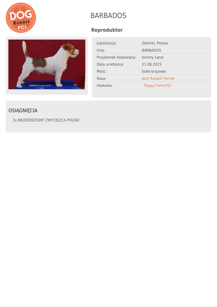 BARBADOS Reproduktor Lokalizacja: Złotniki, Polska Imię: BARBADOS Przydomek hodowlany: Kimmy Land Data urodzenia: 21.08.2015 Maść: biało-brązowe Rasa: Jack Russell Terrier Hodowla: OSIĄGNIĘCIA 1x MŁODZIEŻOWY ZWYCIĘZCA POLSKI Poppy Farm FCI