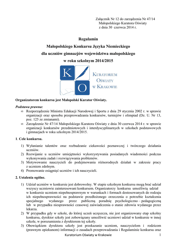 Załącznik Nr 12 do zarządzenia Nr 47/14 Małopolskiego Kuratora Oświaty z dnia 30 czerwca 2014 r. Regulamin Małopolskiego Konkursu Języka Niemieckiego dla uczniów gimnazjów województwa małopolskiego w roku szkolnym 2014/2015 Organizatorem konkursu jest Małopolski Kurator Oświaty. Podstawa prawna: • Rozporządzenie Ministra Edukacji Narodowej i Sportu z dnia 29 stycznia 2002 r. w sprawie organizacji oraz sposobu przeprowadzania konkursów, turniejów i olimpiad (Dz. U. Nr 13, poz. 125 ze zmianami). • Zarządzenie Nr 47/14 Małopolskiego Kuratora Oświaty z dnia 30 czerwca 2014 r. w sprawie organizacji konkursów przedmiotowych i interdyscyplinarnych w szkołach podstawowych i gimnazjach w roku szkolnym 2014/2015. 1. Cele konkursu. 1) Wyłanianie talentów oraz rozbudzanie ciekawości poznawczej i twórczego działania uczniów. 2) Rozwijanie u uczniów umiejętności wykorzystywania posiadanych wiadomości podczas wykonywania zadań i rozwiązywania problemów. 3) Motywowanie nauczycieli do podejmowania różnorodnych działań w zakresie pracy z uczniem zdolnym. 4) Promowanie osiągnięć uczniów i ich nauczycieli. 2. Ustalenia ogólne. 1) Udział uczniów w konkursie jest dobrowolny. W etapie szkolnym konkursu mogą brać udział wszyscy uczniowie zainteresowani konkursem. Organizatorzy konkursu umożliwią udział w konkursie uczniom niepełnosprawnym w warunkach i formach dostosowanych do rodzaju ich niepełnosprawności na podstawie przedłożonego orzeczenia o potrzebie kształcenia specjalnego wydanego przez publiczną poradnię psychologiczno – pedagogiczną lub w przypadku niesprawności czasowej zaświadczenia o stanie zdrowia wydanego przez lekarza. 2) W przypadku gdy w szkole, do której uczeń uczęszcza, nie jest organizowany etap szkolny konkursu, dyrektor szkoły jest zobowiązany umożliwić uczniowi udział w konkursie w innej szkole, w porozumieniu z dyrektorem tej szkoły. 3) Obowiązkiem dyrektora szkoły jest przekazanie uczniom, nauczycielom i rodzicom (prawnym opiekunom) informacji o zasadach przeprowadzania i Regulaminie konkursu oraz 1 Kuratorium Oświaty w Krakowie odebranie od nich podpisanego oświadczenia stanowiącego załącznik nr 2 do niniejszego Regulaminu. 4) Obowiązkiem uczniów jest przestrzeganie zasad określonych w Regulaminie i Instrukcji stanowiącej integralną część zestawu zadań konkursowych. 5) W czasie przeprowadzania poszczególnych etapów konkursu nie wolno używać telefonów komórkowych, wykonywać zdjęć oraz filmów. 6) Szkoła zgłasza swój udział w konkursie poprzez przesłanie do odpowiedniej komisji rejonowej protokołu z przebiegu etapu szkolnego konkursu. 7) Za organizację konkursu odpowiedzialny jest pracownik Kuratorium Oświaty, który jest przewodniczącym komisji wojewódzkiej konkursu. 8) Informacje dotyczące organizacji, przebiegu i wyników konkursu będą przekazywane wyłącznie w formie elektronicznej poprzez stronę www.kuratorium.krakow.pl oraz pocztę elektroniczną przewodniczących komisji rejonowych i wojewódzkiej. 9) Zestawy zadań oraz schematy oceniania i punktacji do wszystkich etapów konkursu będą opracowane według określonych warunków przedstawionych autorom i zostaną dopuszczone do wykorzystania po uzyskaniu pozytywnej recenzji naukowej i metodycznej. 10) Autorzy i recenzenci zadań oraz wiceprzewodniczący komisji wojewódzkiej nie mogą przygotowywać uczniów lub własnych dzieci do udziału w konkursie. 11) Finaliści oraz laureaci konkursu otrzymają zaświadczenia Małopolskiego Kuratora Oświaty, które są ważne na terenie całego kraju. 12) Laureaci konkursu uzyskują końcowa ocenę celującą z przedmiotu i zgodnie z §39 rozporządzenia Ministra Edukacji Narodowej z dnia 30 kwietnia 2007 r. w sprawie warunków i sposobu oceniania, klasyfikowania i promowania uczniów i słuchaczy oraz przeprowadzania sprawdzianów i egzaminów w szkołach publicznych (Dz. U. Nr 83, poz. 562, z późn. zm.) podczas egzaminu gimnazjalnego są zwolnieni z egzaminu gimnazjalnego z języka obcego nowożytnego, jeżeli rodzice (prawni opiekunowie) ucznia złożyli dyrektorowi szkoły pisemną deklarację wskazującą język niemiecki, z którego uczeń będzie zdawał część trzecią egzaminu gimnazjalnego, uzyskują najwyższy wynik z tej części egzaminu oraz będą w pierwszej kolejności przyjmowani do wybranej publicznej szkoły ponadgimnazjalnej, zgodnie z Art. 20d (Dz. U. z 2004 r. Nr 256, poz. 2572 ze zmianami). 13) Laureaci konkursu otrzymają nagrody. 3. Przebieg konkursu. 1) Konkurs jest trzyetapowy. Szczegółowy harmonogram przebiegu konkursu określa załącznik nr 1 do niniejszego Regulaminu –wszystkie etapy konkursu organizowane są tylko w terminach wskazanych w harmonogramie. 2) Eliminacje konkursowe na wszystkich etapach będą przeprowadzane w formie pisemnej. 3) W etapie rejonowym konkursu może wziąć udział co najwyżej 800 uczestników konkursu, którzy uzyskali najwyższą liczbę punktów w etapie szkolnym, jednak nie mniej niż 75% punktów możliwych do uzyskania. 4) W części pisemnej etapu wojewódzkiego konkursu może wziąć udział co najwyżej 200 uczestników konkursu, którzy uzyskali najwyższą liczbę punktów w etapie rejonowym, jednak nie mniej niż 75% punktów możliwych do uzyskania. 5) Tytuł laureata konkursu otrzymuje 20 uczestników konkursu, którzy w etapie wojewódzkim uzyskali najwyższą liczbę punktów, a także ci uczestnicy, którzy zdobyli identyczną liczbę punktów, jaką uzyskał dwudziesty finalista. 4. Organizacja etapu szkolnego konkursu i nadzór nad jego przebiegiem spoczywa na dyrektorze szkoły, który: 1) powołuje szkolną komisję konkursową, w skład której wchodzi co najmniej dwóch nauczycieli, z których co najmniej jeden reprezentuje przedmiot konkursu, Kuratorium Oświaty w Krakowie 2 2) uzyskuje zgodę rodziców (prawnych opiekunów) uczniów biorących udział w konkursie na przetwarzanie 