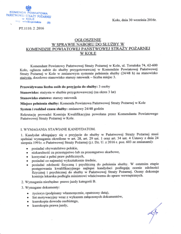 Strazy Pożarnej w Kole w zmianowym systemie pełnienia słuzby (24148 h) na stanowisko