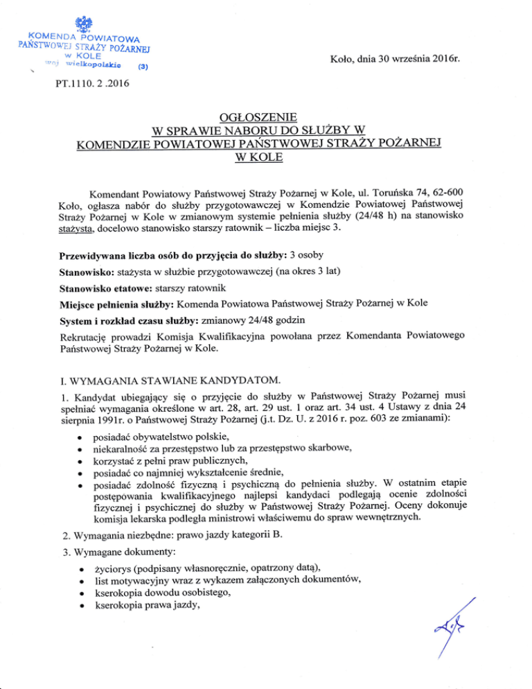 KP PSP w Kole lub w Wydziale Kwatermistrzowsko - Kadrowym KP PSP w Kole),