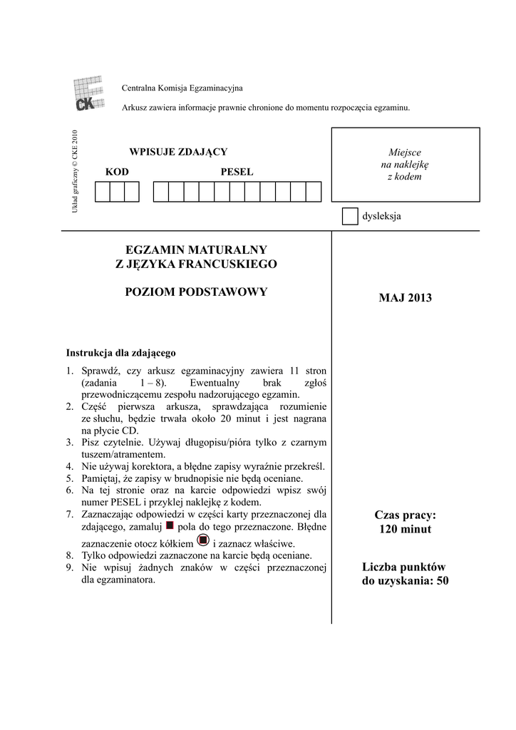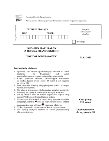 Centralna Komisja Egzaminacyjna Układ graficzny © CKE 2010 Arkusz zawiera informacje prawnie chronione do momentu rozpoczęcia egzaminu. WPISUJE ZDAJĄCY KOD PESEL Miejsce na naklejkę z kodem dysleksja EGZAMIN MATURALNY Z JĘZYKA FRANCUSKIEGO POZIOM PODSTAWOWY MAJ 2013 Instrukcja dla zdającego 1. Sprawdź, czy arkusz egzaminacyjny zawiera 11 stron (zadania 1 – 8). Ewentualny brak zgłoś przewodniczącemu zespołu nadzorującego egzamin. 2. Część pierwsza arkusza, sprawdzająca rozumienie ze słuchu, będzie trwała około 20 minut i jest nagrana na płycie CD. 3. Pisz czytelnie. Używaj długopisu/pióra tylko z czarnym tuszem/atramentem. 4. Nie używaj korektora, a błędne zapisy wyraźnie przekreśl. 5. Pamiętaj, że zapisy w brudnopisie nie będą oceniane. 6. Na tej stronie oraz na karcie odpowiedzi wpisz swój numer PESEL i przyklej naklejkę z kodem. 7. Zaznaczając odpowiedzi w części karty przeznaczonej dla zdającego, zamaluj pola do tego przeznaczone. Błędne Czas pracy: 120 minut zaznaczenie otocz kółkiem i zaznacz właściwe. 8. Tylko odpowiedzi zaznaczone na karcie będą oceniane. 9. Nie wpisuj żadnych znaków w części przeznaczonej dla egzaminatora. Liczba punktów do uzyskania: 50 2 Egzamin maturalny z języka francuskiego Poziom podstawowy MJF-P1_1P-132 Egzamin maturalny z języka francuskiego Poziom podstawowy 3 ROZUMIENIE SŁUCHANEGO TEKSTU Zadanie 1. (5 pkt) Usłyszysz dwukrotnie tekst na temat Victorii. Zaznacz znakiem X, które zdania są zgodne z treścią nagrania (V – Vrai), a które nie (F – Faux). Za każde poprawne rozwiązanie otrzymasz 1 punkt. V 1.1. Victoria a eu son baccalauréat plus tard que les élèves de son âge. 1.2. Les parents de Victoria ont fait des études supérieures. 1.3. La mère de Victoria s’occupe toute seule de son éducation. 1.4. Victoria a peu d’amis de son âge. X 1.5. Victoria a déjà décidé où elle allait faire ses études. X F X X X PRZENIEŚ ROZWIĄZANIA NA KARTĘ ODPOWIEDZI! Zadanie 2. (5 pkt) Usłyszysz dwukrotnie pięć wypowiedzi na temat portalu Facebook. Do każdej wypowiedzi (2.1.–2.5.) dopasuj właściwy nagłówek (A–F). Wpisz rozwiązania do tabeli. Uwaga: jeden nagłówek został podany dodatkowo i nie pasuje do żadnej wypowiedzi. Za każde poprawne rozwiązanie otrzymasz 1 punkt. A. Quel avenir pour Facebook B. Pour avoir accès à Facebook C. Facebook, un phénomène mondial D. Attention au respect de la vie privée E. Le profil le plus populaire sur Facebook F. Un accès facile aux passions de vos amis 2.1. 2.2. 2.3. 2.4. 2.5. C B D F A PRZENIEŚ ROZWIĄZANIA NA KARTĘ ODPOWIEDZI! 4 Egzamin maturalny z języka francuskiego Poziom podstawowy Zadanie 3. (5 pkt) Usłyszysz dwukrotnie tekst na temat słynnego obrazu Leonarda da Vinci. Z podanych odpowiedzi wybierz właściwą, zgodną z treścią nagrania. Zakreśl literę A, B albo C. Za każde poprawne rozwiązanie otrzymasz 1 punkt. 3.1. Le comité italien espère que A. la Joconde sera vendue à un musée de Florence. B. le Ministre de la Culture financera l’exposition en 2013. C. les Italiens répondront à son appel et signeront sa pétition. 3.2. Au XXe siècle, la Joconde A. a été prêtée deux fois. B. n’a jamais quitté la France. C. a beaucoup voyagé à l’étranger. 3.3. Selon les conservateurs du Louvre, le tableau A. est en bon état malgré son âge. B. ne devrait jamais sortir du Louvre. C. est le portrait de l’assistant du peintre. 3.4. Le transport du tableau en Italie est inimaginable à cause A. de l’interdiction par le Parlement français. B. du climat italien qui serait nuisible pour la Joconde. C. des risques de dommages liés à la fragilité de la peinture. 3.5. Le texte présente A. une coopération culturelle franco-italienne réussie. B. les problèmes concernant le prêt d’une œuvre d’art. C. l’aide internationale en matière de conservation des œuvres d’art. PRZENIEŚ ROZWIĄZANIA NA KARTĘ ODPOWIEDZI! Egzamin maturalny z języka francuskiego Poziom podstawowy 5 ROZUMIENIE PISANEGO TEKSTU Zadanie 4. (7 pkt) Przeczytaj tekst. Z podanych odpowiedzi wybierz właściwą, zgodną z treścią tekstu. Zakreśl literę A, B, C albo D. Za każde poprawne rozwiązanie otrzymasz 1 punkt. EST-IL POSSIBLE DE GAGNER SA VIE AU PARADIS ? Être payé 78 000 euros pour se promener pendant six mois sur une île australienne, c’est possible… et très sérieux. « Le meilleur job du monde » : c’est comme ça qu’a été présentée l’offre d’emploi publiée sur Internet au début de la semaine. Le gouvernement australien a proposé un contrat de travail dont l’objet est de se balader sur les plages de l’île de Hamilton, un paradis au cœur de la Grande Barrière de Corail, administré par le Queensland, un État australien. Le site de l’État du Queensland a reçu beaucoup de candidatures d’internautes intéressés par cette offre. Victime de sa réussite, le site comptait ce mardi environ 300 000 visiteurs et 350 candidatures étaient enregistrées en une heure. En somme, plus de 34 000 personnes originaires de 200 pays de tous les continents ont répondu à l’annonce. « La réaction a été phénoménale et bien supérieure à ce que nous attendions », a jugé la porte-parole de l’État du Queensland. Un contrat de six mois, pour un salaire mensuel de 13 000 euros : une occasion en or ! En plus des bonnes conditions financières, le lauréat bénéficiera aussi d’un billet d’avion depuis son domicile jusqu’à l’île de Hamilton. En échange, « le gardien de l’île » aura pour mission de se balader sur les plages de sable blanc, prendre le soleil, faire du bateau, explorer les fonds sous-marins, effectuer quelques travaux d’entretien, parfois, se déplacer tout seul en voiture et surtout d’alimenter chaque semaine un blog avec photos et vidéos. Le futur gardien, qui sera logé dans une villa de trois chambres avec piscine et golf, doit être bon nageur, exc