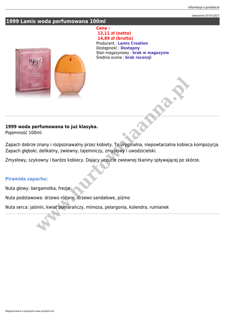 Informacje o produkcie Utworzono 07-03-2017 1999 Lamis woda perfumowana 100ml Cena : 12,11 zł (netto) 14,89 zł (brutto) nn a .p l Producent : Lamis Creation Dostępność : Dostępny Stan magazynowy : brak w magazynie Średnia ocena : brak recenzji ni aa 1999 woda perfumowana to już klasyka. Pojemność 100ml w Zapach dobrze znany i rozpoznawalny przez kobiety. To oryginalna, niepowtarzalna kobieca kompozycja. Zapach głęboki, delikatny, zwiewny, tajemniczy, zmysłowy i uwodzicielski. ur to Zmysłowy, szykowny i bardzo kobiecy. Dający uczucie zwiewnej tkaniny spływającej po skórze. Piramida zapachu: .h Nuta głowy: bergamotka, frezja w w Nuta podstawowa: drzewo różane, drzewo sandałowe, piżmo w Nuta serca: jaśmin, kwiat pomarańczy, mimoza, pelargonia, kolendra, rumianek Wygenerowano w programie www.oscGold.com