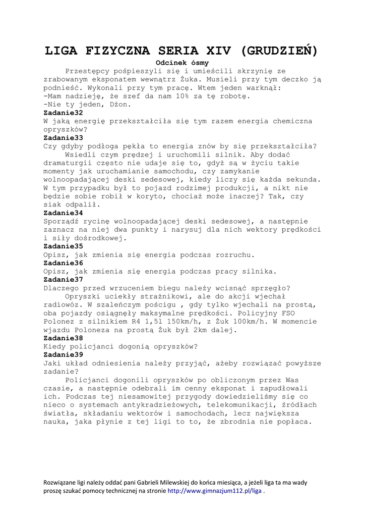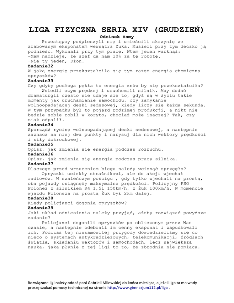 LIGA FIZYCZNA SERIA XIV (GRUDZIEŃ) Odcinek ósmy Przestępcy pośpieszyli się i umieścili skrzynię ze zrabowanym eksponatem wewnątrz Żuka. Musieli przy tym deczko ją podnieść. Wykonali przy tym pracę. Wtem jeden warknął: -Mam nadzieję, że szef da nam 10% za tę robotę. -Nie ty jeden, Dżon. Zadanie32 W jaką energię przekształciła się tym razem energia chemiczna opryszków? Zadanie33 Czy gdyby podłoga pękła to energia znów by się przekształciła? Wsiedli czym prędzej i uruchomili silnik. Aby dodać dramaturgii często nie udaje się to, gdyż są w życiu takie momenty jak uruchamianie samochodu, czy zamykanie wolnoopadającej deski sedesowej, kiedy liczy się każda sekunda. W tym przypadku był to pojazd rodzimej produkcji, a nikt nie będzie sobie robił w koryto, chociaż może inaczej? Tak, czy siak odpalił. Zadanie34 Sporządź rycinę wolnoopadającej deski sedesowej, a następnie zaznacz na niej dwa punkty i narysuj dla nich wektory prędkości i siły dośrodkowej. Zadanie35 Opisz, jak zmienia się energia podczas rozruchu. Zadanie36 Opisz, jak zmienia się energia podczas pracy silnika. Zadanie37 Dlaczego przed wrzuceniem biegu należy wcisnąć sprzęgło? Opryszki uciekły strażnikowi, ale do akcji wjechał radiowóz. W szaleńczym pościgu , gdy tylko wjechali na prostą, oba pojazdy osiągnęły maksymalne prędkości. Policyjny FSO Polonez z silnikiem R4 1,5l 150km/h, z Żuk 100km/h. W momencie wjazdu Poloneza na prostą Żuk był 2km dalej. Zadanie38 Kiedy policjanci dogonią opryszków? Zadanie39 Jaki układ odniesienia należy przyjąć, ażeby rozwiązać powyższe zadanie? Policjanci dogonili opryszków po obliczonym przez Was czasie, a następnie odebrali im cenny eksponat i zapudłowali ich. Podczas tej niesamowitej przygody dowiedzieliśmy się co nieco o systemach antykradzieżowych, telekomunikacji, źródłach światła, składaniu wektorów i samochodach, lecz największa nauka, jaka płynie z tej ligi to to, że zbrodnia nie popłaca. Rozwiązane ligi należy oddać pani Gabrieli Milewskiej do końca miesiąca, a jeżeli liga ta ma wady proszę szukać pomocy technicznej na stronie http://www.gimnazjum112.pl/liga .