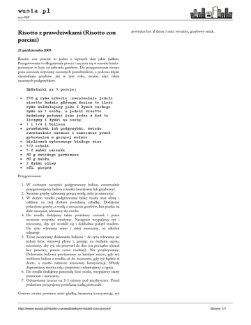 Powered by TCPDF (www.tcpdf.org) wusia.pl eco-PDF Risotto z prawdziwkami (Risotto con porcini) powinien być al dente i mieć wyraźny, grzybowy smak. 21 października 2009 Risotto con porcini to jedno z lepszych dań jakie jadłam. Przygotowanie to długotrwały proces i zaczyna się w sezonie letniojesiennym w lesie od zebrania grzybów. Do przygotowania risotto poza sezonem używamy suszonych prawdziwków, a podczas klęski nieurodzaju grzybów, jak w tym roku, można użyć także suszonych podgrzybków. Składniki na 3 porcje: 250 g ryżu arborio (ewentualnie jeżeli risotto będzie głównym daniem to ilość ryżu kalkulujemy jako 6 łyżek suchego ryżu na 1 osobę, a jeżeli risotto będziemy podawać jako jedno z dań to liczymy 4 łyżki na osobę) 1 i 1/4 l bulionu prawdziwki lub podgrzybki, świeże ewentualnie suszone i namoczone przed gotowaniem w gorącej wodzie kieliszek wytrawnego białego wina 1/2 cebuli 1-2 ząbki czosnku 80 g świeżego parmezanu 80 g masła 2 łyżki oliwy sól, pieprz Przygotowanie: 1. W osobnym naczyniu podgrzewamy bulion, ewentualnie przygotowujemy bulion z kostki (warzywny lub grzybowy). 2. Suszone grzyby zalewamy gorącą wodą, żeby je namoczyć. 3. W dużym rondlu podgrzewamy łyżkę masła oraz oliwę i szklimy na niej drobno posiekaną cebulkę. Dodajemy pokrojone grzyby, a wodę z moczenia grzybów, bez piasku na dole naczynia, wlewamy do rosołu. 4. Do rondla dodajemy także posiekany czosnek i przez moment wszystko smażymy. Następnie wsypujemy ryż i mieszamy, aby ryż zeszklił się i dokładnie pokrył masłem. Do ryżu wlewamy wino i dalej mieszamy, aż alkohol odparuje. 5. Teraz zaczynamy dodawanie bulionu – do ryżu wlewamy po jednej łyżce wazowej płynu i, gotując na średnim ogniu, mieszamy, aby ryż nie przywarł do dna (na początku niemal bez przerwy, potem coraz rzadziej). Nie przykrywamy. Dolewanie bulionu powtarzamy za każdym razem, gdy ryż wchłonie bulion z rondla, aż do momentu, gdy ryż będzie al dente, a risotto nabierze kremowej konsystencji. Wtedy doprawiamy risotto solą i pieprzem i zdejmujemy z ognia. 6. Do rondla dodajemy pozostałą ilość masła, wsypujemy starty parmezan i mieszamy. 7. Odstawiamy jeszcze na 2-3 minuty pod przykryciem. Przed podaniem posypujemy posiekaną natką pietruszki. Gotowe risotto powinno mieć gładką, kremową konsystencję, ryż http://www.wusia.pl/risotto-z-prawdziwkami-risotto-con-porcini/ Strona 1/1