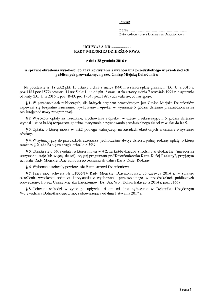 Projekt z dnia ................................................................... Zatwierdzony przez Burmistrza Dzierżoniowa UCHWAŁA NR .................... RADY MIEJSKIEJ DZIERŻONIOWA z dnia 28 grudnia 2016 r. w sprawie określenia wysokości opłat za korzystanie z wychowania przedszkolnego w przedszkolach publicznych prowadzonych przez Gminę Miejską Dzierżoniów Na podstawie art.18 ust.2 pkt. 15 ustawy z dnia 8 marca 1990 r. o samorządzie gminnym (Dz. U. z 2016 r. poz.446 i poz.1579) oraz art. 14 ust.5 pkt.1, lit. a i pkt. 2 oraz ust.5a ustawy z dnia 7 września 1991 r. o systemie oświaty (Dz. U. z 2016 r. poz. 1943, poz.1954 i poz. 1985) uchwala się, co następuje: § 1. W przedszkolach publicznych, dla których organem prowadzącym jest Gmina Miejska Dzierżoniów zapewnia się bezpłatne nauczanie, wychowanie i opiekę, w wymiarze 5 godzin dziennie przeznaczonym na realizację podstawy programowej. § 2. Wysokość opłaty za nauczanie, wychowanie i opiekę w czasie przekraczającym 5 godzin dziennie wynosi 1 zł za każdą rozpoczętą godzinę korzystania z wychowania przedszkolnego dzieci w wieku do lat 5. § 3. Opłata, o której mowa w ust.2 podlega waloryzacji na zasadach określonych w ustawie o systemie oświaty. § 4. W sytuacji gdy do przedszkola uczęszcza jednocześnie dwoje dzieci z jednej rodziny opłatę, o której mowa w § 2, obniża się za drugie dziecko o 50%. § 5. Obniża się o 50% opłatę, o której mowa w § 2, za każde dziecko z rodziny wielodzietnej (mającej na utrzymaniu troje lub więcej dzieci), objętej programem pn."Dzierżoniowska Karta Dużej Rodziny", przyjętym uchwałą Rady Miejskiej Dzierżoniowa po okazaniu aktualnej Karty Dużej Rodziny. § 6. Wykonanie uchwały powierza się Burmistrzowi Dzierżoniowa. § 7. Traci moc uchwała Nr LI/335/14 Rady Miejskiej Dzierżoniowa z 30 czerwca 2014 r. w sprawie określenia wysokości opłat za korzystanie z wychowania przedszkolnego w przedszkolach publicznych prowadzonych przez Gminę Miejską Dzierżoniów (Dz. Urz. Woj. Dolnośląskiego z 2014 r. poz. 3166). § 8. Uchwała wchodzi w życie po upływie 14 dni od dnia ogłoszenia w Dzienniku Urzędowym Województwa Dolnośląskiego z mocą obowiązującą od dnia 1 stycznia 2017 r. Strona 1 Uzasadnienie do projektu uchwały w sprawie określenia wysokości opłat za korzystanie z wychowania przedszkolnego w przedszkolach publicznych prowadzonych przez Gminę Miejską Dzierżoniów 1) Cel i przewidywane skutki podjęcia uchwały. Celem projektu uchwały jest określenie wysokości opłat za korzystanie z wychowania przedszkolnego dzieci w wieku do lat 5 w przedszkolach publicznych prowadzonych przez Gminę Miejską Dzierżoniów oraz warunków obniżenia tych opłat. 2)Aktualny stan faktyczny i prawny. Wysokość opłat za korzystanie z wychowania przedszkolnego w przedszkolach publicznych prowadzonych przez Gminę Miejską Dzierżoniów określała Uchwała Nr LI/335/14 Rady Miejskiej Dzierżoniowa z dnia 30 czerwca 2014 r. 3) Różnice pomiędzy dotychczasowym, a projektowanym stanem prawnym. Zmiany uchwały wynikają ze zmiany art. 14 ust.5 pkt.1 ustawy o systemie oświaty wprowadzonej ustawą z dnia 1 grudnia 2016 r. o zmianie ustawy o dochodach jednostek samorządu terytorialnego oraz niektórych innych ustaw (Dz. U. z 2016 r. poz. 1985). Zmiana ta polega na określeniu wysokości opłat za korzystanie z wychowania przedszkolnego tylko dla dzieci w wieku do lat 5. Dotychczas opłaty 1 zł za każdą godzinę pobytu w przedszkolu powyżej 5 godzin pobierane były od rodziców wszystkich przedszkolaków. Wyłączenie dzieci 6-letnich z opłat za pobyt w przedszkolu związane jest z ustaleniem dla gmin od 1 stycznia 2017 r. w części oświatowej subwencji ogólnej subwencji na każde dziecko 6-letnie korzystające z wychowania przedszkolnego. Przewidywana w 2017 r. średnia kwota subwencji na dziecko 6-letnie w przedszkolu ma wynieść ok. 4 135 zł, zaś na dziecko 6-letnie w oddziale przedszkolnym ok. 3 660 zł. Natomiast roczna kwota dotacji przedszkolnej z budżetu państwa w 2017 r. na dziecko do 5 lat będzie wynosić 1 338 zł. 4) Konsekwencje finansowe dla budżetu miasta. Przyjęcie projektu uchwały spowoduje zmniejszenie dochodów przedszkoli publicznych o opłaty za pobyt w przedszkolach dzieci 6-letnich. Ponieważ na te dzieci Gmina Miejska Dzierżoniów powinna otrzymać subwencję oświatową dlatego konieczne będzie zwiększenie planu wydatków przedszkoli publicznych, rekompensujące utracone dochody. 5) Rozdzielnik dla odbiorców wewnętrznych i zewnętrznych. odbiorcy wewnętrzni: Wydział Infrastruktury Społecznej odbiorcy zewnętrzni: Wojewoda Dolnośląski i 3 przedszkola publiczne w Dzierżoniowie. Strona 1
