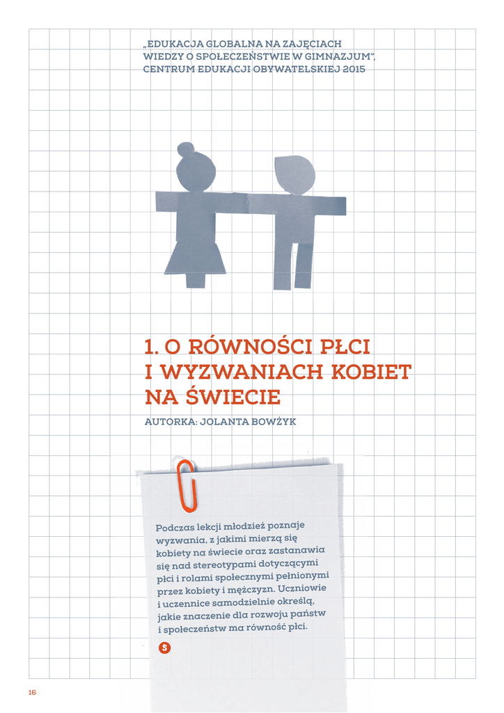 „EDUKACJA GLOBALNA NA ZAJĘCIACH WIEDZY O SPOŁECZEŃSTWIE W GIMNAZJUM”, CENTRUM EDUKACJI OBYWATELSKIEJ 2015 1. O RÓWNOŚCI PŁCI I WYZWANIACH KOBIET NA ŚWIECIE AUTORKA: JOLANTA BOWŻYK Podczas lekcji młodzież poznaje wyzwania, z jakimi mierzą się kobiety na świecie oraz zastanawia się nad stereotypami dotyczącymi płci i rolami społecznymi pełnionymi przez kobiety i mężczyzn. Uczniowie i uczennice samodzielnie określą, jakie znaczenie dla rozwoju państw i społeczeństw ma równość płci. s 16 1. O RÓWNOŚCI PŁCI I WYZWANIACH KOBIET NA ŚWIECIE Zagadnienia: Władza polityczna, demokracja i prawa człowieka Różnorodność i stosunki międzykulturowe Czas trwania: 45 minut Pytanie kluczowe: Z jakimi wyzwaniami mierzą się kobiety na świecie? Cele zajęć: Zastanowisz się nad stereotypami dotyczącymi płci oraz rolami społecznymi pełnionymi przez kobiety i mężczyzn. Wymienisz wyzwania, z jakimi mierzą się kobiety na świecie. Dowiesz się, jakie znaczenie ma równość płci i wzmacnianie roli kobiet w rozwoju państw i społeczeństw. Metody: Burza pomysłów Quiz Mini wykład Dyskusja Formy pracy: Praca w grupach Praca w parach Środki dydaktyczne i materiały: Załączniki Duże kartki z napisami „prawda” i „fałsz” Związek z podstawą programową: I, 2.4, 10.6 PRZEBIEG ZAJĘĆ: Wprowadzenie 0 5 5 11 6 15 4 1. Narysuj na tablicy schematyczne postacie – kobietę i mężczyznę – i zapytaj młodzież, jakie zna stereotypy na temat każdej z płci. Mogą to być zarówno przymiotniki (np. kobiety i dziewczęta są wrażliwe, delikatne, emocjonalne, a mężczyźni i chłopcy silni, agresywni, dominujący itp.), jak i określenie ról społecznych, w jakich występują (np. kobiety zajmują się domem, opiekują się dziećmi, a mężczyźni zarabiają na utrzymanie rodziny czy pełnią funkcje w życiu publicznym; dziewczęta lubią rozmawiać o kosmetykach, a chłopcy grać w piłkę itp.). Odpowiedzi zapisuj na tablicy. 2. Następnie zadaj pytanie, czy uczniowie i uczennice zgadzają się z zapisanymi stwierdzeniami. Czy sami/same też w taki sposób siebie postrzegają? Jakie konsekwencje dla obu płci może mieć takie stereotypowe, uproszczone postrzeganie kobiet i mężczyzn oraz ich roli w społeczeństwie? 3. Po przeprowadzeniu krótkiej dyskusji powiedz, czym charakteryzują się stereotypy i jakie są ich konsekwencje. Wyjaśnij także uwarunkowania kulturowe stereotypów oraz to, że podlegają one zmianom. Na zakończenie tej części możesz przekreślić oba rysunki na tablicy, aby symbolicznie dać wyraz niezgodzie na powielanie stereotypów. Praca właściwa Stereotypy są niekompletnymi, a często też błędnymi obrazami ludzi i zjawisk funkcjonujących w różnych kulturach. Stosujemy je, ponieważ ułatwiają nam radzenie sobie ze złożonymi kwestiami codziennego życia, ale brak świadomości ich istnienia i uznawanie ich za obiektywne fakty może być groźne. Konsekwencją stereotypów mogą być uprzedzenia (dokonywanie negatywnych ocen na podstawie stereotypów) i dyskryminacja (już nie ocena, ale podejmowanie działań wynikających z uprzedzeń). Sposób postrzegania płci oraz społeczne role kobiet i mężczyzn także są uwarunkowane kulturowo – inne są bowiem oczekiwania społeczne od obu płci w różnych częściach świata (np. w krajach Europy, Afryki czy Bliskiego Wschodu) oraz zmieniają się w czasie – współcześnie bowiem kobiety coraz częściej podejmują pracę zarobkową i pełnią funkcje publiczne, a mężczyźni z kolei zajmują się domem i opieką nad dziećmi. 4.Przeprowadź w klasie krótki quiz na temat sytuacji kobiet na świecie (załącznik nr 1). Po przeciw21 6 nych stronach sali powieś na ścianach dwie kartki: na jednej napisz „prawda”, a na drugiej „fałsz”. Odczytuj kolejne stwierdzenia i poproś, aby młodzież ustawiała się pod tą kartką, która zawiera prawidłową według nich odpowiedź. Na bieżąco podawaj poprawne odpowiedzi. Możesz również rozdać quiz młodzieży, prosząc o pracę indywidualną. Prawidłowe odpowiedzi: 1. F (70%) 2. P 1. O RÓWNOŚCI PŁCI I WYZWANIACH KOBIET NA ŚWIECIE 3. P 4. P 5. P 6. F (20%) 7. P 8. P 17 5. Następnie poproś, aby na podstawie pytań z quizu młodzież wymieniła obszary życia społeczne25 go, w jakich kobiety na świecie mierzą się z wyzwaniami (dostęp do edukacji, opieki medycznej, życia politycznego, gospodarczego/rynku pracy) lub uporządkuj wypowiedzi młodzieży, kategoryzując je w wymienione obszary i zapisując na tablicy. 4 6. Wyjaśnij, od jakich czynników uzależniona jest sytuacja kobiet w różnych regionach świata. 28 Sytuacja kobiet w różnych regionach świata uwarunkowana jest wieloma czynnikami, m. in.: poziomem rozwoju gospodarczego państwa, w którym żyją, stosunkami społecznymi, jakie w danym państwie funkcjonują, tradycją kulturową czy lokalnymi zwyczajami. Duże znaczenie odgrywa miejsce, z którego pochodzi kobieta (inaczej może wyglądać sytuacja kobiet w dużych ośrodkach miejskich i na wsiach, np. pod względem dostępu do edukacji, opieki medycznej czy rynku pracy), rodzina i środowisko, z jakiego się wywodzi, poziom wykształcenia itp. 3 Kobiety globalnego Południa, o których warto dowiedzieć się więcej: Aung San Suu Kyi, Szirin Ebadi, Wangari Maathai, Tawakkul Karman, Ellen Johnson-Sirleaf, Leymah Gbowee, Dilma Rousseff, Benazir Bhutto, Malala Yousafzai, Rania al-Abdullah. 7. Rozdaj młodzieży karty pracy – po jednej na parę (załącznik nr 2). Odczytaj cytat z książki „Rozwój i wolność”, w której autor – Amartya Sen, urodzony w Indiach laureat Nagrody Nobla z 1998 roku, zajmujący się ekonomią dobrobytu, napisał: 36 „(…) ograniczenie aktywnego uczestnictwa kobiet w różnych aspektach życia wspólnotowego ma konsekwencje, które rozciągają się na wszystkich: i na kobiety, i na mężczyzn, na dzieci i na dorosłych” 1. 8 Popro