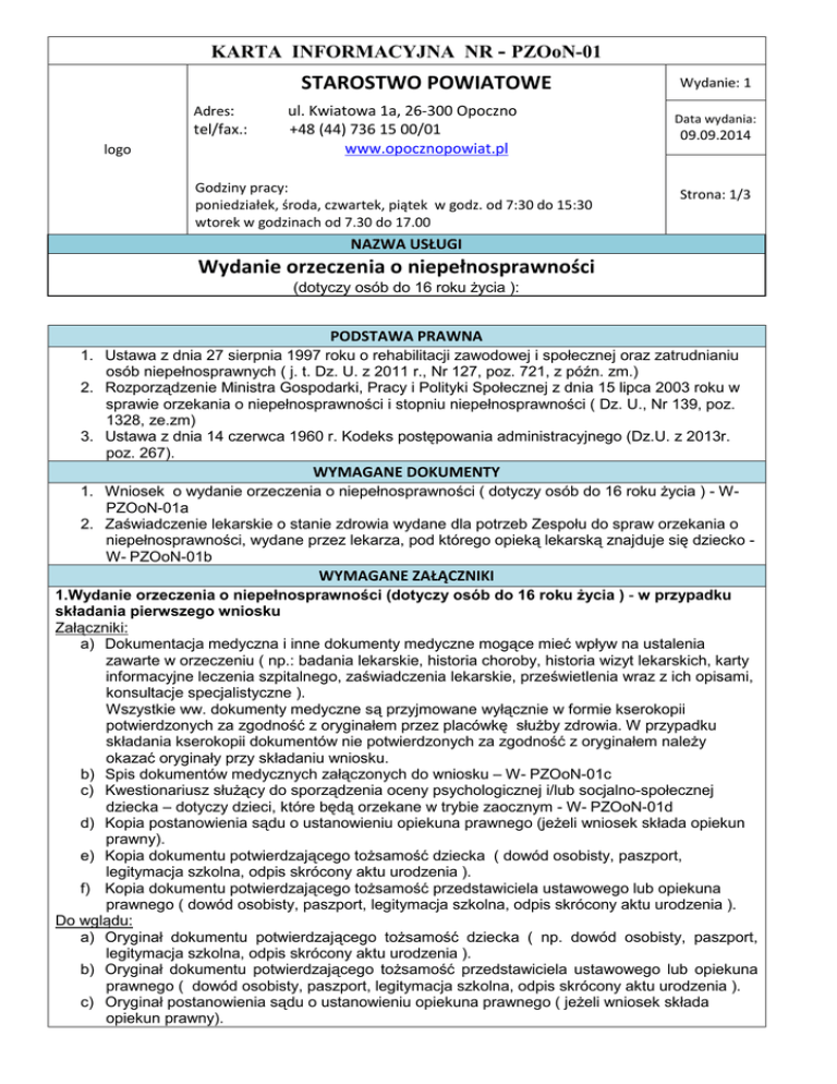 KARTA INFORMACYJNA NR - PZOoN-01 STAROSTWO POWIATOWE Adres: tel/fax.: logo ul. Kwiatowa 1a, 26-300 Opoczno +48 (44) 736 15 00/01 www.opocznopowiat.pl Godziny pracy: poniedziałek, środa, czwartek, piątek w godz. od 7:30 do 15:30 wtorek w godzinach od 7.30 do 17.00 Wydanie: 1 Data wydania: 09.09.2014 Strona: 1/3 NAZWA USŁUGI Wydanie orzeczenia o niepełnosprawności (dotyczy osób do 16 roku Ŝycia ): PODSTAWA PRAWNA 1. Ustawa z dnia 27 sierpnia 1997 roku o rehabilitacji zawodowej i społecznej oraz zatrudnianiu osób niepełnosprawnych ( j. t. Dz. U. z 2011 r., Nr 127, poz. 721, z późn. zm.) 2. Rozporządzenie Ministra Gospodarki, Pracy i Polityki Społecznej z dnia 15 lipca 2003 roku w sprawie orzekania o niepełnosprawności i stopniu niepełnosprawności ( Dz. U., Nr 139, poz. 1328, ze.zm) 3. Ustawa z dnia 14 czerwca 1960 r. Kodeks postępowania administracyjnego (Dz.U. z 2013r. poz. 267). WYMAGANE DOKUMENTY 1. Wniosek o wydanie orzeczenia o niepełnosprawności ( dotyczy osób do 16 roku Ŝycia ) - WPZOoN-01a 2. Zaświadczenie lekarskie o stanie zdrowia wydane dla potrzeb Zespołu do spraw orzekania o niepełnosprawności, wydane przez lekarza, pod którego opieką lekarską znajduje się dziecko W- PZOoN-01b WYMAGANE ZAŁĄCZNIKI 1.Wydanie orzeczenia o niepełnosprawności (dotyczy osób do 16 roku Ŝycia ) - w przypadku składania pierwszego wniosku Załączniki: a) Dokumentacja medyczna i inne dokumenty medyczne mogące mieć wpływ na ustalenia zawarte w orzeczeniu ( np.: badania lekarskie, historia choroby, historia wizyt lekarskich, karty informacyjne leczenia szpitalnego, zaświadczenia lekarskie, prześwietlenia wraz z ich opisami, konsultacje specjalistyczne ). Wszystkie ww. dokumenty medyczne są przyjmowane wyłącznie w formie kserokopii potwierdzonych za zgodność z oryginałem przez placówkę słuŜby zdrowia. W przypadku składania kserokopii dokumentów nie potwierdzonych za zgodność z oryginałem naleŜy okazać oryginały przy składaniu wniosku. b) Spis dokumentów medycznych załączonych do wniosku – W- PZOoN-01c c) Kwestionariusz słuŜący do sporządzenia oceny psychologicznej i/lub socjalno-społecznej dziecka – dotyczy dzieci, które będą orzekane w trybie zaocznym - W- PZOoN-01d d) Kopia postanowienia sądu o ustanowieniu opiekuna prawnego (jeŜeli wniosek składa opiekun prawny). e) Kopia dokumentu potwierdzającego toŜsamość dziecka ( dowód osobisty, paszport, legitymacja szkolna, odpis skrócony aktu urodzenia ). f) Kopia dokumentu potwierdzającego toŜsamość przedstawiciela ustawowego lub opiekuna prawnego ( dowód osobisty, paszport, legitymacja szkolna, odpis skrócony aktu urodzenia ). Do wglądu: a) Oryginał dokumentu potwierdzającego toŜsamość dziecka ( np. dowód osobisty, paszport, legitymacja szkolna, odpis skrócony aktu urodzenia ). b) Oryginał dokumentu potwierdzającego toŜsamość przedstawiciela ustawowego lub opiekuna prawnego ( dowód osobisty, paszport, legitymacja szkolna, odpis skrócony aktu urodzenia ). c) Oryginał postanowienia sądu o ustanowieniu opiekuna prawnego ( jeŜeli wniosek składa opiekun prawny). 2.Wydanie orzeczenia dokumentującego niepełnosprawność (dotyczy osób do 16 roku Ŝycia ) - w przypadku składania kolejnego wniosku Załączniki: a) Dokumentacja medyczna i inne dokumenty medyczne mogące mieć wpływ na ustalenia zawarte w orzeczeniu ( np.: badania lekarskie, historia choroby, historia wizyt lekarskich, karty informacyjne leczenia szpitalnego, zaświadczenia lekarskie, prześwietlenia wraz z ich opisami, konsultacje specjalistyczne ). NaleŜy dołączyć dokumentację medyczną od daty ostatniego wyznaczonego posiedzenia komisji lekarskiej do dnia złoŜenia wniosku. Wszystkie ww. dokumenty medyczne są przyjmowane wyłącznie w formie kserokopii potwierdzonych za zgodność z oryginałem przez placówkę słuŜby zdrowia. W przypadku składania kserokopii dokumentów nie potwierdzonych za zgodność z oryginałem naleŜy okazać oryginały przy składaniu wniosku. b) Spis dokumentów medycznych załączonych do wniosku – W- PZOoN-01c c) Kwestionariusz słuŜący do sporządzenia oceny psychologicznej i/lub socjalno-społecznej dziecka – dotyczy dzieci, które będą orzekane w trybie zaocznym - W- PZOoN-01d d) Kopia postanowienia sądu o ustanowieniu opiekuna prawnego (jeŜeli wniosek składa opiekun prawny). e) Kopia dokumentu potwierdzającego toŜsamość dziecka ( dowód osobisty, paszport, legitymacja szkolna, odpis skrócony aktu urodzenia ). f) Kopia dokumentu potwierdzającego toŜsamość przedstawiciela ustawowego lub opiekuna prawnego ( dowód osobisty, paszport, legitymacja szkolna, odpis skrócony aktu urodzenia ). Do wglądu: a) Oryginał dokumentu potwierdzającego toŜsamość dziecka ( np. dowód osobisty, paszport, legitymacja szkolna, odpis skrócony aktu urodzenia ). b) Oryginał dokumentu potwierdzającego toŜsamość przedstawiciela ustawowego lub opiekuna prawnego ( dowód osobisty, paszport, legitymacja szkolna, odpis skrócony aktu urodzenia ). c) Oryginał postanowienia sądu o ustanowieniu opiekuna prawnego ( jeŜeli wniosek składa opiekun prawny) FORMULARZE DO POBRANIA 1. Druk Wniosku: W- PZOoN-01a 2. Druk zaświadczenia lekarskiego: W- PZOoN-01b 3. Druk - Spis dokumentów medycznych: W- PZOoN-01c 4. Druk - Kwestionariusz: W- PZOoN-01d w wersji papierowej dostępny w Pokoju nr 6 lub do pobrania na stronie internetowej Starostwa: www.opocznopowiat.pl w zakładce: Poradnik Interesanta OPŁATY Nie podlega opłacie. MIEJSCE ZŁOŻENIA WNIOSKU Starostwo Powiatowe w Opocznie, ul. Kwiatowa 1a, 26-300 Opoczno, parter, Pokój nr 6. MIEJSCE ZAŁATWIENIA SPRAWY Powiatowy Zespół do Spraw Orzekania o Niepełnosprawności w Opocznie, Pokój nr 6, Tel. (44) 736 15 09, wew. 105, Anna Jakóbczyk, Natalia Marusik, mail.: [email protected] TERMIN ZAŁATWIENIA SPRAWY Niezwłocznie, nie później niŜ w ciągu 30 dni, a w przypadku sprawy szczególnie skomplik