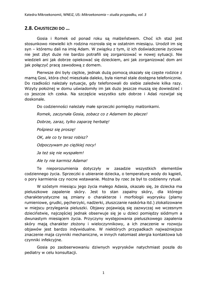 Katedra Mikroekonomii, WNEiZ, US: Mikroekonomia – studia przypadku, vol. 3 2.8. CHUSTECZKI DO … Gosia i Romek od ponad roku są małżeństwem. Choć ich staż jest stosunkowo niewielki ich rodzina rozrosła się w ostatnim miesiącu. Urodził im się syn – któremu dali na imię Adam. W związku z tym, iż ich doświadczenie życiowe nie jest zbyt duże nie bardzo potrafili się zorganizować w nowej sytuacji. Nie wiedzieli ani jak dobrze opiekować się dzieckiem, ani jak zorganizować dom ani jak połączyć pracę zawodową z domem. Pierwsze dni były ciężkie, jednak dużą pomocą okazały się częste rodzice z mamą Gosi, która choć mieszkała daleko, była niemal stale dostępna telefonicznie. Do rzadkości należały sytuacje, gdy telefonowali do siebie zaledwie kilka razy. Wizyty położnej w domu uświadomiły im jak dużo jeszcze muszą się dowiedzieć i co jeszcze ich czeka. Na szczęście wszystko szło dobrze i Adaś rozwijał się doskonale. Do codzienności należały małe sprzeczki pomiędzy małżonkami. Romek, zaczynała Gosia, zobacz co z Adamem bo płacze! Dobrze, zaraz, tylko zaparzę herbatę! Pośpiesz się proszę! OK, ale co ty teraz robisz? Odpoczywam po ciężkiej nocy! Ja też się nie wyspałem! Ale ty nie karmisz Adama! Te nieporozumienia dotyczyły w zasadzie wszystkich elementów codziennego życia. Sprzeczki o ubieranie dziecka, o temperaturę wody do kąpieli, o pory karmienia czy nocne wstawanie. Można by rzec że był to codzienny rytuał. W szóstym miesiącu jego życia małego Adasia, okazało się, że dziecka ma pieluszkowe zapalenie skóry. Jest to stan zapalny skóry, dla którego charakterystyczne są zmiany o charakterze i morfologii wyprysku (plamy rumieniowe, grudki, pęcherzyki, nadżerki, złuszczanie naskórka itd.) zlokalizowane w miejscu przylegania pieluszki. Objawy pojawiają się zazwyczaj we wczesnym dzieciństwie, najczęściej jednak obserwuje się je u dzieci pomiędzy siódmym a dwunastym miesiącem życia. Przyczyny występowania pieluszkowego zapalenia skóry mają charakter złożony i wieloczynnikowy, a ich znaczenie w rozwoju objawów jest bardzo indywidualne. W niektórych przypadkach najważniejsze znaczenie maja czynniki mechaniczne, w innych natomiast alergia kontaktowa lub czynniki infekcyjne. Gosia po zaobserwowaniu dziwnych wyprysków natychmiast poszła do pediatry w celu konsultacji. 1 Katedra Mikroekonomii, WNEiZ, US: Mikroekonomia – studia przypadku, vol. 3 Pani Doktor, rozpoczęła po wejściu do gabinetu –mój synek ma dziwną wysypkę! Proszę to pokazać, odpowiedziała lekarka. Po obejrzeniu dziecka, lekarka stwierdziła: to jest pieluszkowe zapalenie skóry. Objawia się właśnie w ten sposób. Czy to znaczy że coś źle robimy? Niewłaściwie myjemy dziecko? Z rozpaczą zapytała Gosia. Niekoniecznie, przyczyny są często niezależne od nas. Czasem jednak wynikają z niewłaściwie stosowanej higieny dzieci, alergii czy zbyt ciasno założonych pieluszek. Dobrze, że Pani przyszła tak szybko po zauważeniu tych objawów. Zastosujemy delikatne leczenie przeciwzapalne. Bardzo proszę zastanowić się jeszcze nad ewentualną zmianą pieluszek i nabyciem nawilżających chusteczek do pielęgnacji skóry niemowląt. To powinno też pomóc zarówno w leczeniu, jak i dalszej profilaktyce. Gosia po powrocie do domu przekazała zalecenie lekarza Romkowi. Roman, lekarz kazał zmienić pieluszki i używać chusteczek nawilżających dla Adasia. A co, te których używamy są złe? Kosztują przecież niemałe pieniądze! No wiem, ale mogą powodować właśnie to zapalenie. Rozumiem, ale pamiętasz gdy zastanawialiśmy się nad ich wyborem? Rozpatrywaliśmy dwa warianty: Pampersy i nasze lokalne Bella Baby Happy. Na początku, przed porodem z porównania wychodziło, że Happy Bella są w cenie około 40 gr / szt., zaś Pampersy po 50gr/szt. I dlatego zdecydowaliśmy się na początku na Pampersy, które co prawda były droższe ale uznaliśmy że nas jest na nie stać. Jednak po przyjściu na świat Adama, gdy zobaczyliśmy, że dziennie potrzebujemy około 15 pieluszek a gdy okazało się że ich cena wzrosła o 5 groszy, zdecydowaliśmy, że… Że przerzucamy się jednak na tańsze. Zużycie ich nam co prawda wzrosło do 18 sztuk dziennie. Wychodzi nam na to samo w kwocie wydawanej na pieluchy .Czyli, że zmieniamy je teraz na Pampersy zgodnie z zaleceniem lekarza? Musimy się nad tym zastanowić. Lekarka tylko to sugerowała. Pytanie jest raczej, co robimy z chusteczkami. Do tej pory używałam wyłącznie miękkiego papieru toaletowego i przemywania dziecka. Ile kosztują takie chusteczki? Sprawdzałem poprzednio w sklepie internetowym i okazuje się, że przeznaczone dla dziecka w naszym wieku to wydatek rzędu 10 zł za opakowanie 80 chusteczek. Obecnie ich cena wzrosła do 11 zł. Wydaje mi się, że gdybyśmy zakupili te chusteczki, nie będziemy musieli kupować tyle tego pachnącego 2 Katedra Mikroekonomii, WNEiZ, US: Mikroekonomia – studia przypadku, vol. 3 rumiankiem papieru toaletowego. Teraz potrzeba było nam na nasze potrzeby 4 paczki miesięcznie. Gdy będziemy używać chusteczek, to zmniejszymy ich zużycie do 3 paczek. Tak, tak, mój Ty ekonomisto, wszystko przeliczasz na pieniądze. I dlatego mamy tak dobrze. PYTANIA 1. Określ który/które z determinantów popytu oddziaływają na rodzinę konsumentów, w przypadku urodzenia się dziecka. 2. Ustal bez obliczania, jedynie posługując się koncepcją dóbr substytucyjnych i komplementarnych czy oba produkty omawiane w studium przypadku są wobec siebie substytucyjne czy komplementarne? 3. Policz wskaźnik elastyczności mieszanej popytu dla pieluszek i dla chusteczek/papieru toaletowego. Podaj interpretację. 4. Podaj inne pary dóbr substytucyjnych i komplementarnych dla produktów używanych przy małych dzieciach. Czy są wśród nich takie, które mogą być traktowane zarówno jako substytucyjne jak i komplementar