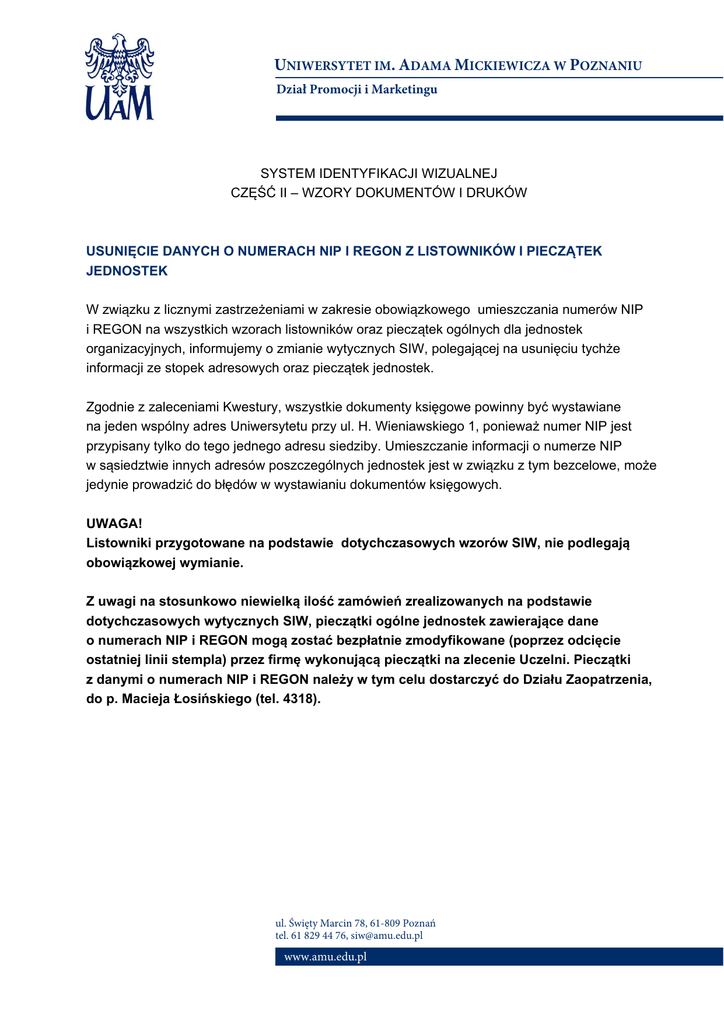 UNIWERSYTET IM. ADAMA MICKIEWICZA W POZNANIU Dział Promocji i Marketingu SYSTEM IDENTYFIKACJI WIZUALNEJ CZĘŚĆ II – WZORY DOKUMENTÓW I DRUKÓW USUNIĘCIE DANYCH O NUMERACH NIP I REGON Z LISTOWNIKÓW I PIECZĄTEK JEDNOSTEK W związku z licznymi zastrzeżeniami w zakresie obowiązkowego umieszczania numerów NIP i REGON na wszystkich wzorach listowników oraz pieczątek ogólnych dla jednostek organizacyjnych, informujemy o zmianie wytycznych SIW, polegającej na usunięciu tychże informacji ze stopek adresowych oraz pieczątek jednostek. Zgodnie z zaleceniami Kwestury, wszystkie dokumenty księgowe powinny być wystawiane na jeden wspólny adres Uniwersytetu przy ul. H. Wieniawskiego 1, ponieważ numer NIP jest przypisany tylko do tego jednego adresu siedziby. Umieszczanie informacji o numerze NIP w sąsiedztwie innych adresów poszczególnych jednostek jest w związku z tym bezcelowe, może jedynie prowadzić do błędów w wystawianiu dokumentów księgowych. UWAGA! Listowniki przygotowane na podstawie dotychczasowych wzorów SIW, nie podlegają obowiązkowej wymianie. Z uwagi na stosunkowo niewielką ilość zamówień zrealizowanych na podstawie dotychczasowych wytycznych SIW, pieczątki ogólne jednostek zawierające dane o numerach NIP i REGON mogą zostać bezpłatnie zmodyfikowane (poprzez odcięcie ostatniej linii stempla) przez firmę wykonującą pieczątki na zlecenie Uczelni. Pieczątki z danymi o numerach NIP i REGON należy w tym celu dostarczyć do Działu Zaopatrzenia, do p. Macieja Łosińskiego (tel. 4318). ul. Święty Marcin 78, 61-809 Poznań tel. 61 829 44 76, [email protected] www.amu.edu.pl