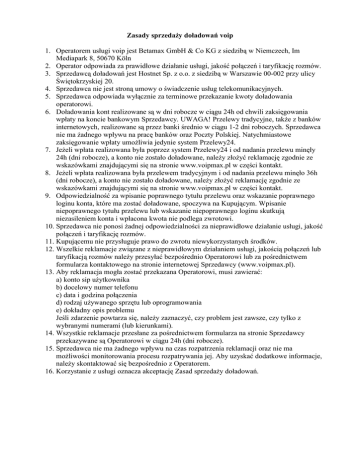 Zasady sprzedaŜy doładowań voip 1. Operatorem usługi voip jest Betamax GmbH & Co KG z siedzibą w Niemczech, Im Mediapark 8, 50670 Köln 2. Operator odpowiada za prawidłowe działanie usługi, jakość połączeń i taryfikację rozmów. 3. Sprzedawcą doładowań jest Hostnet Sp. z o.o. z siedzibą w Warszawie 00-002 przy ulicy Świętokrzyskiej 20. 4. Sprzedawca nie jest stroną umowy o świadczenie usług telekomunikacyjnych. 5. Sprzedawca odpowiada wyłącznie za terminowe przekazanie kwoty doładowania operatorowi. 6. Doładowania kont realizowane są w dni robocze w ciągu 24h od chwili zaksięgowania wpłaty na koncie bankowym Sprzedawcy. UWAGA! Przelewy tradycyjne, takŜe z banków internetowych, realizowane są przez banki średnio w ciągu 1-2 dni roboczych. Sprzedawca nie ma Ŝadnego wpływu na pracę banków oraz Poczty Polskiej. Natychmiastowe zaksięgowanie wpłaty umoŜliwia jedynie system Przelewy24. 7. JeŜeli wpłata realizowana była poprzez system Przelewy24 i od nadania przelewu minęły 24h (dni robocze), a konto nie zostało doładowane, naleŜy złoŜyć reklamację zgodnie ze wskazówkami znajdującymi się na stronie www.voipmax.pl w części kontakt. 8. JeŜeli wpłata realizowana była przelewem tradycyjnym i od nadania przelewu minęło 36h (dni robocze), a konto nie zostało doładowane, naleŜy złoŜyć reklamację zgodnie ze wskazówkami znajdującymi się na stronie www.voipmax.pl w części kontakt. 9. Odpowiedzialność za wpisanie poprawnego tytułu przelewu oraz wskazanie poprawnego loginu konta, które ma zostać doładowane, spoczywa na Kupującym. Wpisanie niepoprawnego tytułu przelewu lub wskazanie niepoprawnego loginu skutkują niezasileniem konta i wpłacona kwota nie podlega zwrotowi. 10. Sprzedawca nie ponosi Ŝadnej odpowiedzialności za nieprawidłowe działanie usługi, jakość połączeń i taryfikację rozmów. 11. Kupującemu nie przysługuje prawo do zwrotu niewykorzystanych środków. 12. Wszelkie reklamacje związane z nieprawidłowym działaniem usługi, jakością połączeń lub taryfikacją rozmów naleŜy przesyłać bezpośrednio Operatorowi lub za pośrednictwem formularza kontaktowego na stronie internetowej Sprzedawcy (www.voipmax.pl). 13. Aby reklamacja mogła zostać przekazana Operatorowi, musi zawierać: a) konto sip uŜytkownika b) docelowy numer telefonu c) data i godzina połączenia d) rodzaj uŜywanego sprzętu lub oprogramowania e) dokładny opis problemu Jeśli zdarzenie powtarza się, naleŜy zaznaczyć, czy problem jest zawsze, czy tylko z wybranymi numerami (lub kierunkami). 14. Wszystkie reklamacje przesłane za pośrednictwem formularza na stronie Sprzedawcy przekazywane są Operatorowi w ciągu 24h (dni robocze). 15. Sprzedawca nie ma Ŝadnego wpływu na czas rozpatrzenia reklamacji oraz nie ma moŜliwości monitorowania procesu rozpatrywania jej. Aby uzyskać dodatkowe informacje, naleŜy skontaktować się bezpośrednio z Operatorem. 16. Korzystanie z usługi oznacza akceptację Zasad sprzedaŜy doładowań.