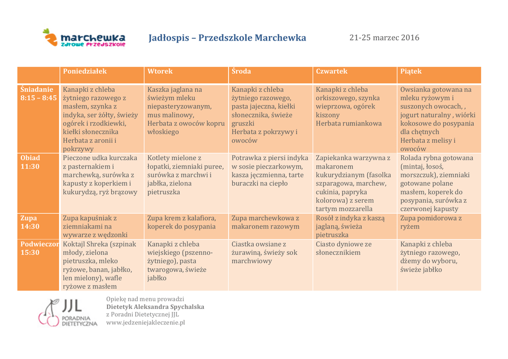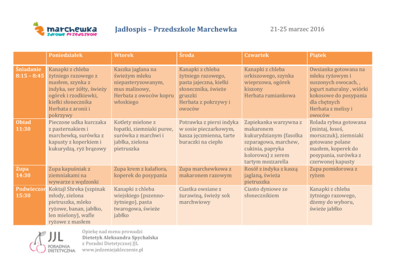 Jadłospis–PrzedszkoleMarchewka 21-25marzec2016 Poniedziałek Wtorek Środa Śniadanie Kanapkizchleba 8:15–8:45 żytniegorazowegoz masłem,szynkaz indyka,serżółty,świeży ogórekirzodkiewki, kiełkisłonecznika Herbatazaroniii pokrzywy Obiad Pieczoneudkakurczaka 11:30 zpasternakiemi marchewką,surówkaz kapustyzkoperkiemi kukurydzą,ryżbrązowy Kaszkajaglanana świeżymmleku niepasteryzowanym, musmalinowy, Herbatazowocówkopru włoskiego Zupa 14:30 Zupakremzkalafiora, koperekdoposypania Zupamarchewkowaz makaronemrazowym Kanapkizchleba wiejskiego(pszennożytniego),pasta twarogowa,świeże jabłko Ciastkaowsianez żurawiną,świeżysok marchwiowy Zupakapuśniakz ziemniakamina wywarzezwędzonki Podwieczorek KoktajlShreka(szpinak 15:30 młody,zielona pietruszka,mleko ryżowe,banan,jabłko, lenmielony),wafle ryżowezmasłem Kanapkizchleba żytniegorazowego, pastajajeczna,kiełki słonecznika,świeże gruszki Herbatazpokrzywyi owoców Kotletymielonez Potrawkazpiersiindyka łopatki,ziemniakipuree, wsosiepieczarkowym, surówkazmarchwii kaszajęczmienna,tarte jabłka,zielona buraczkinaciepło pietruszka Opiekęnadmenuprowadzi DietetykAleksandraSpychalska zPoradniDietetycznejJJL www.jedzeniejakleczenie.pl Czwartek Piątek Kanapkizchleba orkiszowego,szynka wieprzowa,ogórek kiszony Herbatarumiankowa Owsiankagotowanana mlekuryżowymi suszonychowocach,, jogurtnaturalny,wiórki kokosowedoposypania dlachętnych Herbatazmelisyi owoców Roladarybnagotowana (mintaj,łosoś, morszczuk),ziemniaki gotowanepolane masłem,koperekdo posypania,surówkaz czerwonejkapusty Zupapomidorowaz ryżem Zapiekankawarzywnaz makaronem kukurydzianym(fasolka szparagowa,marchew, cukinia,papryka kolorowa)zserem tartymmozzarella Rosółzindykazkaszą jaglaną,świeża pietruszka Ciastodynioweze słonecznikiem Kanapkizchleba żytniegorazowego, dżemydowyboru, świeżejabłko