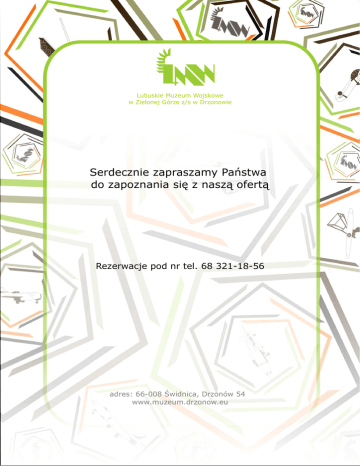 Lubuskie Muzeum Wojskowe w Zielonej Górze z/s w Drzonowie Serdecznie zapraszamy Państwa do zapoznania się z naszą ofertą Rezerwacje pod nr tel. 68 321-18-56 adres: 66-008 Świdnica, Drzonów 54 www.muzeum.drzonow.eu OFERTA EDUKACYJNA: W ofercie: – – – – zwiedzanie z przewodnikiem ekspozycji w pałacu, zwiedzanie ekspozycji w pawilonie i na terenie parku, zwiedzanie wnętrz: samolotu myśliwskiego, transportera opancerzonego, czołgu, pogadanka na temat historii wybranych eksponatów ciężkiego sprzętu wojskowego. Czas trwania wizyty: Cena: ok. 1 godziny 9 zł/osoba Grupa: min 20 osób Opcje dodatkowe /za dodatkową opłatą/: – – przejażdżka zabytkowym transporterem opancerzonym BTR-152, organizacja ogniska na terenie parku muzealnego. *** /Oferta skierowana do grup najmłodszych (przedszkole, klasy 1-3) jak i do grup starszych (klasy 4-6). Przed zwiedzaniem ekspozycji dzieci biorą udział w warsztatach plastycznych, uwrażliwiających je na tematy związane z istotą kamuflażu. Próby stworzenia kamuflażu do określonej przestrzeni z elementami techniki malowania twarzy/ W ofercie: – – – zwiedzanie z przewodnikiem ekspozycji w pałacu, zwiedzanie ekspozycji w pawilonie i na terenie parku, warsztaty plastyczne: „Znaczenie kamuflażu”. Czas trwania wizyty: Cena: ok. 1, 30 godziny 9 zł/osoba Grupa: min 20 osób Opcje dodatkowe /za dodatkową opłatą/: – – przejażdżka zabytkowym transporterem opancerzonym BTR-152, organizacja ogniska na terenie parku muzealnego. *** /Wyjątkowy pokaz walk i obyczajów rycerskich z udziałem członków Kręgu Rycerskiego z Nowej Soli. Miniturniej rycerski w wykonaniu dwóch rycerzy oraz towarzyszących im giermków. Rycerze zachęcają publiczność do wspólnej zabawy. Uczestnicy mają okazję zapoznać się z kopiami średniowiecznej broni oraz uzbrojenia ochronnego ( np. hełmy rycerskie)/ W ofercie: – – – zwiedzanie muzealnej ekspozycji w pałacu, w pawilonie oraz na terenie parku, pokaz walk i obyczajów rycerskich, możliwość zwiedzania wnętrz: samolotu myśliwskiego, transportera opancerzonego, czołgu, Czas trwania wizyty: Cena: ok. 2 godziny 15zł/osoba Grupa: min 40 osób Opcje dodatkowe /za dodatkową opłatą/: – – przejażdżka zabytkowym transporterem opancerzonym BTR-152, organizacja ogniska na terenie parku muzealnego. *** /Przewodnikiem po obyczajach rycerskich będzie członek Kręgu Rycerskiego z Nowej Soli, odziany w pełną zbroję! Przewidujemy pogadankę na temat roli rycerz w Średniowieczu, uzbrojenia rycerskiego oraz taktyki i techniki bojowej./ W ofercie: – – – zwiedzanie muzealnej ekspozycji w pałacu, w pawilonie oraz na terenie parku, Prezentacja „ Moje spotkanie z Rycerzem”, możliwość zwiedzania wnętrz: samolotu myśliwskiego, transportera opancerzonego, czołgu, Czas trwania wizyty: ok. 2 godziny Cena: 12zł/osoba Grupa : min 40 osób Opcje dodatkowe /za dodatkową opłatą/: – – przejażdżka zabytkowym transporterem opancerzonym BTR-152, organizacja ogniska na terenie parku muzealnego. ***