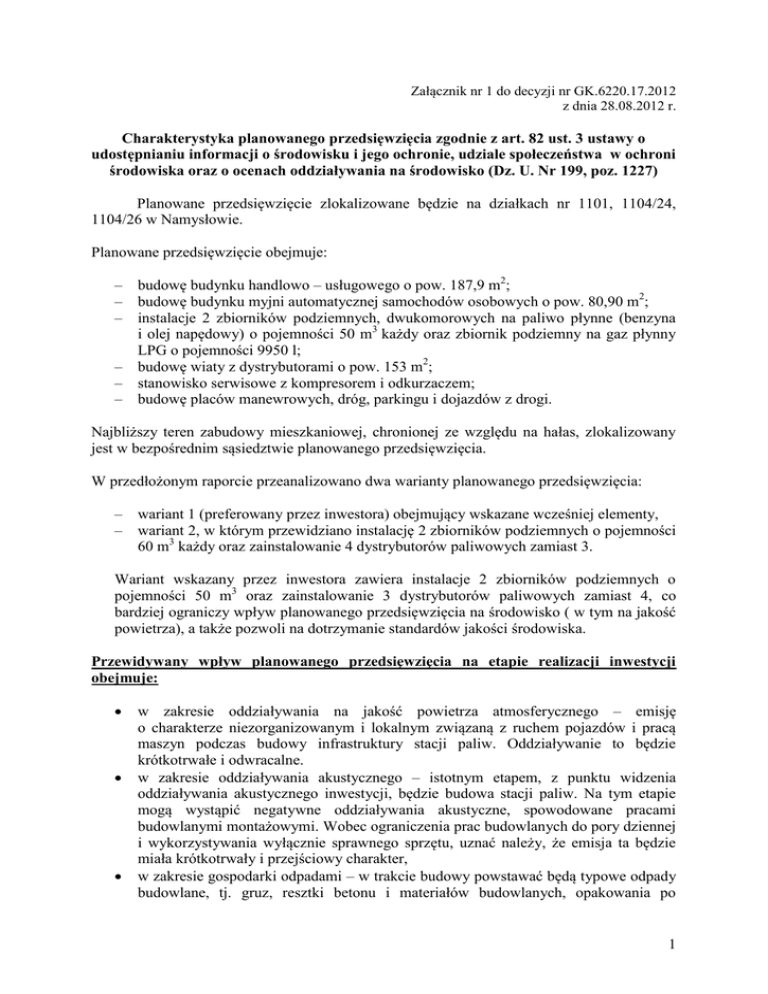 Załącznik nr 1 do decyzji nr GK.6220.17.2012 z dnia 28.08.2012 r. Charakterystyka planowanego przedsięwzięcia zgodnie z art. 82 ust. 3 ustawy o udostępnianiu informacji o środowisku i jego ochronie, udziale społeczeństwa w ochroni środowiska oraz o ocenach oddziaływania na środowisko (Dz. U. Nr 199, poz. 1227) Planowane przedsięwzięcie zlokalizowane będzie na działkach nr 1101, 1104/24, 1104/26 w Namysłowie. Planowane przedsięwzięcie obejmuje: – budowę budynku handlowo – usługowego o pow. 187,9 m2; – budowę budynku myjni automatycznej samochodów osobowych o pow. 80,90 m2; – instalacje 2 zbiorników podziemnych, dwukomorowych na paliwo płynne (benzyna i olej napędowy) o pojemności 50 m3 każdy oraz zbiornik podziemny na gaz płynny LPG o pojemności 9950 l; – budowę wiaty z dystrybutorami o pow. 153 m2; – stanowisko serwisowe z kompresorem i odkurzaczem; – budowę placów manewrowych, dróg, parkingu i dojazdów z drogi. Najbliższy teren zabudowy mieszkaniowej, chronionej ze względu na hałas, zlokalizowany jest w bezpośrednim sąsiedztwie planowanego przedsięwzięcia. W przedłożonym raporcie przeanalizowano dwa warianty planowanego przedsięwzięcia: – wariant 1 (preferowany przez inwestora) obejmujący wskazane wcześniej elementy, – wariant 2, w którym przewidziano instalację 2 zbiorników podziemnych o pojemności 60 m3 każdy oraz zainstalowanie 4 dystrybutorów paliwowych zamiast 3. Wariant wskazany przez inwestora zawiera instalacje 2 zbiorników podziemnych o pojemności 50 m3 oraz zainstalowanie 3 dystrybutorów paliwowych zamiast 4, co bardziej ograniczy wpływ planowanego przedsięwzięcia na środowisko ( w tym na jakość powietrza), a także pozwoli na dotrzymanie standardów jakości środowiska. Przewidywany wpływ planowanego przedsięwzięcia na etapie realizacji inwestycji obejmuje: w zakresie oddziaływania na jakość powietrza atmosferycznego – emisję o charakterze niezorganizowanym i lokalnym związaną z ruchem pojazdów i pracą maszyn podczas budowy infrastruktury stacji paliw. Oddziaływanie to będzie krótkotrwałe i odwracalne. w zakresie oddziaływania akustycznego – istotnym etapem, z punktu widzenia oddziaływania akustycznego inwestycji, będzie budowa stacji paliw. Na tym etapie mogą wystąpić negatywne oddziaływania akustyczne, spowodowane pracami budowlanymi montażowymi. Wobec ograniczenia prac budowlanych do pory dziennej i wykorzystywania wyłącznie sprawnego sprzętu, uznać należy, że emisja ta będzie miała krótkotrwały i przejściowy charakter, w zakresie gospodarki odpadami – w trakcie budowy powstawać będą typowe odpady budowlane, tj. gruz, resztki betonu i materiałów budowlanych, opakowania po 1 materiałach budowlanych, farbach, itp.. Odpady te, będą magazynowane w sposób selektywny, w odpowiednio oznakowanych pojemnikach, a następnie będą przekazywane zewnętrznym odbiorcom posiadającym stosowne zezwolenia, w zakresie oddziaływania na grunty i wody podziemne – negatywny wpływ na powierzchnie ziemi związany przede wszystkim z robotami budowlanymi, tj. pracami ziemnymi, polegającymi na zebraniu warstwy gleby, niwelacji terenu, wykonaniem wykopów zwłaszcza na potrzeby posadowienia podziemnych zbiorników paliw, instalacji paliwowej oraz dróg dojazdowych, magazynowaniem materiałów budowlanych, poruszaniem się ciężkich pojazdów i maszyn po terenie inwestycji, powstaniem ewentualnych drobnych awarii, podczas których może dojść do bezpośredniego zanieczyszczenia gruntu substancjami ropopochodnymi. Przewidywany wpływ planowanego przedsięwzięcia na etapie eksploatacji inwestycji: W zakresie powietrza atmosferycznego, Źródłami emisji do powietrza na etapie funkcjonowania stacji paliw będą: – – – – – – napełnianie zbiornika magazynowego paliw, magazynowanie benzyny, tankowanie benzyny do baków pojazdów, napełnianie zbiornika magazynowego na LPG oraz tankowanie pojazdów LPG, spalanie oleju opałowego w kotłowni (kocioł grzewczy o mocy 50 kW), ruch pojazdów samochodowych po wewnętrznych drogach dojazdowych i miejscach postojowych w granicach opracowania. W celu zmniejszenia uciążliwości związanej emisją zanieczyszczeń do powietrza atmosferycznego przewidziano: – – – dostarczanie paliwa autocysternami i przeładowywanie benzyn do podziemnego przy zastosowaniu pętli gazowej, w sposób eliminujący powietrza, zastosowanie nowoczesnych dystrybutorów posiadających system oparów podczas tankowania pojazdów, zastosowanie odpowietrzeń zbiornika podziemnego. Przewód lub oddechowe będą wprowadzane na wysokość min. 4 m. n. p. t. zbiornika emisje do odsysania przewody Z przeprowadzonych obliczeń rozprzestrzeniania się substancji w powietrzu wynika, że w otoczeniu planowanego przedsięwzięcia nie wystąpią przekroczenia wartości dopuszczalnych ani wartości odniesienia substancji, które będą wprowadzane do powietrza. W zakresie oddziaływania akustycznego, Zgodnie ze zmianą miejscowego planu zagospodarowania przestrzennego, przyjętym Uchwałą nr XXXIII/321/09 Rady Miejskiej w Namysłowie z dnia 10 grudnia 2009 r. najbliższe tereny prawnie chronione przed hałasem t.j. tereny zabudowy mieszkaniowo – usługowej, zlokalizowane są w bezpośrednim sąsiedztwie granicy własności stacji paliw w kierunku zachodnim. 2 Źródłem emisji hałasu do środowiska z eksploatacji planowanego przedsięwzięcia będzie projektowana stacja paliw z myjnią oraz wielofunkcyjnym urządzeniem (kompresor odkurzacz). Istotny wpływ na klimat akustyczny będzie miała ilość przyjeżdżających pojazdów samochodowych na teren stacji. Z obliczeń propagacji hałasu w środowisku z eksploatacji przedmiotowego przedsięwzięcia, przeprowadzonych dla pory dziennej wynika, że przy konkretnych założeniach, zwartych w raporcie o oddziaływaniu na środowisko, tj. zaprojektowanym ekranie akustycznym o wysokości 2,5 m i długo