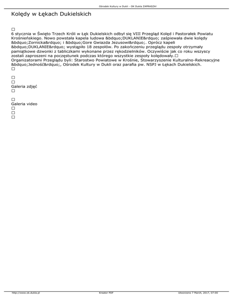 Ośrodek Kultury w Dukli - OK Dukla ZAPRASZA! Kolędy w Łękach Dukielskich 6 stycznia w Święto Trzech Króli w Łęk Dukielskich odbył się VIII Przegląd Kolęd i Pastorałek Powiatu Krośnieńskiego. Nowo powstała kapela ludowa „DUKLANIE” zaśpiewała dwie kolędy „Zornicka” i „Gore Gwiazda Jezusowi”. Oprócz kapeli „DUKLANIE” wystąpiło 18 zespołów. Po zakończeniu przeglądu zespoły otrzymały pamiątkowe dzwonki z tabliczkami wykonane przez rękodzielników. Oczywiście jak co roku wszyscy zostali zaproszeni na poczęstunek podczas którego wszystkie zespoły kolędowały. Organizatorami Przeglądu byli: Starostwo Powiatowe w Krośnie, Stowarzyszenie Kulturalno-Rekreacyjne „Jedność”, Ośrodek Kultury w Dukli oraz parafia pw. NSPJ w Łękach Dukielskich. Galeria zdjęć Galeria video http://www.ok.dukla.pl Kreator PDF Utworzono 7 March, 2017, 07:00