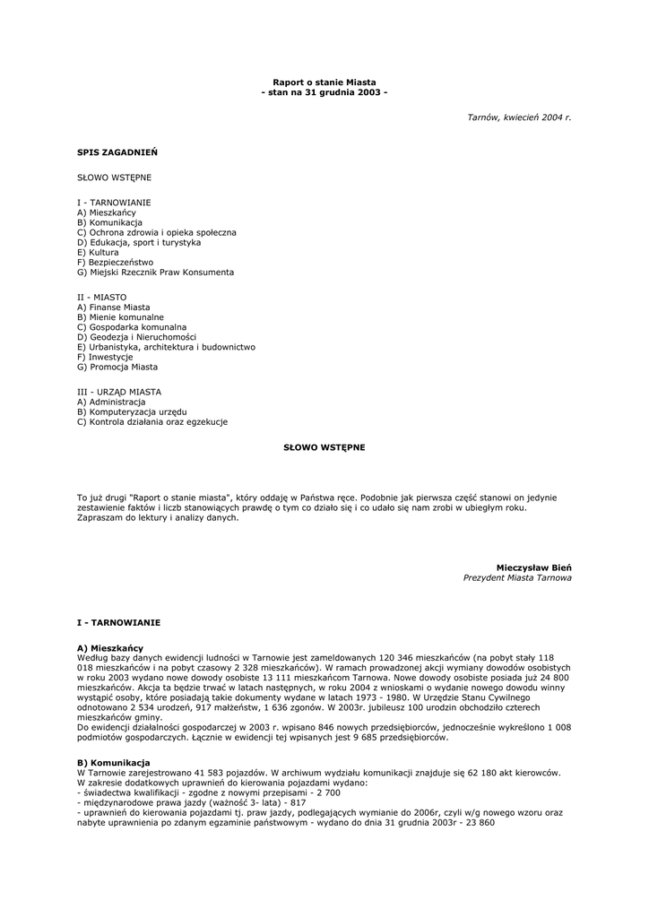 Raport o stanie Miasta - stan na 31 grudnia 2003